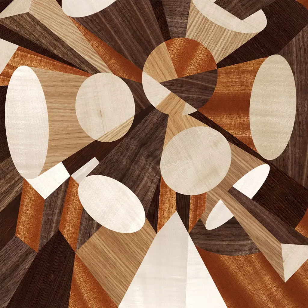 This coffee table features an abstract, three-dimensional design made from Rosewood inlays that renders the idea of a veritable explosion of geometric shapes that complement each other, creating a hypnotic effect. The frame rests on brushed brass feet, and the finish is glossy varnish.