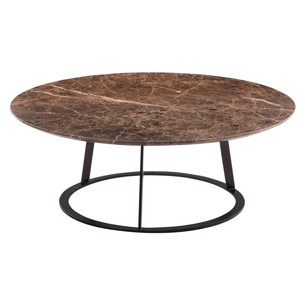 Essenza Coffee Table features a round top in luxurious Dark Emperador marble, known for its rich, deep tones and natural veining. The sleek, lightweight frame is crafted from high-quality powder-coated metal in a sophisticated Silver Gray finish. The combination of materials creates a timeless and versatile design, perfect for modern interiors.