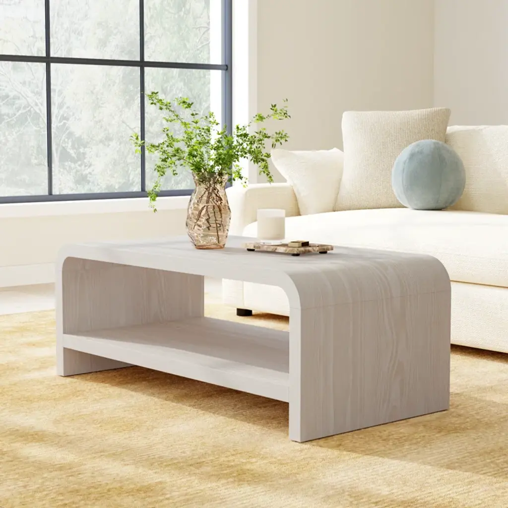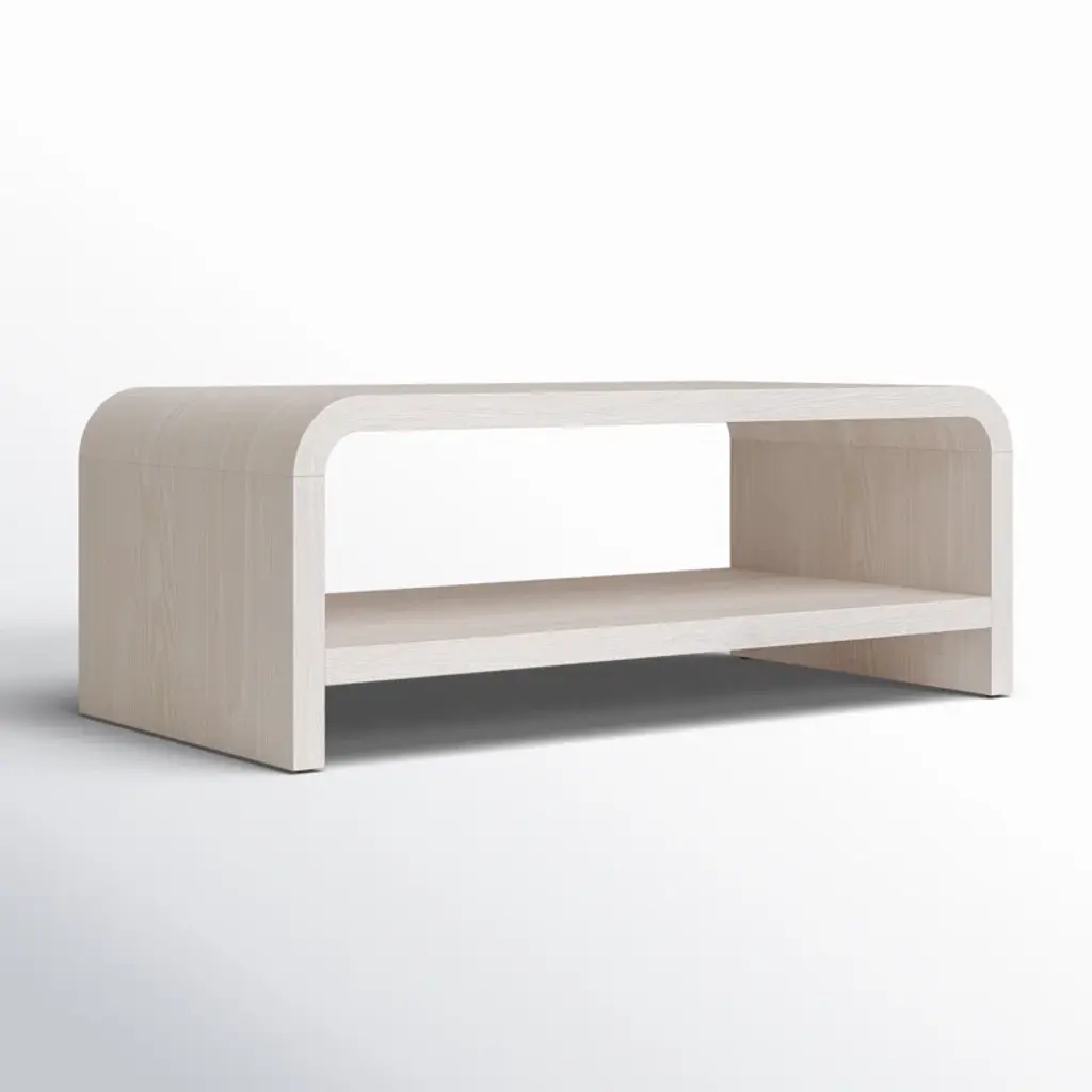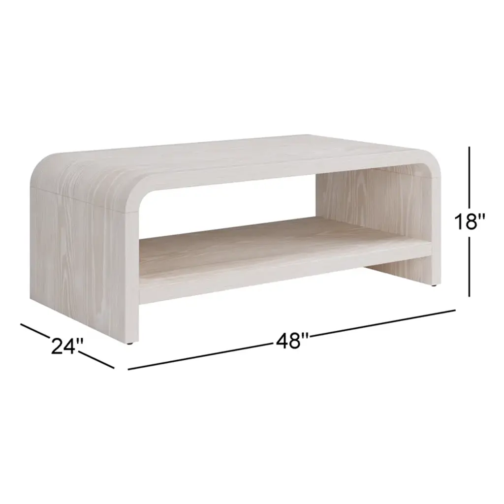 This coffee table pairs a minimalist design with functionality. Crafted from a wood blend with a wire-brushed texture that accentuates its natural beauty, it’s finished in a subtle off-white wash. A spacious shelf offers ample storage, while rounded corners combine style and function. Non-marking nylon levelers ensure stability, making it a versatile choice for any living room.