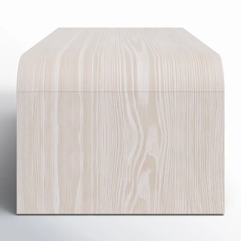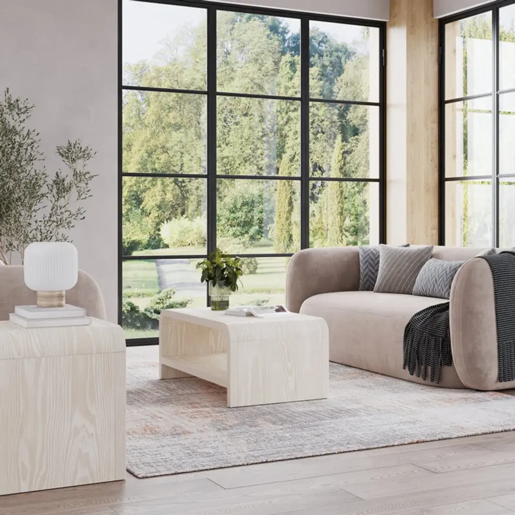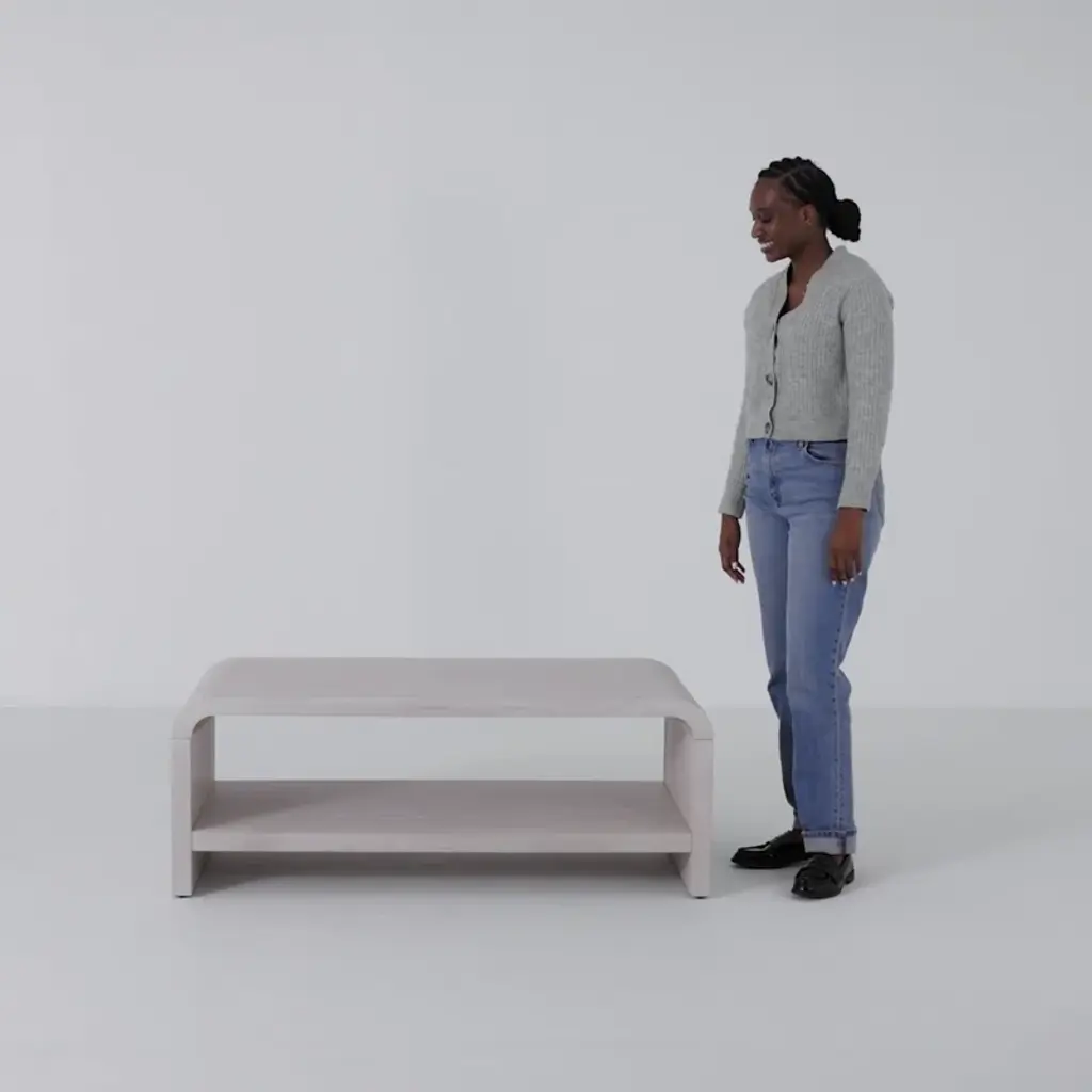 This coffee table pairs a minimalist design with functionality. Crafted from a wood blend with a wire-brushed texture that accentuates its natural beauty, it’s finished in a subtle off-white wash. A spacious shelf offers ample storage, while rounded corners combine style and function. Non-marking nylon levelers ensure stability, making it a versatile choice for any living room.