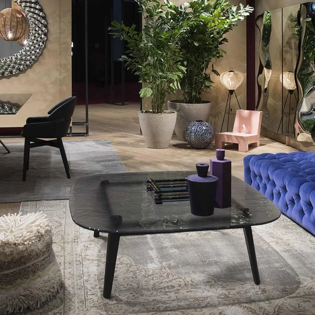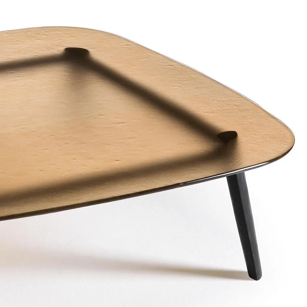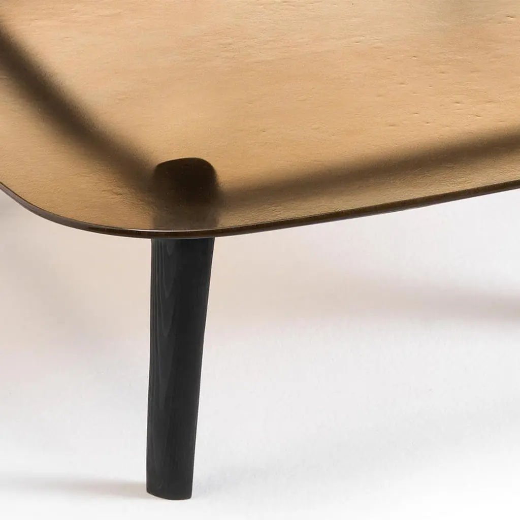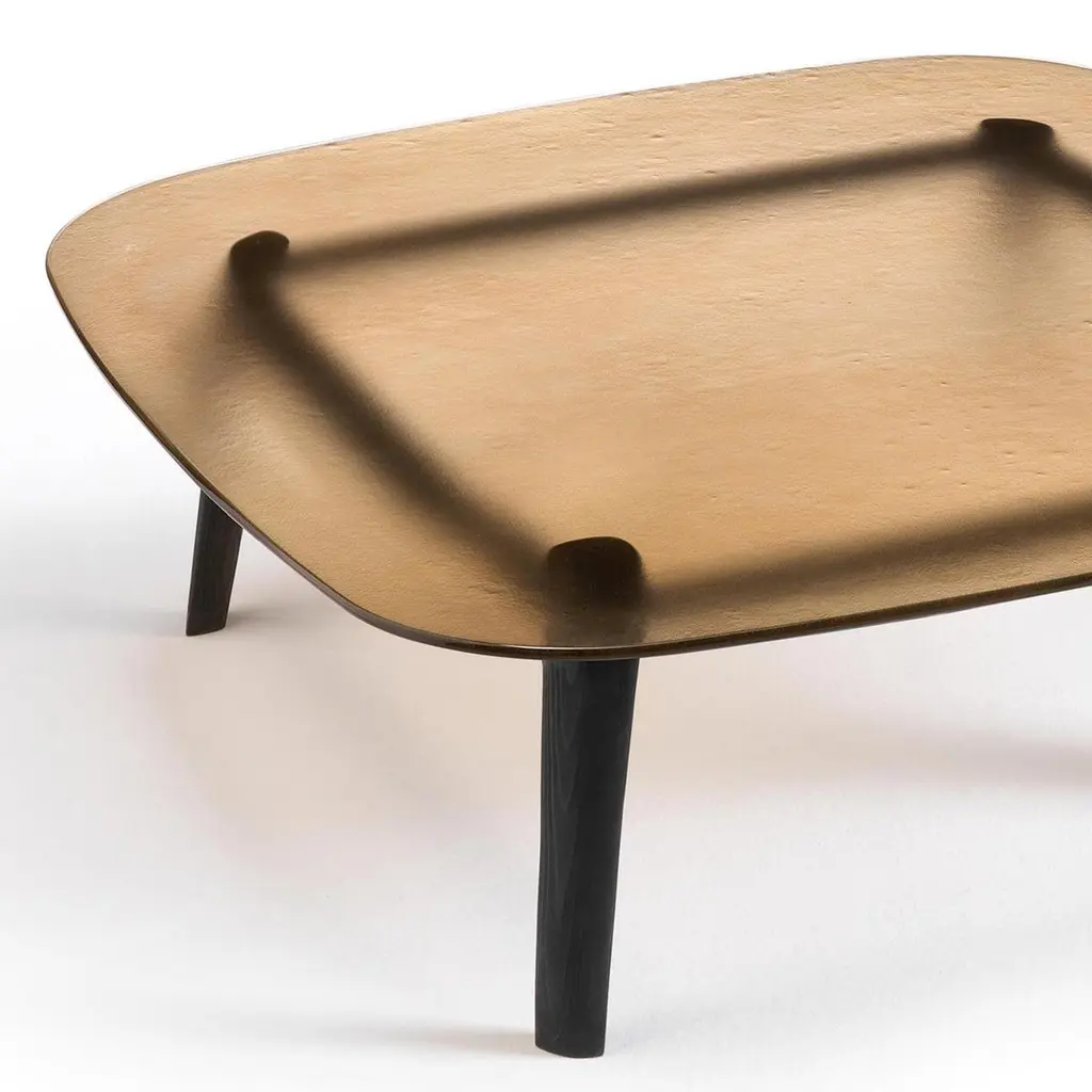 Coffee table Estamp Amber with structure in solid oakin dark grey finish. With tempered and fused glass top,12mm thickness, in amber finish.Also available on request with structure in solid oak in natural finish.Also available on request with glass top in smoke grey, natural satinatedor blue finish.Available on request in:L 180 x D 80 x H 30cm, price: 4990,00€.