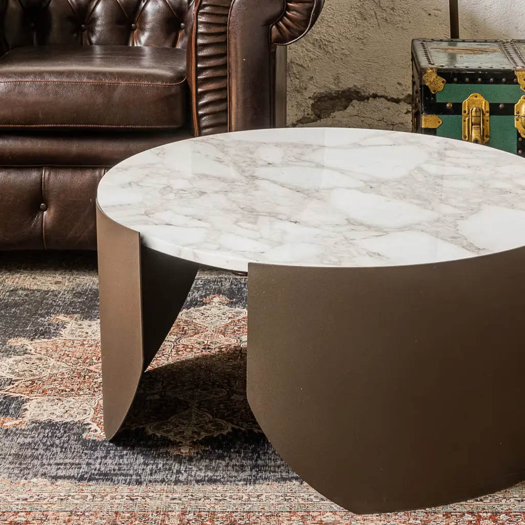 A stupendous display of refined craftsmanship, this coffee table is minutely handmade of first-rate materials that emphasize its elegant contemporary flair. The rounded top in white statuario Carrara marble is supported with an exquisite frame in iron, welded by hand and lacquered in gray (also available in black or gold). Customizable in marble type, please consult the Concierge for options.