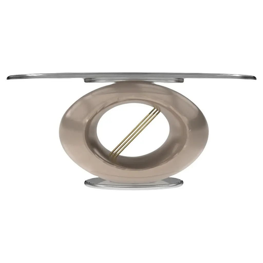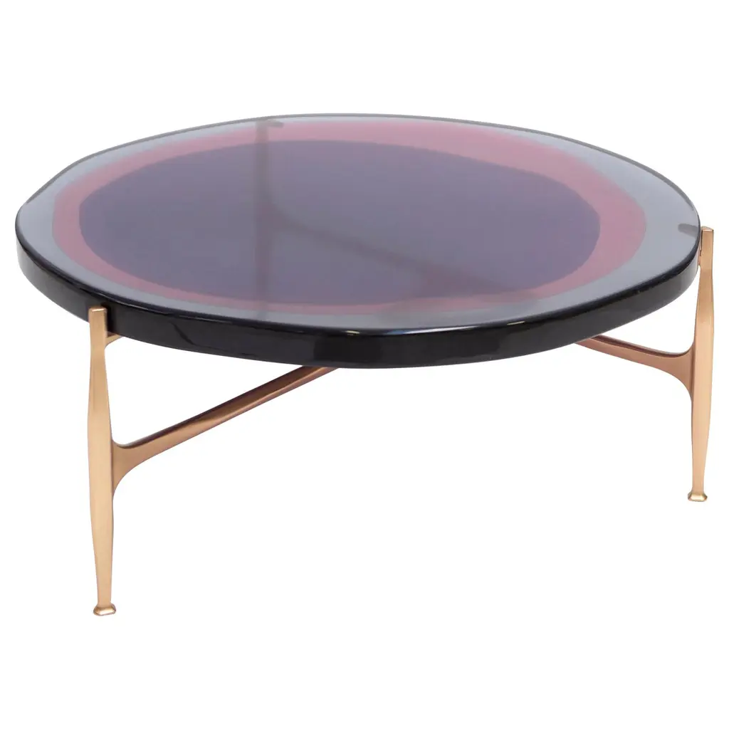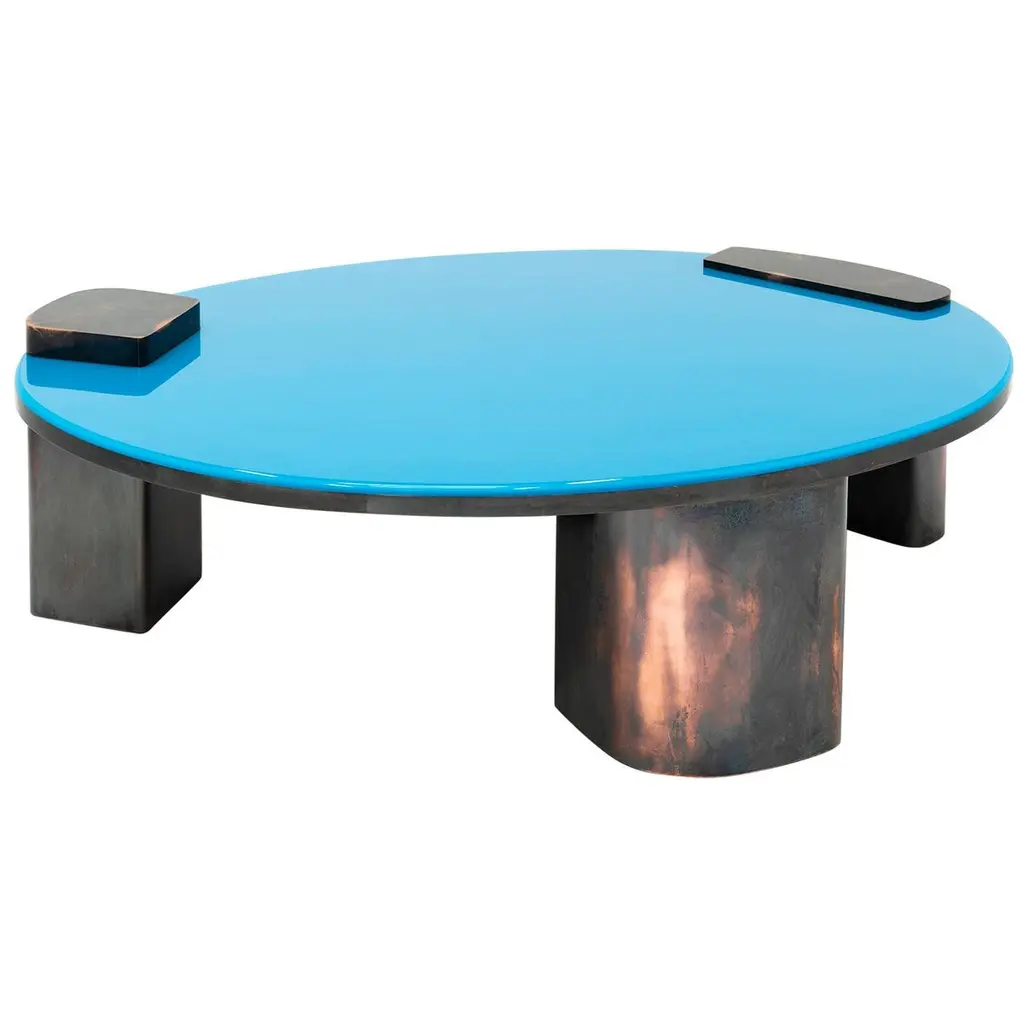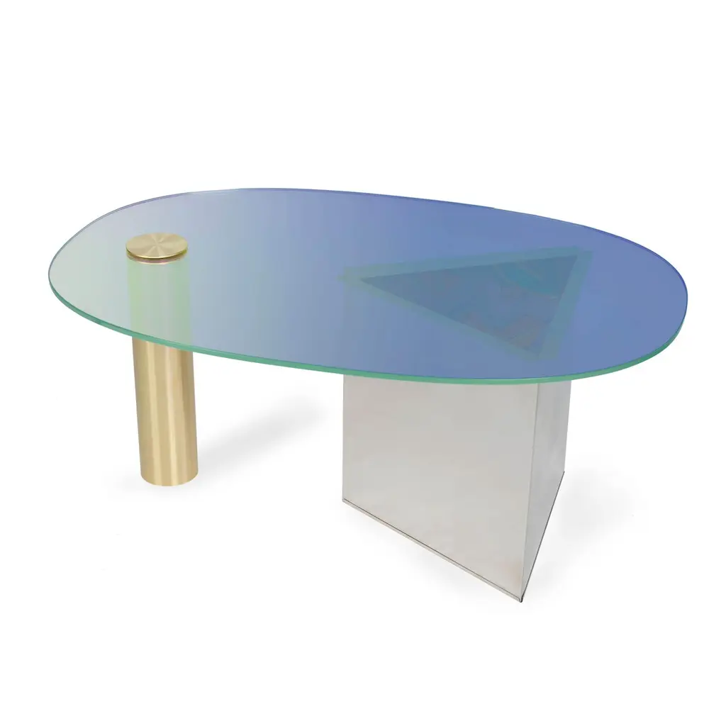 Ettore Blue Coffee Table by Asa JungneliusDimensions: 43 x 67 x 100 cmMaterials: Dichroic glass, brass and stainless steel.Each table is individually painted by the artist. Limited editionAsa Jungnelius is a visual artist (MFA) and a Lecturer at Konstfack, University College of Arts, Crafts and Design, based in Stockholm and Månsamåla. Her work is often material-related and goes from interiors to monumental formats where our bodies’ relations, the objects we surround them with and the rooms they act in together are investigated through a material language. The constant positing of material in the intersection of economy, ecology and the social describes the preconditions for the time in which we live. The objects become a sort of fetish of ourselves as individuals and our contemporary condition. Jungnelius is Artistic Director of Residence-In-Nature and works on a public artwork, The Seashell, for the extension of the Stockholm metro (2016). Her work has been exhibited at Tensta Konsthall (2007), Crystal (2011), Norrköpings konstmuseum (2011), and as site-specific work in Hötorgshallen commissioned by the City of Stockholm (2013), Kalmar konstmuseum (2013), Chamber NYC (2017) Dunkers kulturhus (2017), Fullersta gård (2018), ArkDes (2018), He Xiangning Art Museum in Shenzhen (2018), and Luleå Biennalen (2019). From 2007-2013 Jungnelius was a designer at Kosta Boda. She was part of founding WeWorkInAFragileMaterial (2003–2010) and today runs LASTSTUDIO. During 2019 Jungnelius makes a solo presentation at Vandalorum and participate in OpenArt, Örebro.