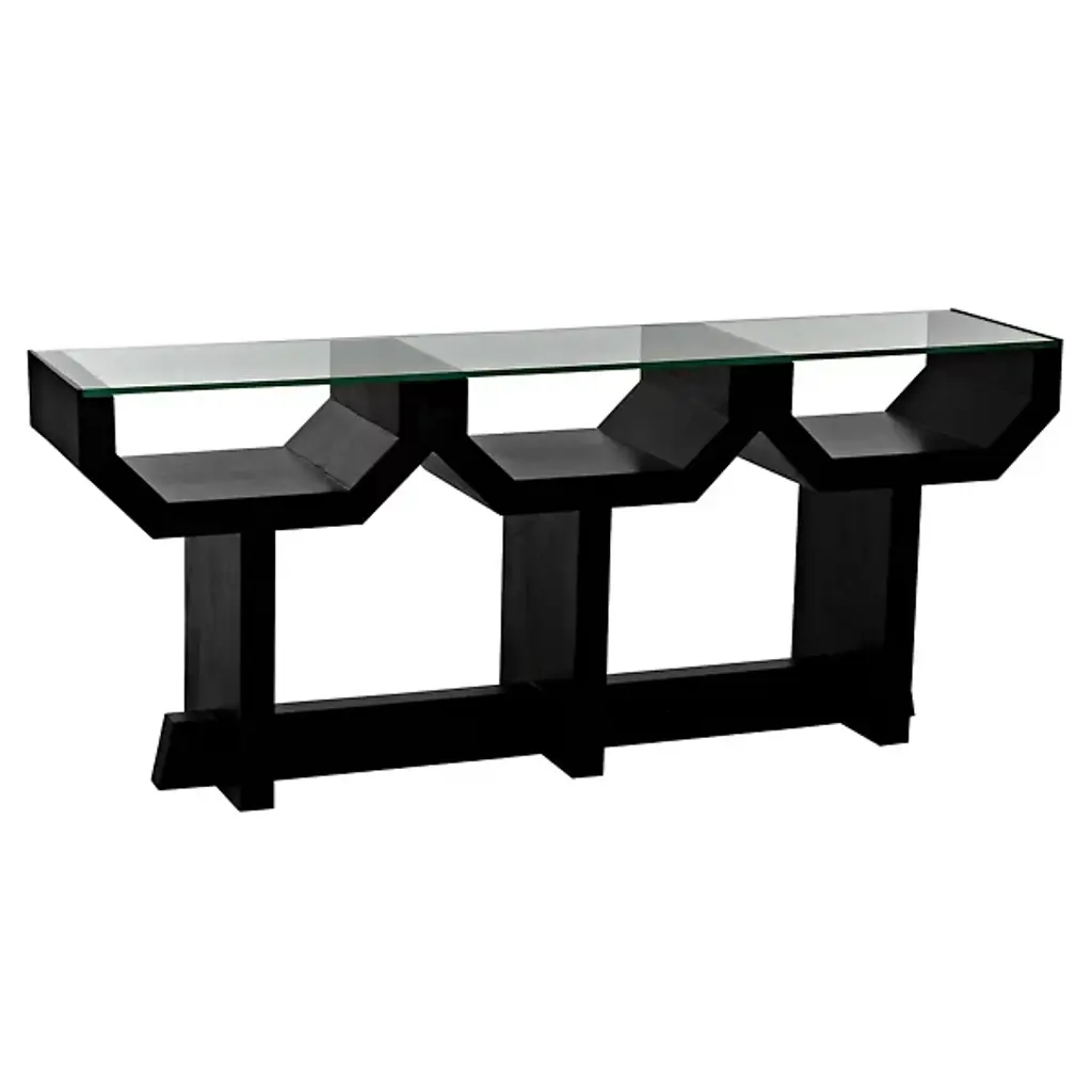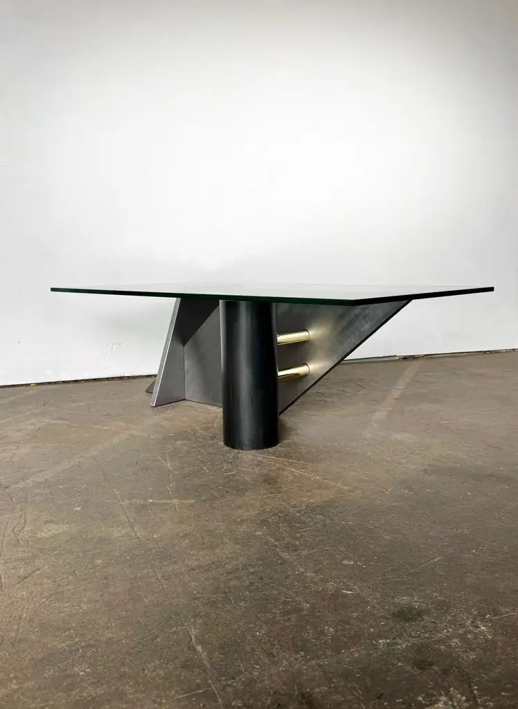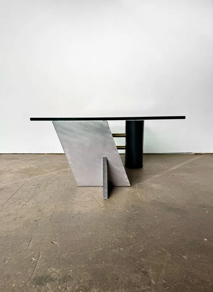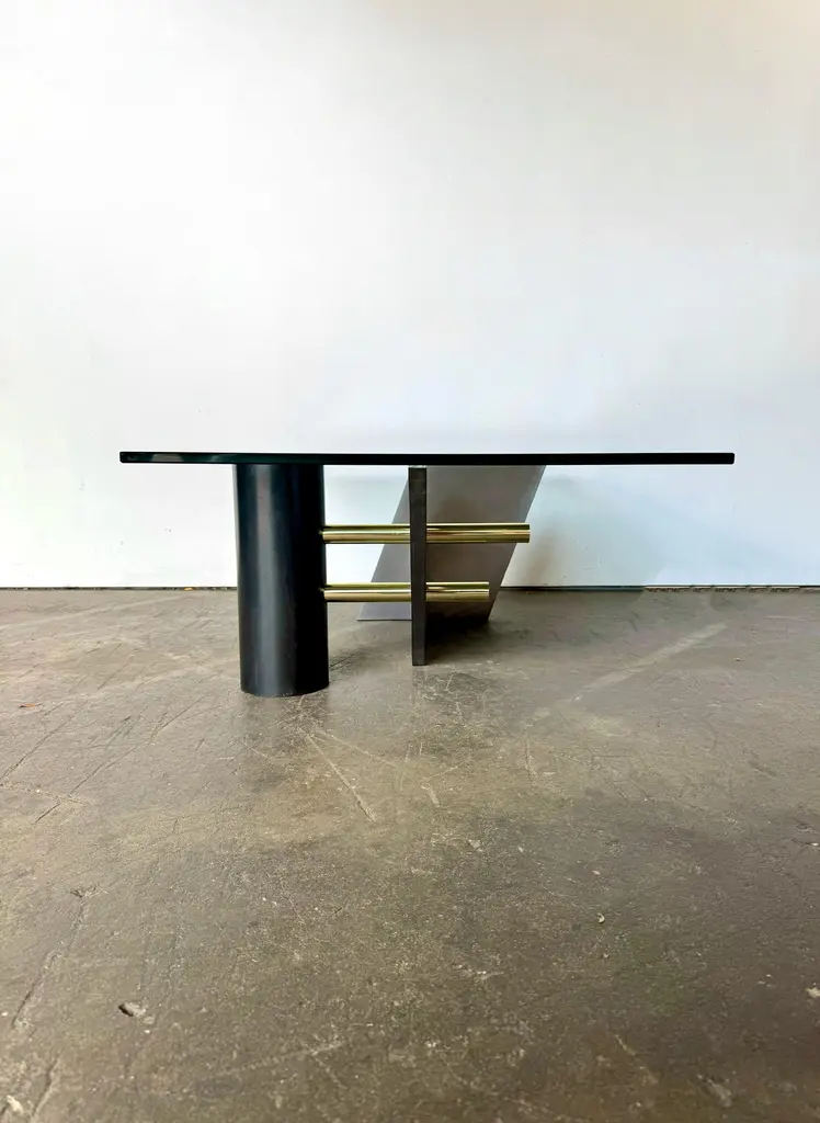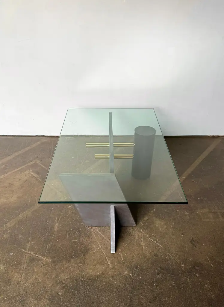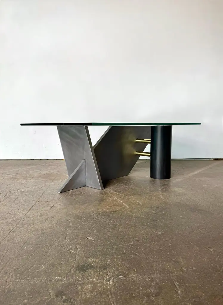 Named for and inspired by the "Father of Geometry" ancient Greek mathematician Euclid, The Euclidean - Coffee Table exudes a unique sophistication. The base, comprised of blackened steel, polished steel, and brass, highlight the striking parities between the intersecting parallelograms and round pillars that make up the piece. Topped with a 43"x 26" x 1/4" glass surface this coffee table is the perfect meeting of sculptural and functional.43"L x 26"W x 14.5"HHandmade in Brooklyn NYInquire about customizations