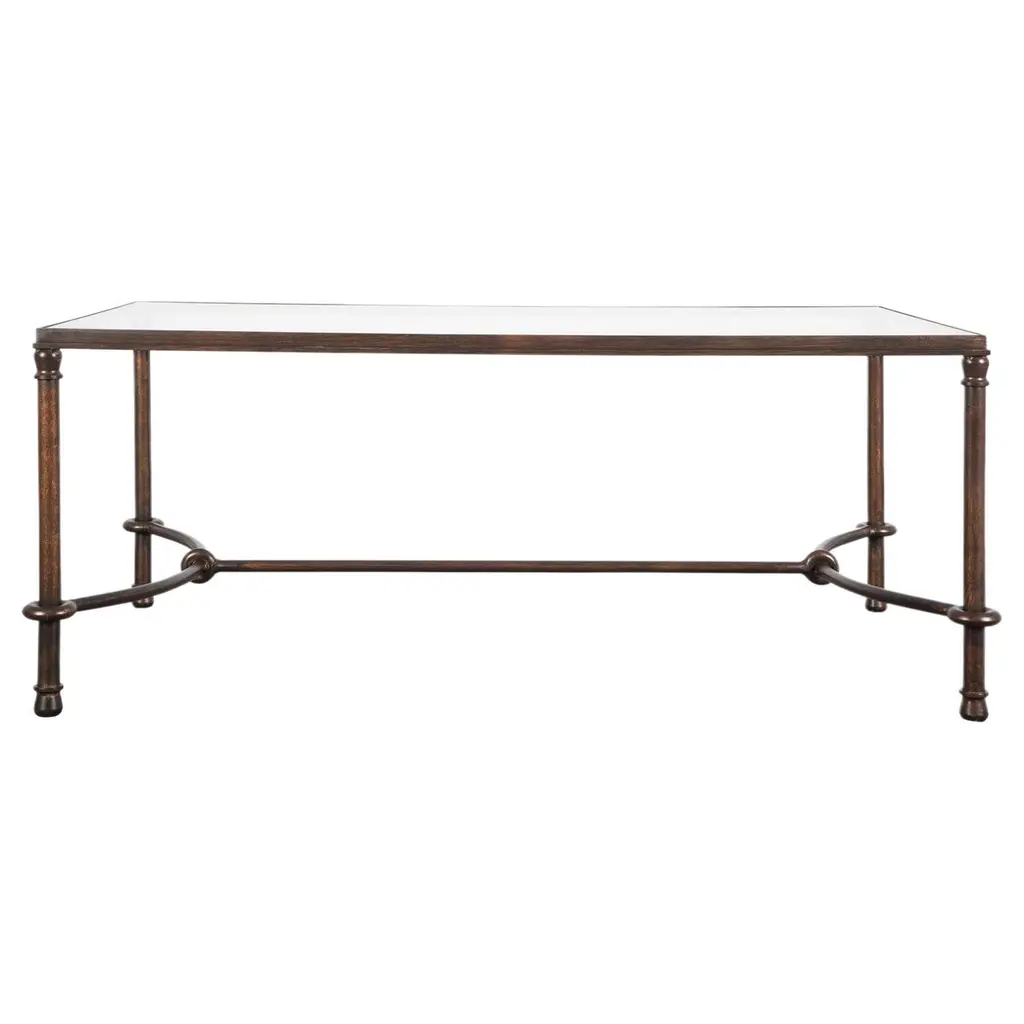 The Eulalia Coffee Table is a masterpiece of design, drawing inspiration from the timeless elegance of ancient horse bridles. This exquisite piece is a harmonious blend of rings and curves, meticulously crafted from forged iron. Its rustic bronze patina adds a touch of vintage charm, evoking a sense of history and romance. The table's top, made of clear, tempered glass, offers a window into its intricate design, allowing light to dance across its surface. This coffee table is not just a piece of furniture; it is a statement of style and sophistication, perfect for those who appreciate the beauty of artful craftsmanship.