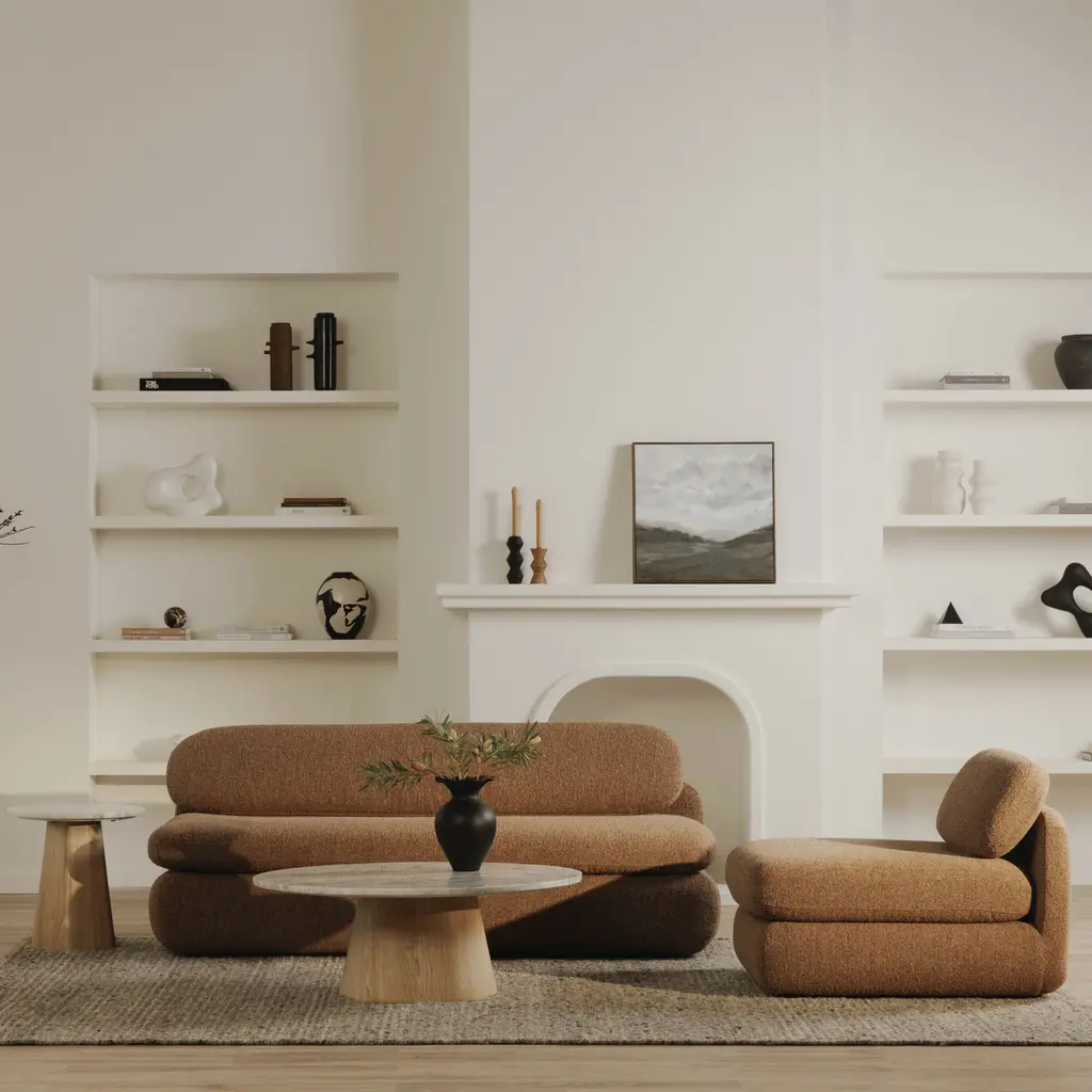 The Evelyn coffee table is a harmonious contrast of materiality and tactility, where a weighty base meets a visually light marble top. With five connected sides equipped with softened, rounded edges, the base assumes an organic appearance, its natural color subtly softening the marble top for enduring visual appeal.