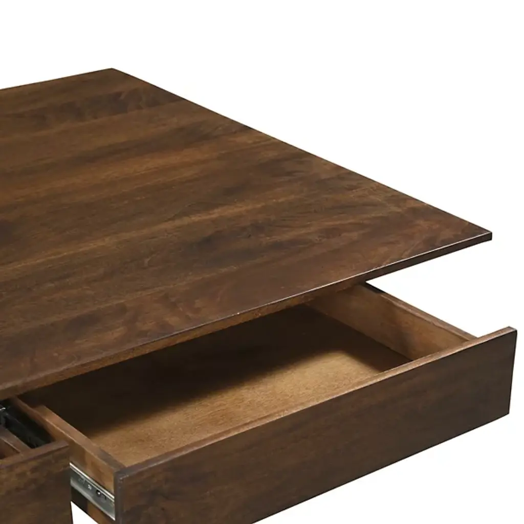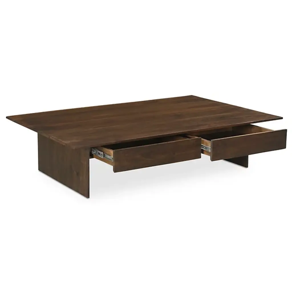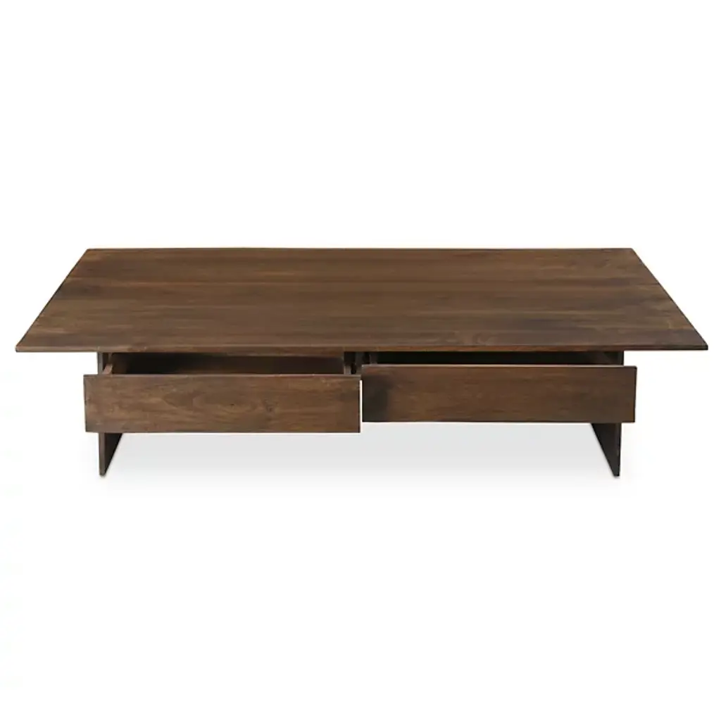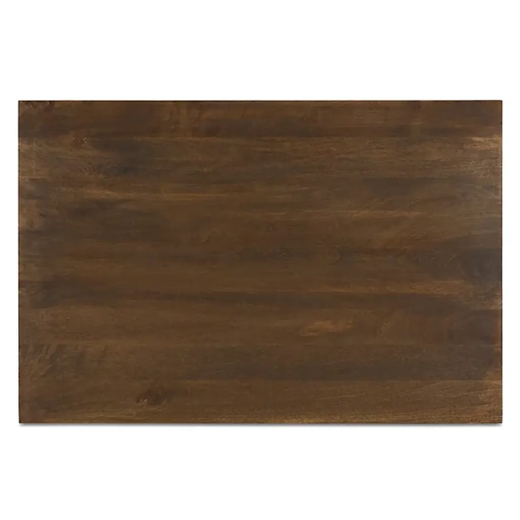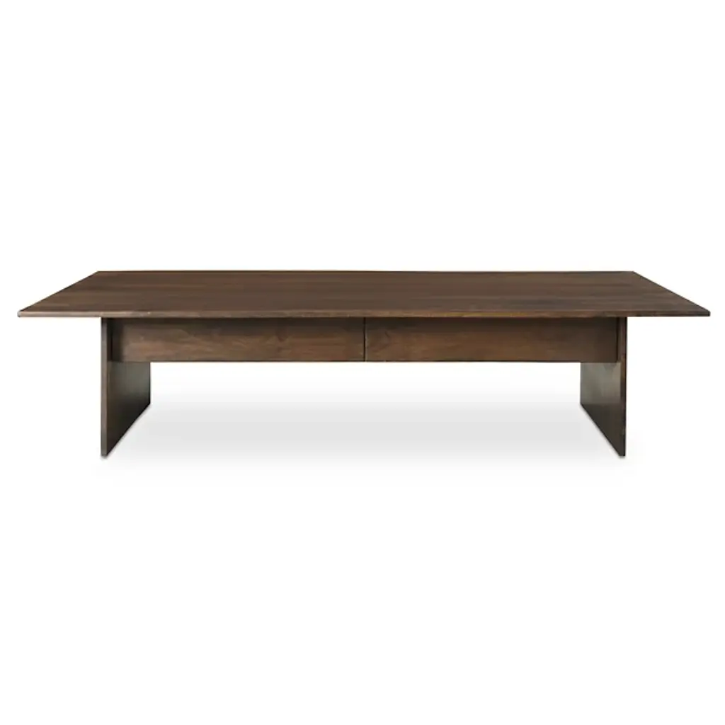 The Everett Coffee Table from Moe's Home Collection is constructed from solid mango wood and features a rich brown finish that enhances its natural grain. Its design features a modern linear form with clean, angular lines. The table's sturdy construction ensures durability, while its simple geometric shape offers versatility for various interior styles. The Everett Coffee Table combines practicality with aesthetic appeal, providing a functional surface area alongside its visually striking design.