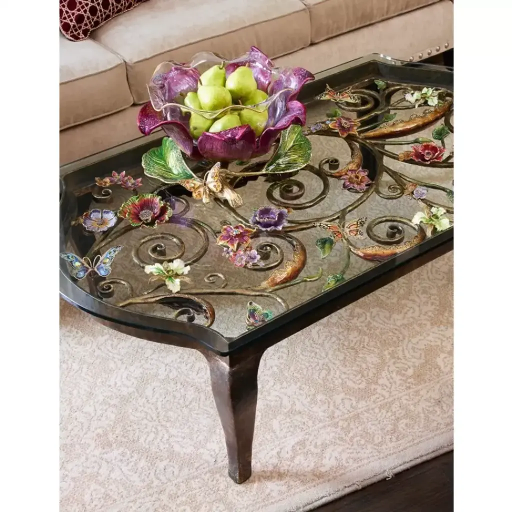 The Everett Floral & Scroll Coffee Table began at a specialized foundry in Asia where iron rods are hammered, curled, and soldered to form the elaborate top and graceful curved legs. In Rhode Island, individual orchid, peony, tulip, and butterflies are casted in pewter and finished in 14K Gold. The Jay Strongwater artisans in Rhode Island paint the garden palette of enamels on each piece, highlighted with over fifteen hundred Swarovski crystals. Our finest artisans bring all the elements together to make each coffee table, a fascinating composition of flora under the beveled glass top.