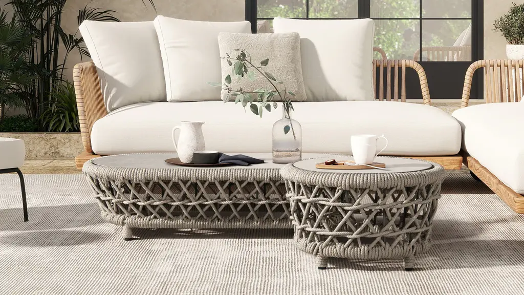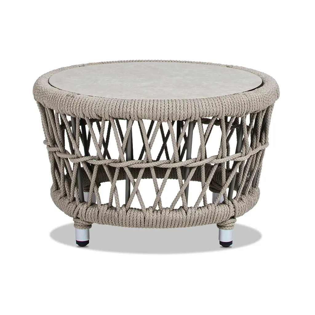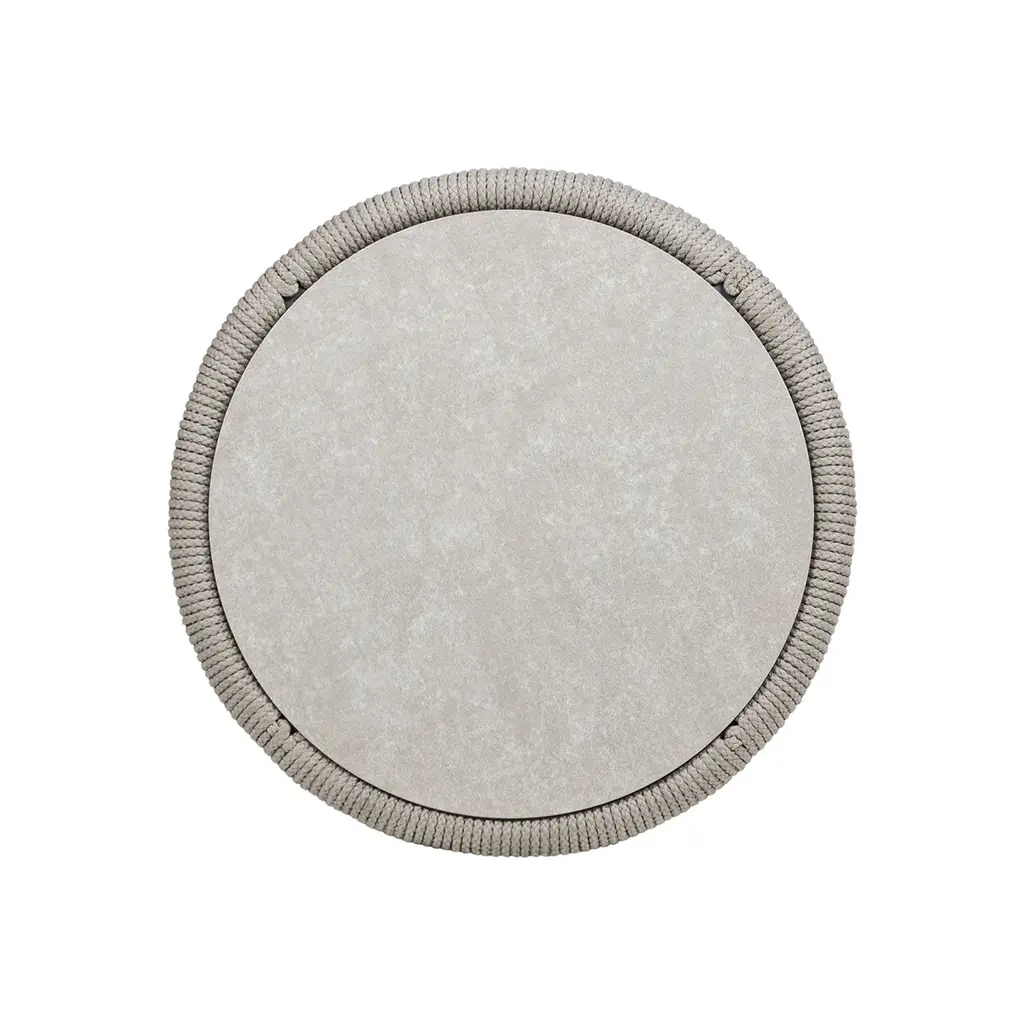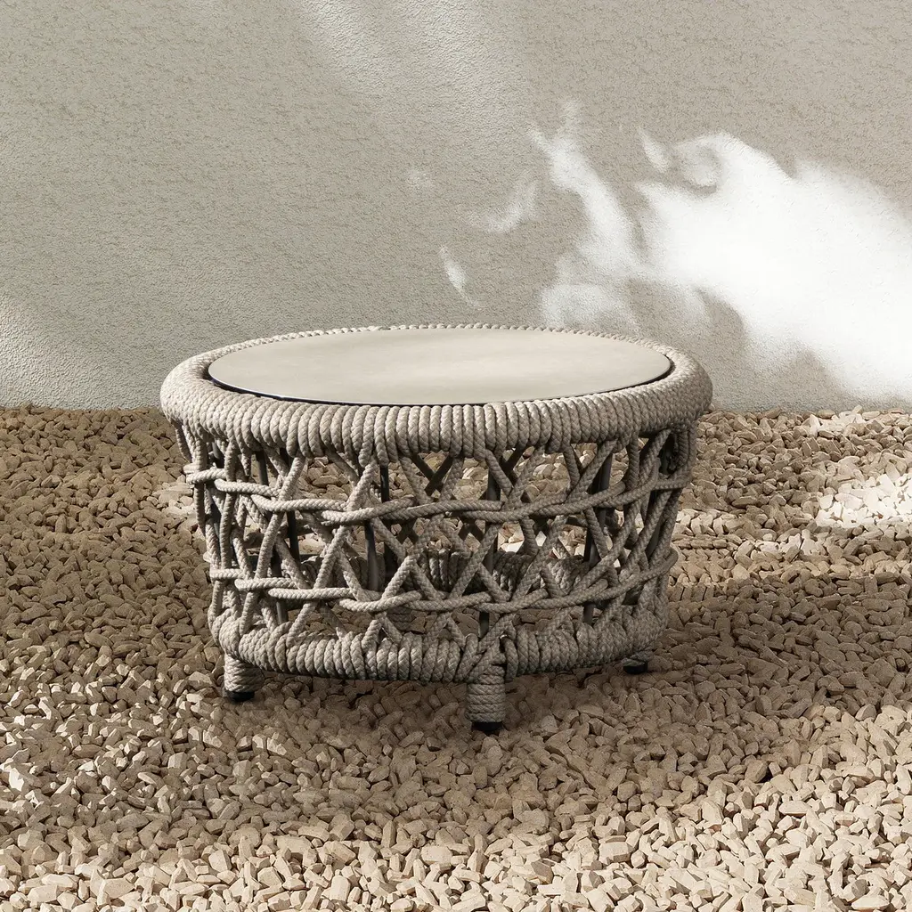 Inspired by relaxed outdoor living, the Everly 21.5" Round Patio Coffee Table brings versatile style and smart function to your space. Handwoven with durable light beige olefin rope, it frames a sturdy aluminum structure built to last. The removable, reversible tabletop offers two looks in one — sleek tempered glass on one side, and a natural stone-look finish on the other. Its compact round shape is perfect for patios, balconies, and cozy outdoor lounges. With the Everly table, effortless style and flexible design go hand-in-hand.