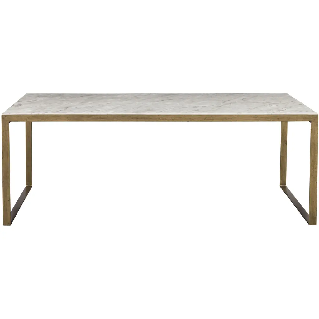A beautiful modern marble coffee table. Tabletop features a 1" layer of white Italian marble supported by an antique brass iron frame. Can be paired with our high profile Evert coffee table for added dimension. Each piece sold separately. As marble is a natural material, unique veining, pitting, fissures, micro-cracks and colour variations are all characteristics that add to the uniqueness and beauty of each piece.