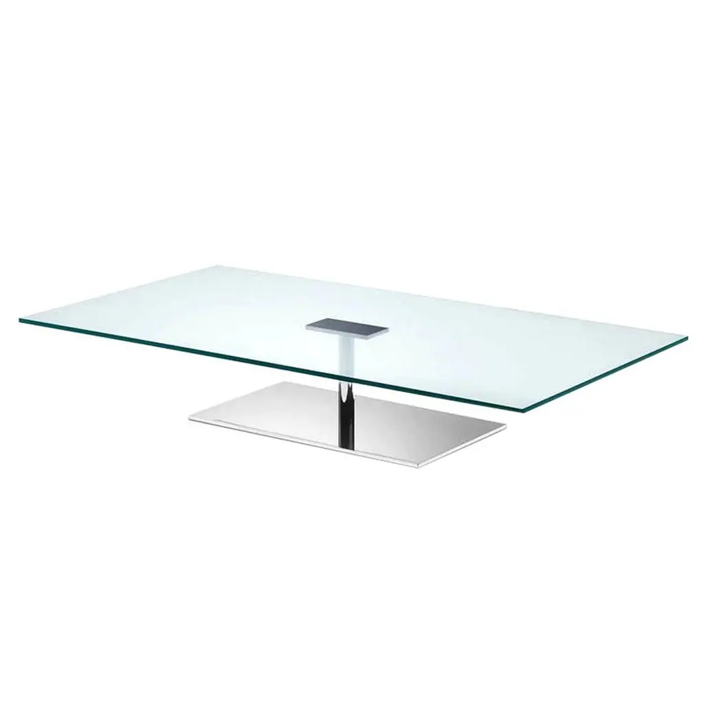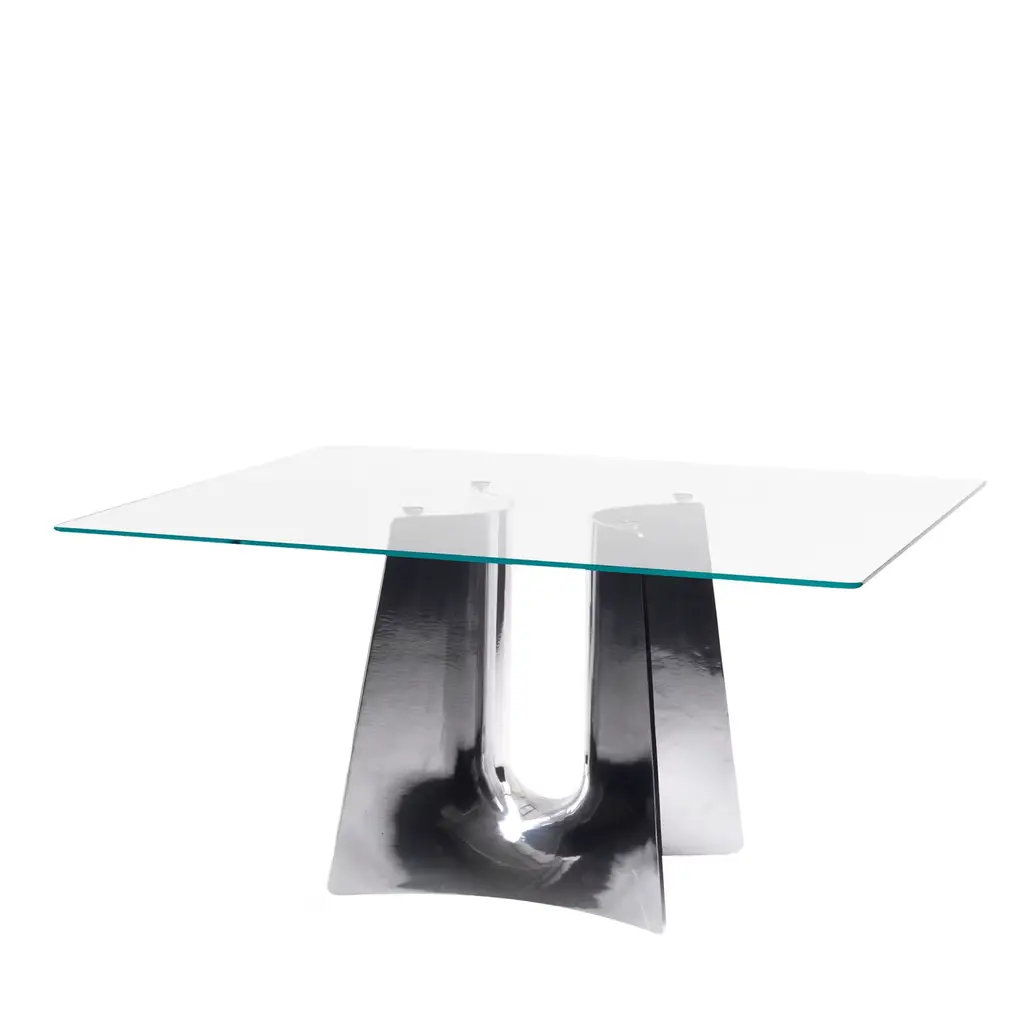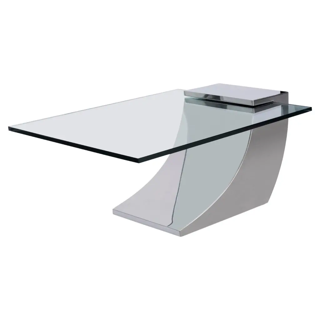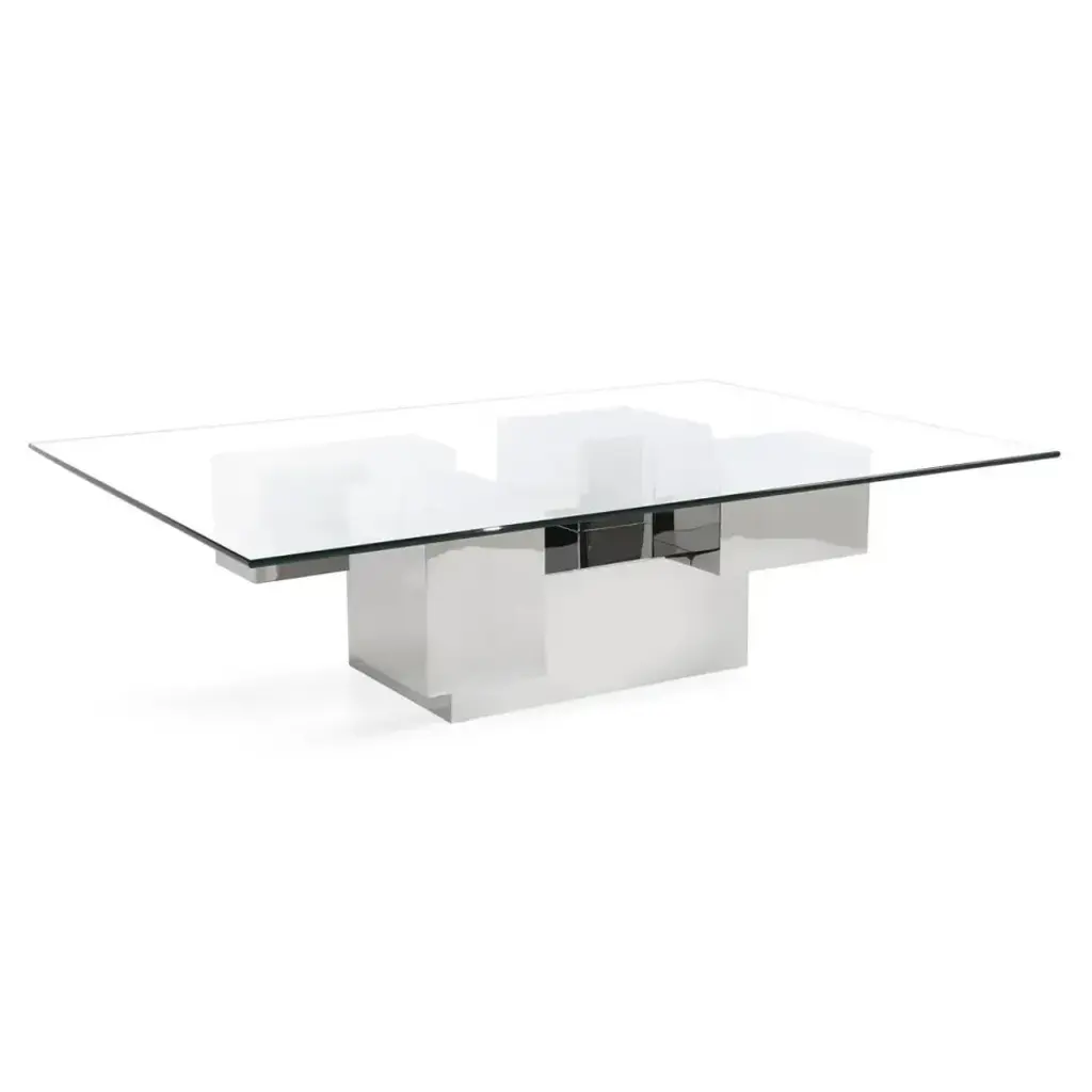 The Excelsis Cocktail Table is a stunning, geometric piece that exudes contemporary charm. Crafted from polished stainless steel, the base consists of five polygons of varying sizes arranged in a creative display. A tabletop of rectangular tempered glass pairs beautifully with the metallic tones of the base.
