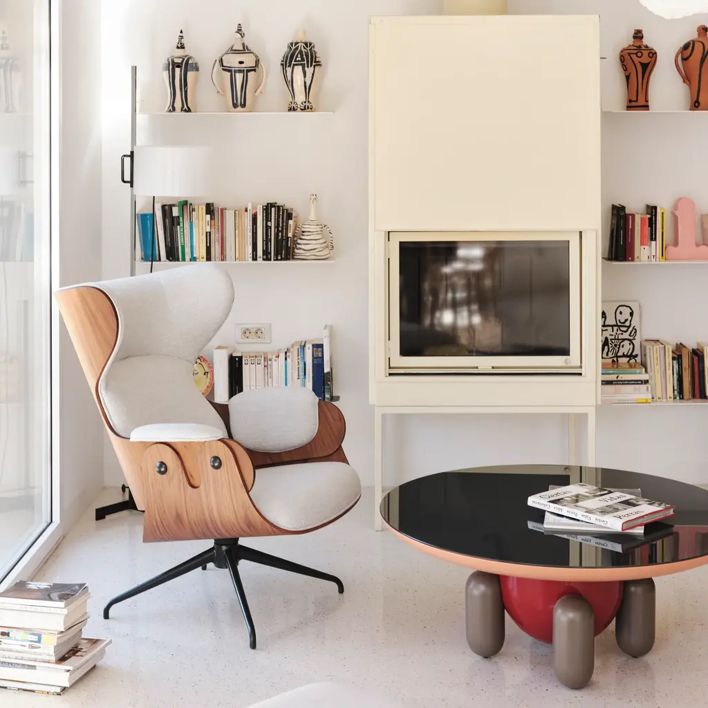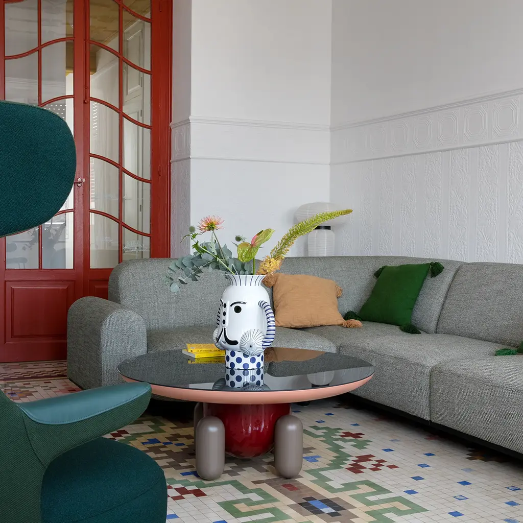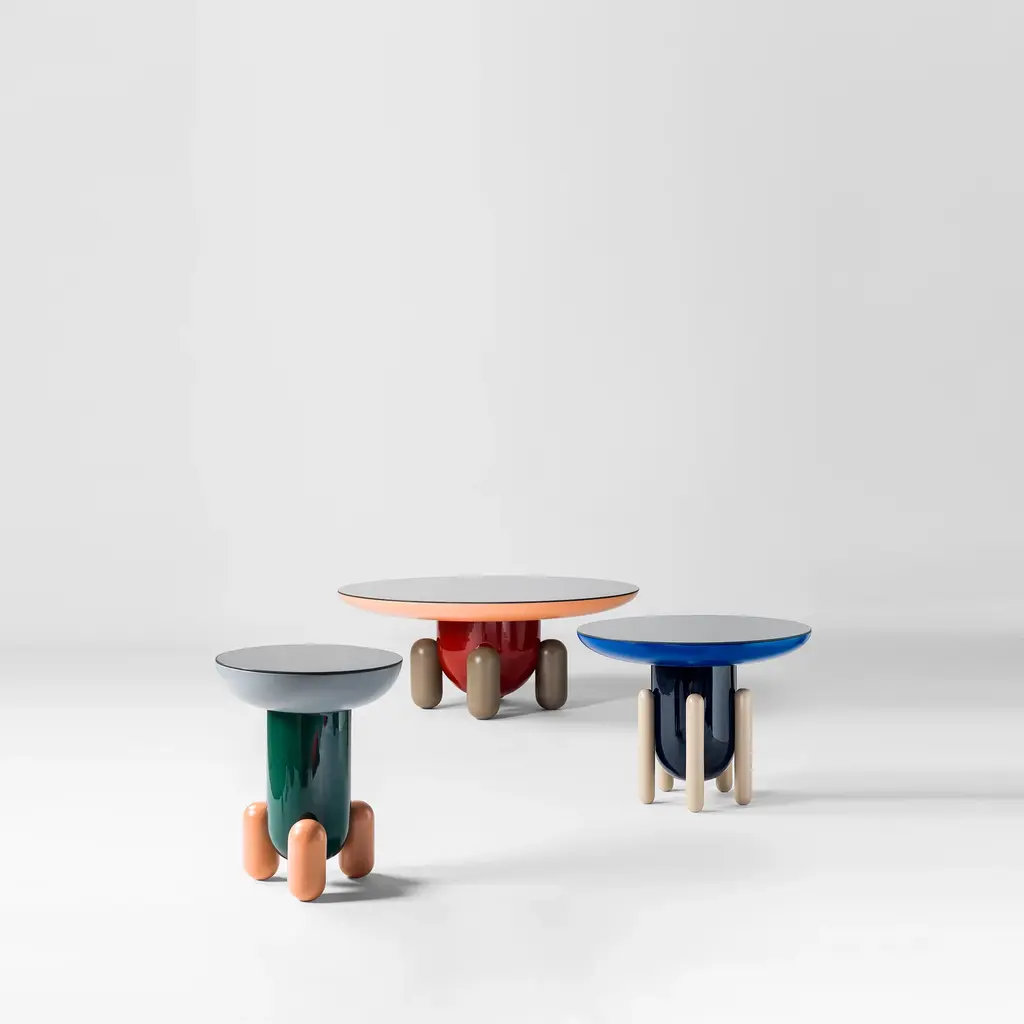 Partially inspired, yes, by brightly hued jelly beans, Jaime Hayon lifts the proverbial candy jar lid on a series of multicolor coffee table with playful rounded forms. Painting some of the parts with a gloss finish and others in matte in the same piece with a reflective painted-glass top surface lends even more verve to Explorer, while mono-color versions exhibit the same sculptural character.