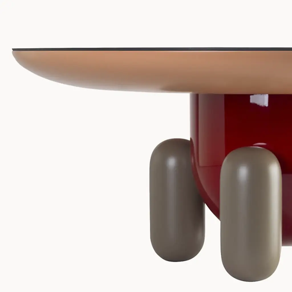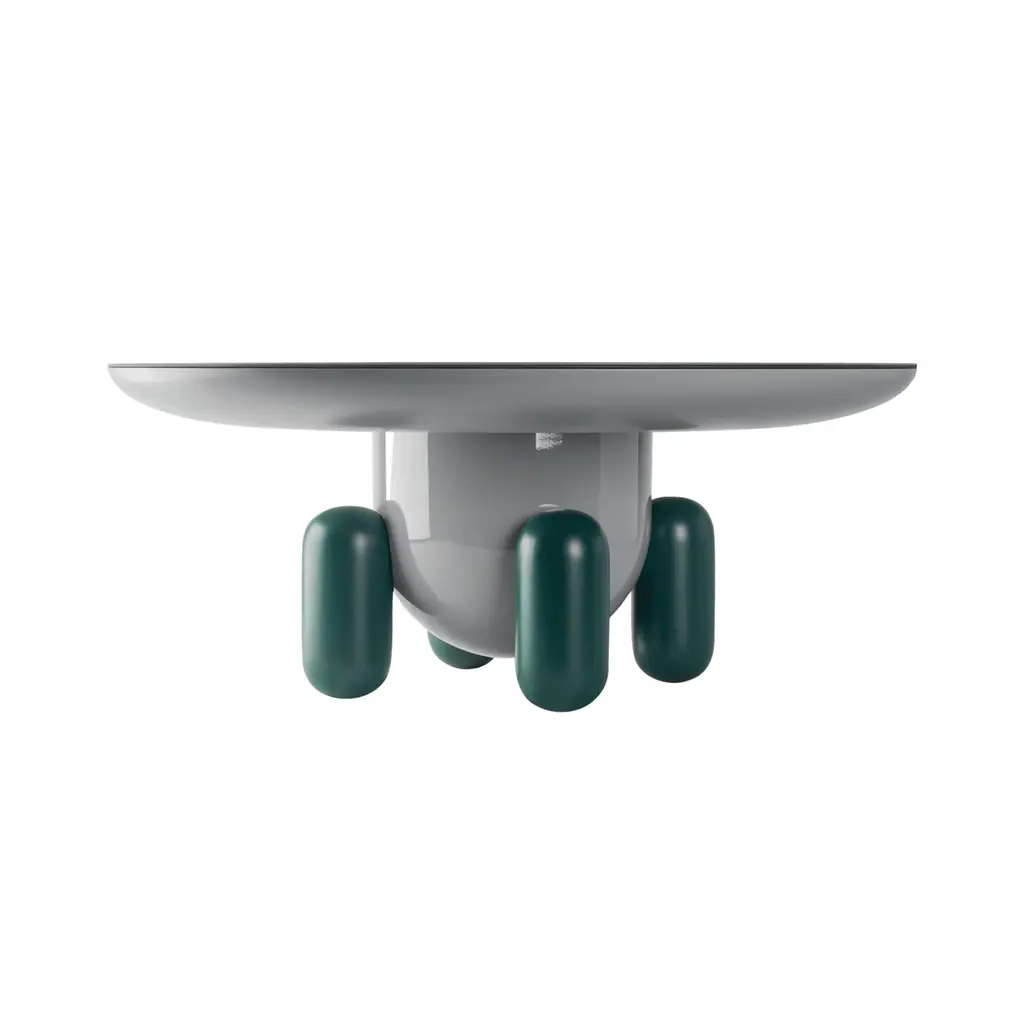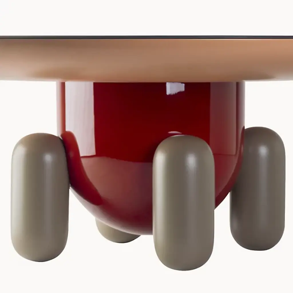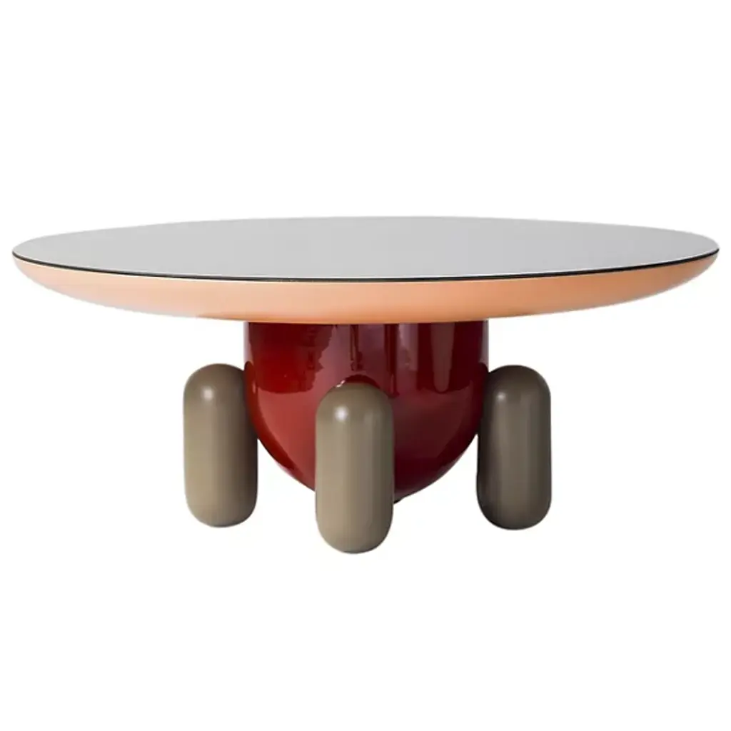 Provide a tasteful appeal to modern interiors with the inspired design of the Explorer Round Coffee Table from BD Barcelona. A clever, clean-surfaced creation from Jaime Hayon, the table family is designed around the childlike joy of Jelly Bean candies, communicating smooth style with retro-modern geometric shapes. A mix of gloss and matte finish to its surfaces, it ascends from solid alder wood legs with rounded ends, setting a fiberglass bowl and body below a clean-surfaced and contrasting glass tabletop.