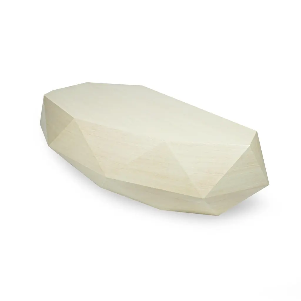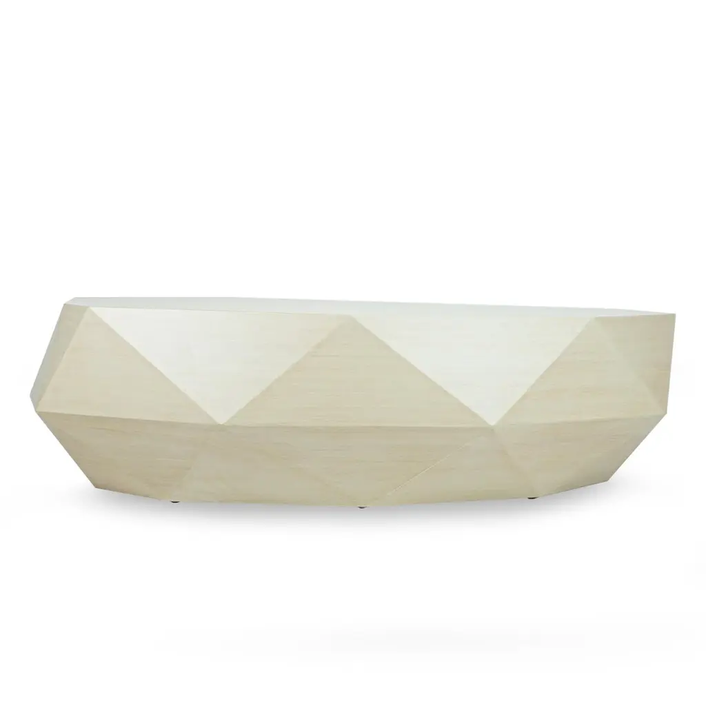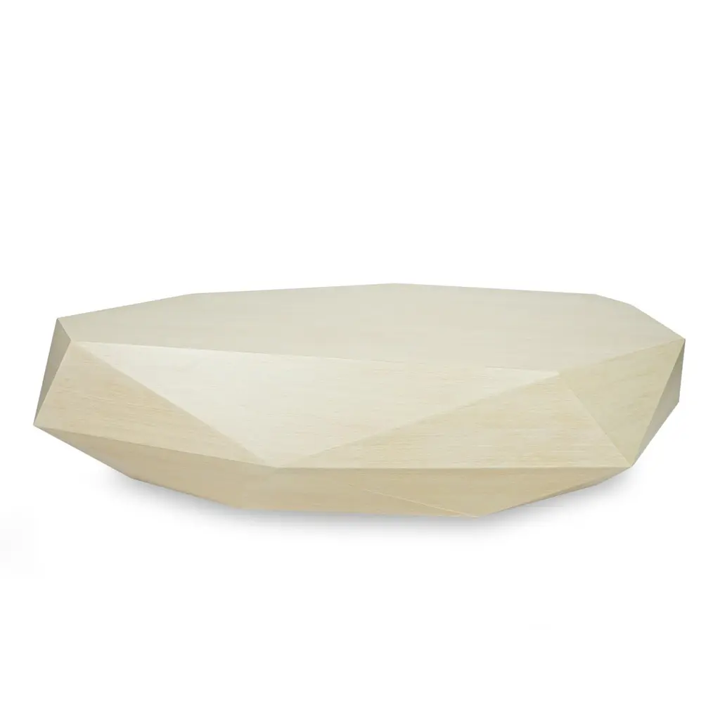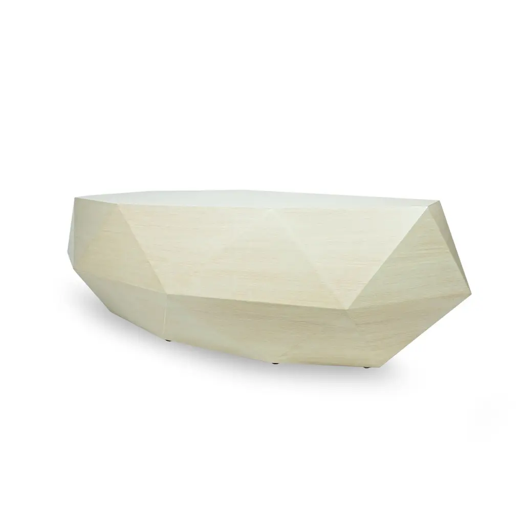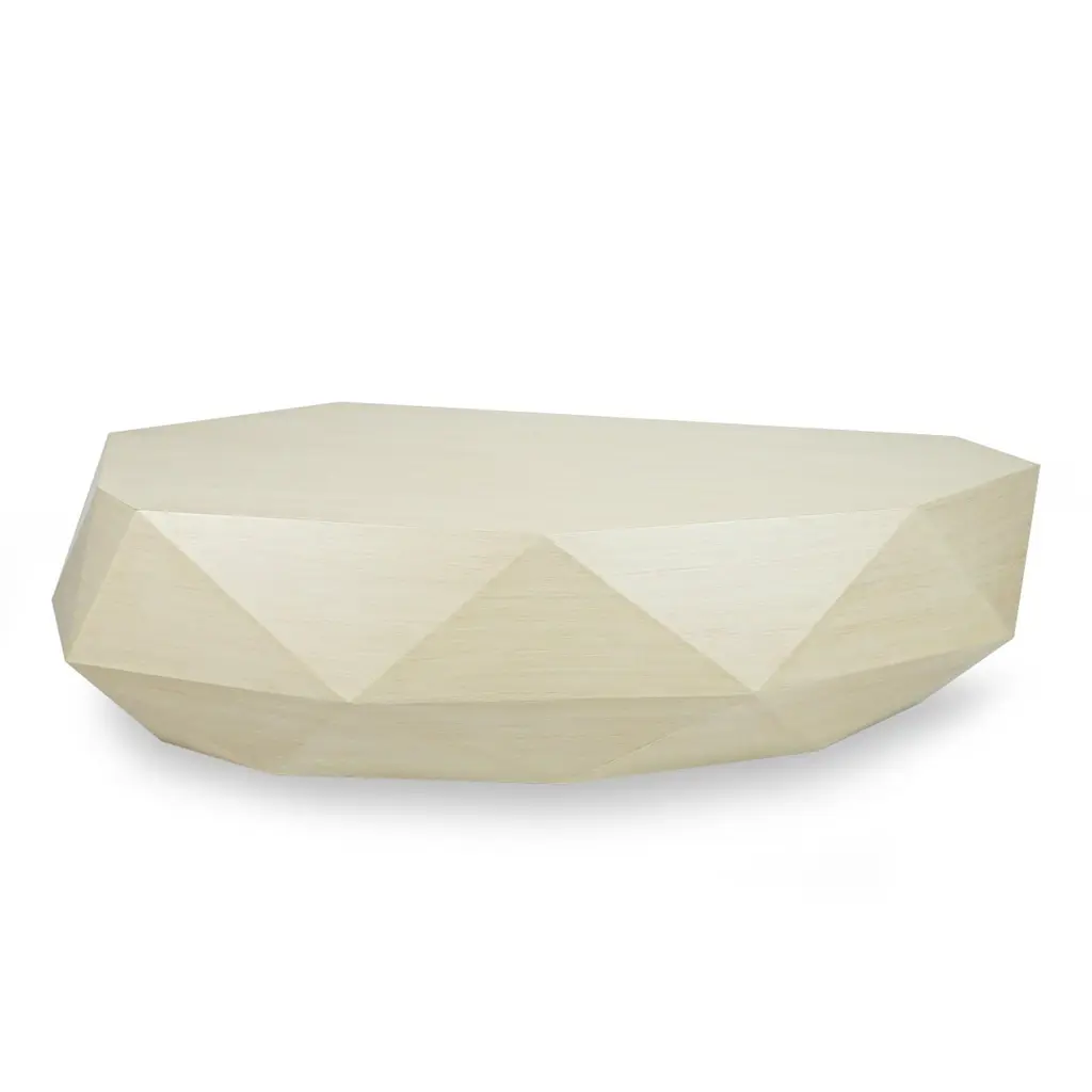 Faceted white oak veneer coffee table. Facets may not be identical from table to table. Handmade in Norwalk CT. Overall size and shape/orientation customizable.Measurements:Outside: 55”W x 24”D x 17”HPrice As Shown: $5,120 eachCustomization may change price.How We Work:Made to order by Connecticut-based furniture design and manufacturing company The Tailored Home. Submit your customization desires by 1stdibs messenger for a quote. After orders are placed our workshop manager creates a visual work order for your approval for quality assurance.Customization Options:Dimensions can be customized. Ask for details.The fabric shown may come in more colors. We also carry thousands of other materials and can send you samples and fabric pricing upon request. We accept your fabric for a COM fee of 5% of the cost of the piece. Welting, piping, tape or trim can be added. Different species available for pieces with exposed wood and can be painted & lacquered in any Benjamin Moore color (for additional charge) or stained in one of our stain options. Custom color matches cost $75 per sample.We accept inspiration photos of pieces you like.2021 - Made to OrderThis piece can be made as is or custom made with customer’s choice of materials and size adjustments.9-10 weeks.