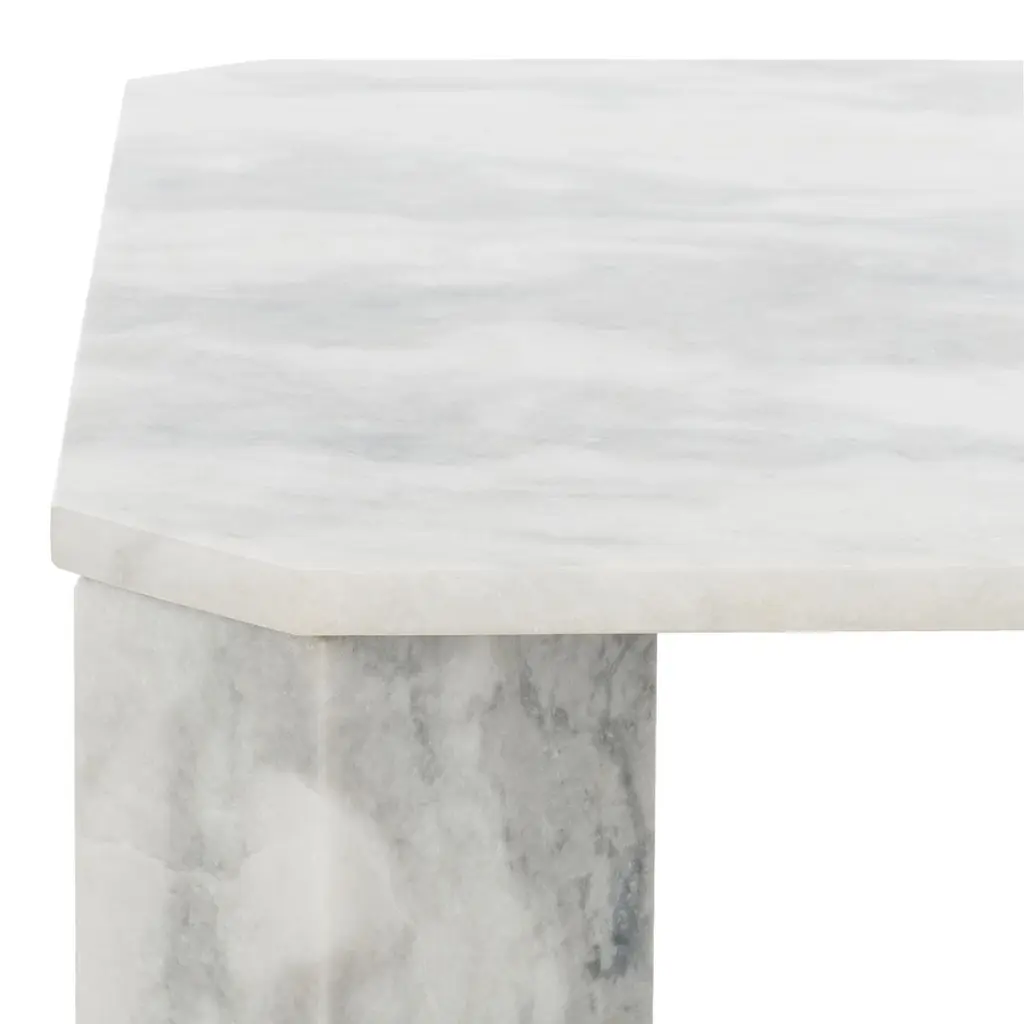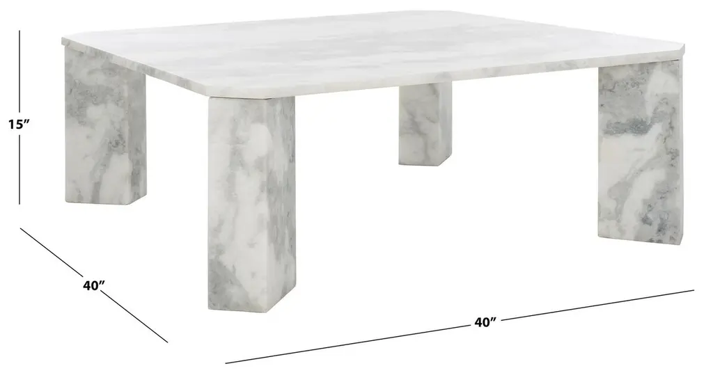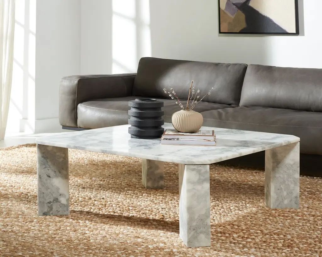Anchor your living space with the polished and sophisticated touch of our Faelan coffee table. The stunning table combines the organic beauty of natural stone with a clean and streamlined design. The angular corners of its square tabletop are beautifully accentuated with chunky legs. Its bold, architectural profile explicitly celebrates the organic allure and texture of marble. Chic and sophisticated, our coffee table serves as the perfect centerpiece for a luxe home office or refined lounge.