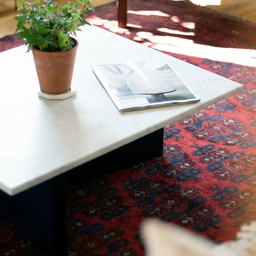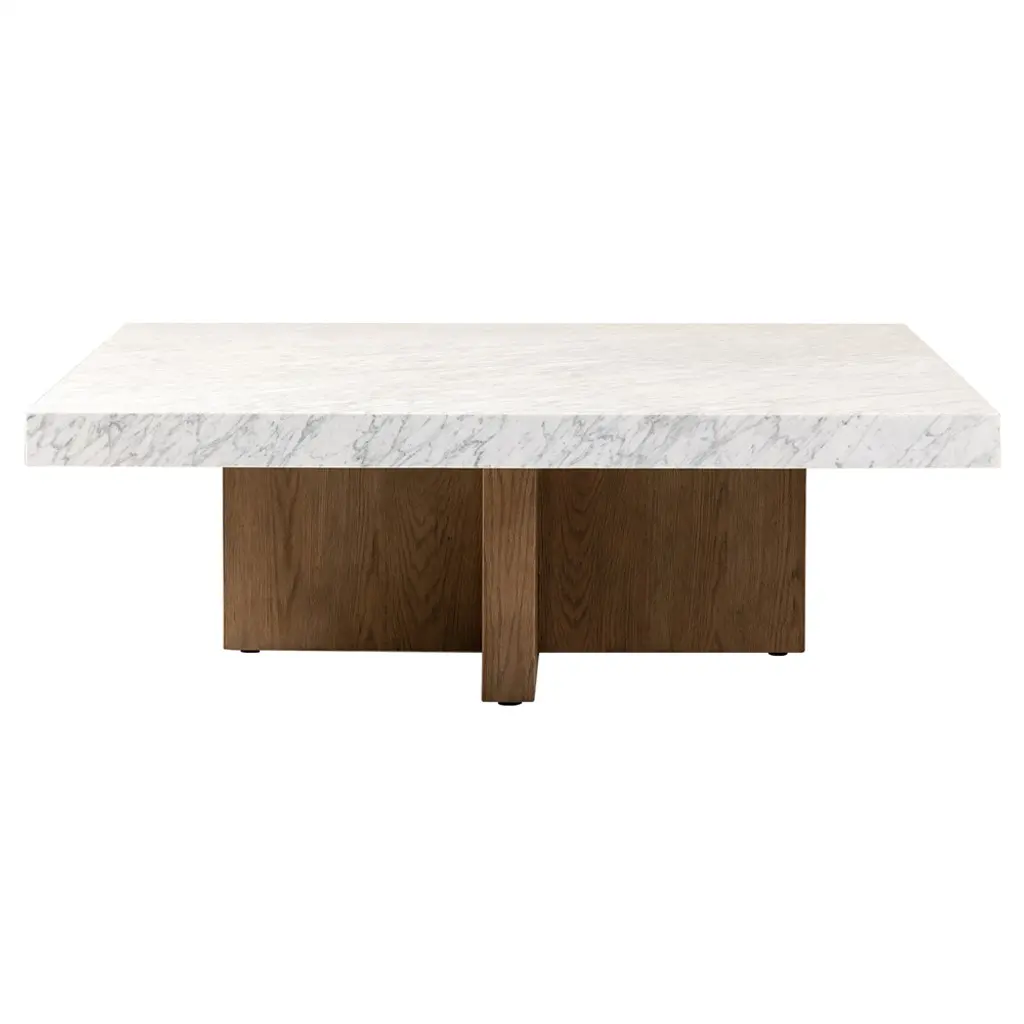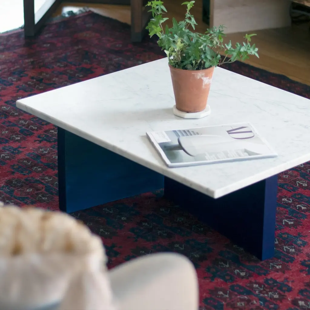 A beautiful, minimal coffee table inspired by Bauhaus architecture and art. This piece features a honed Carrara marble top on a solid maple wood base finished in lacquer. Customizable marble and lacquer finishes are available. Customizable sizing available.