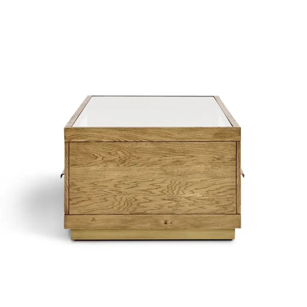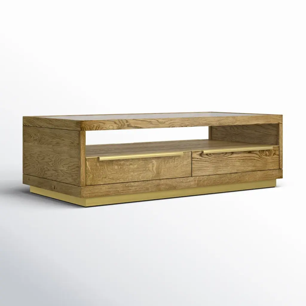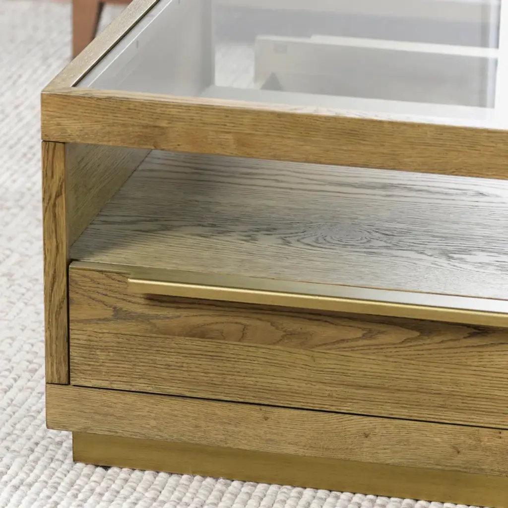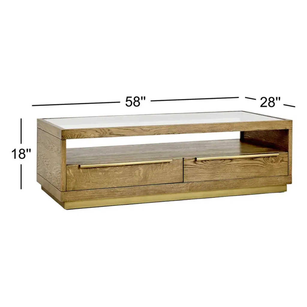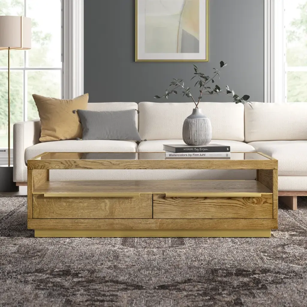 Offering a beautiful blend of style and function, this coffee table features an inlaid glass top within a sharp, minimalist design. Four drawers and a shelf maximize the footprint of this piece by offering versatile storage and display space.
