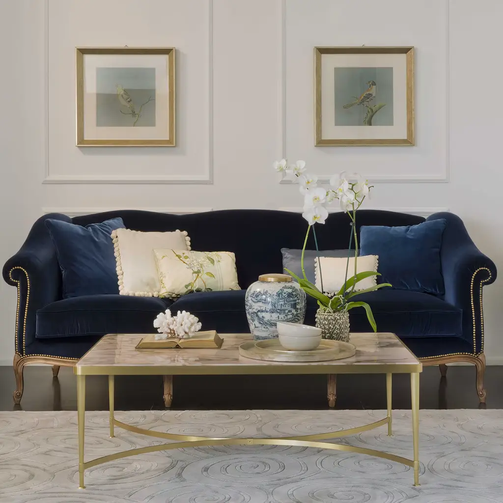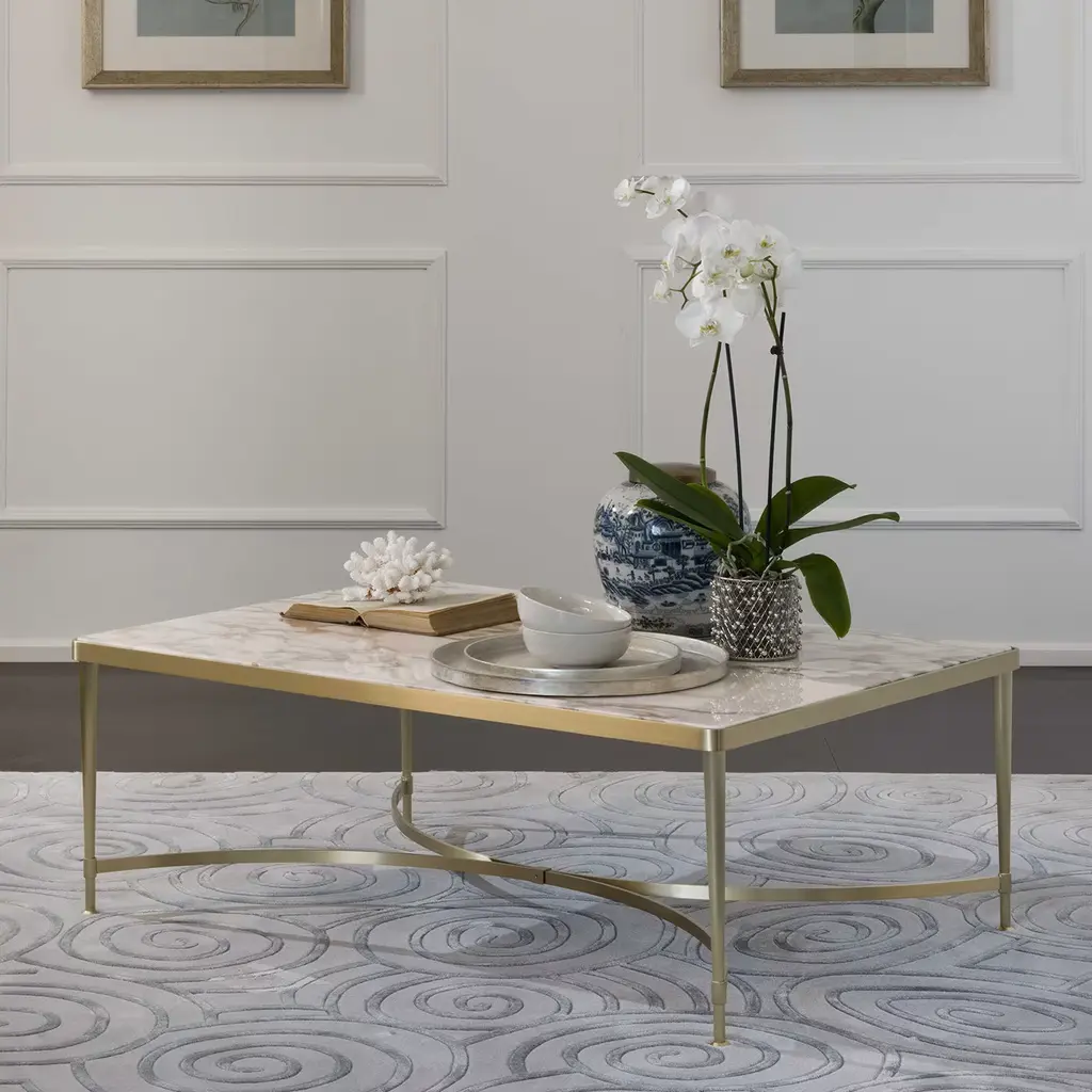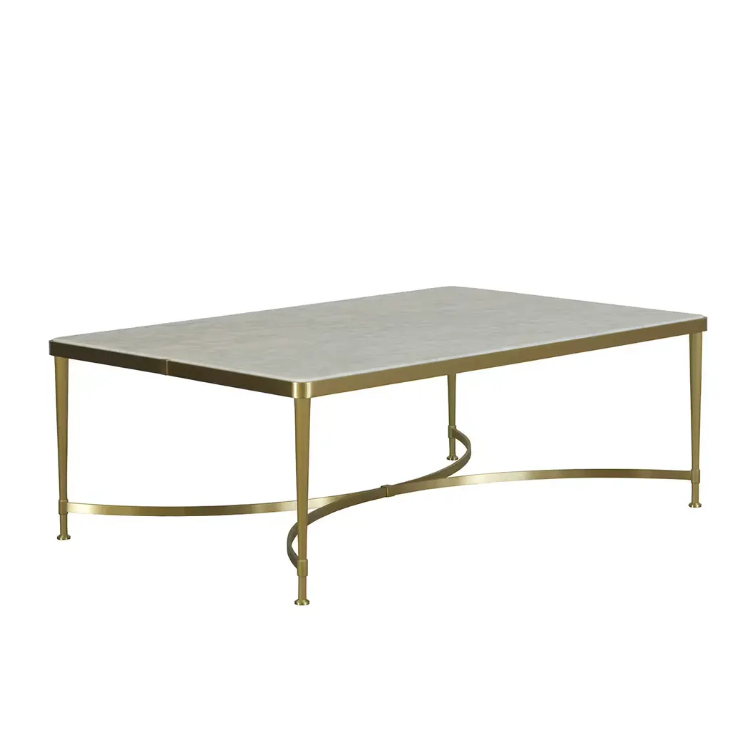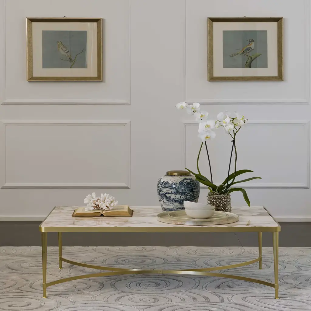 This sophisticated coffee table boasts a timeless color combination, elegant design, and high quality materials for a look that will enrich both a contemporary and a traditional setting. The rectangular marble top, with a polyester varnish is mounted into a setting in brass with a satin finish. The same metal is used for the four straight legs, connected at the bottom with a pair of sinuous curves. This refined piece can be displayed alone or combined with the others in the same Ferrando collection.