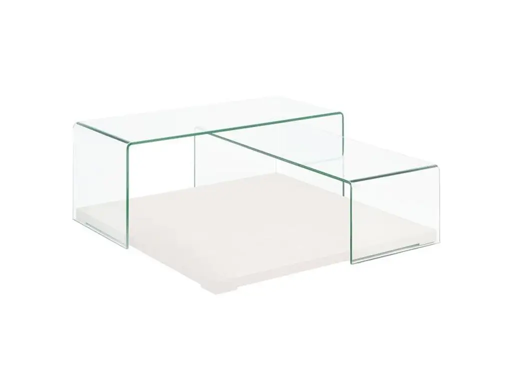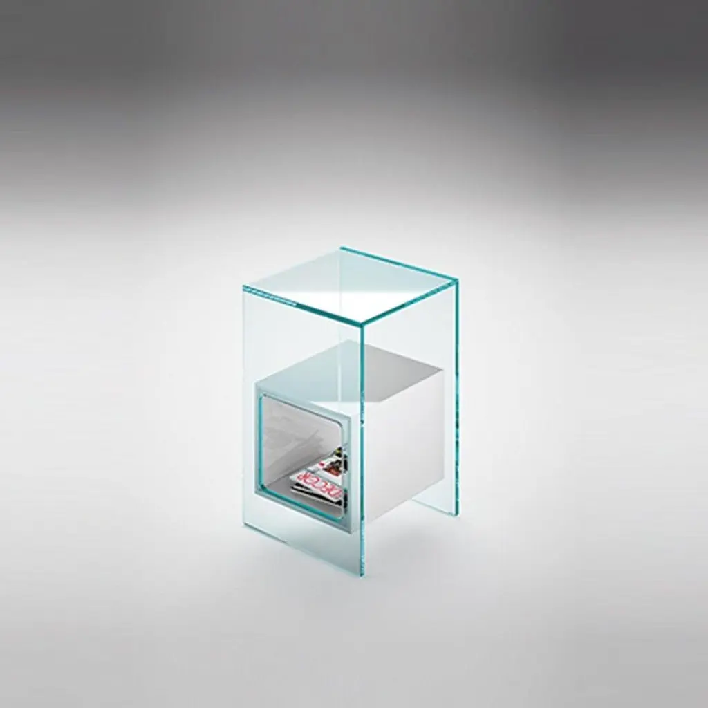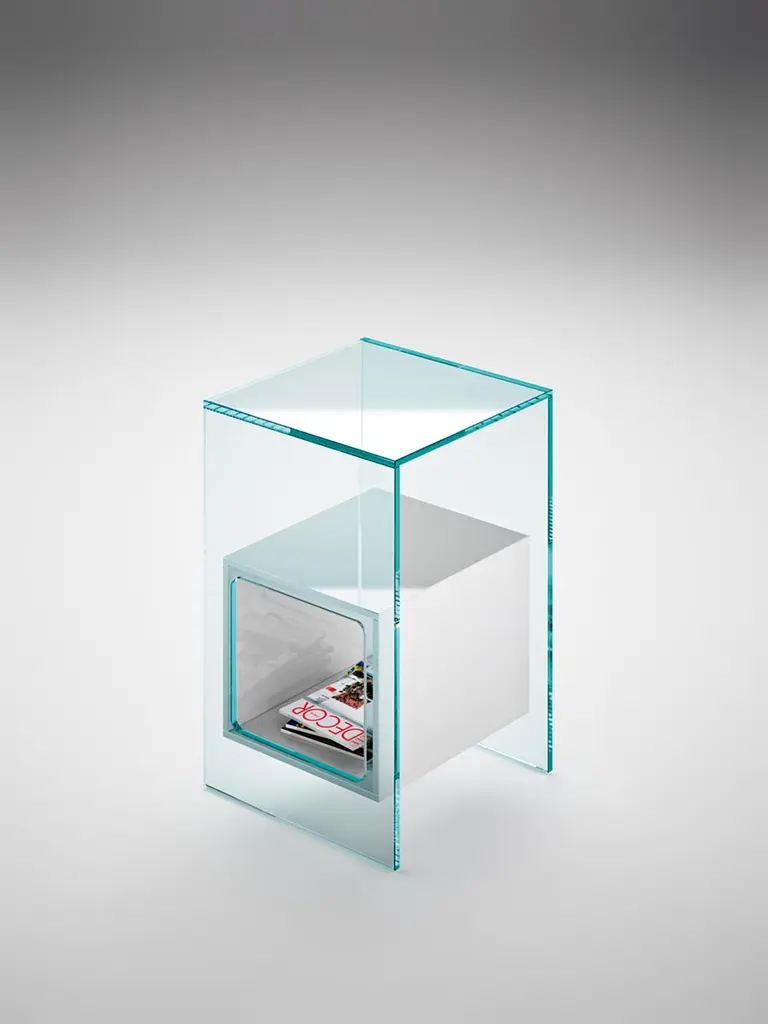 Coffee table with cubic inner compartment in 10 mm-thick glass. Available in various finishes. Extralight glass structure, opal white glass cube.