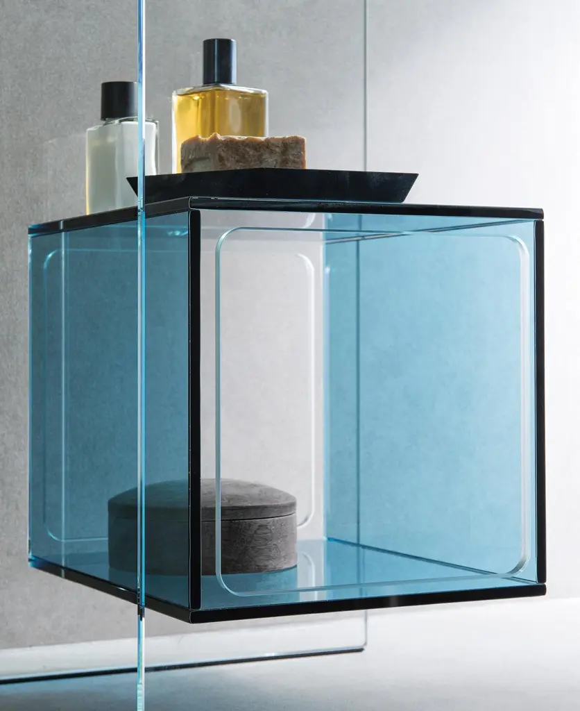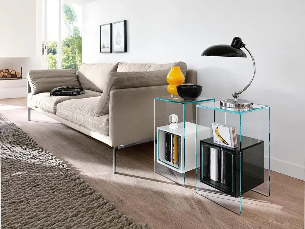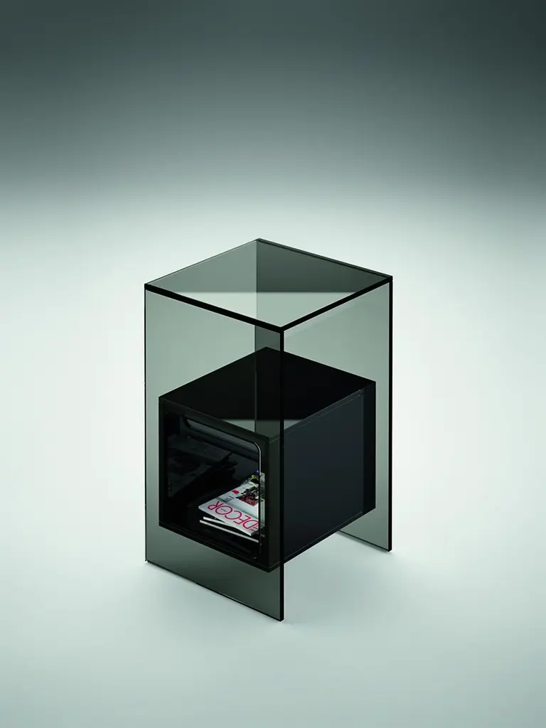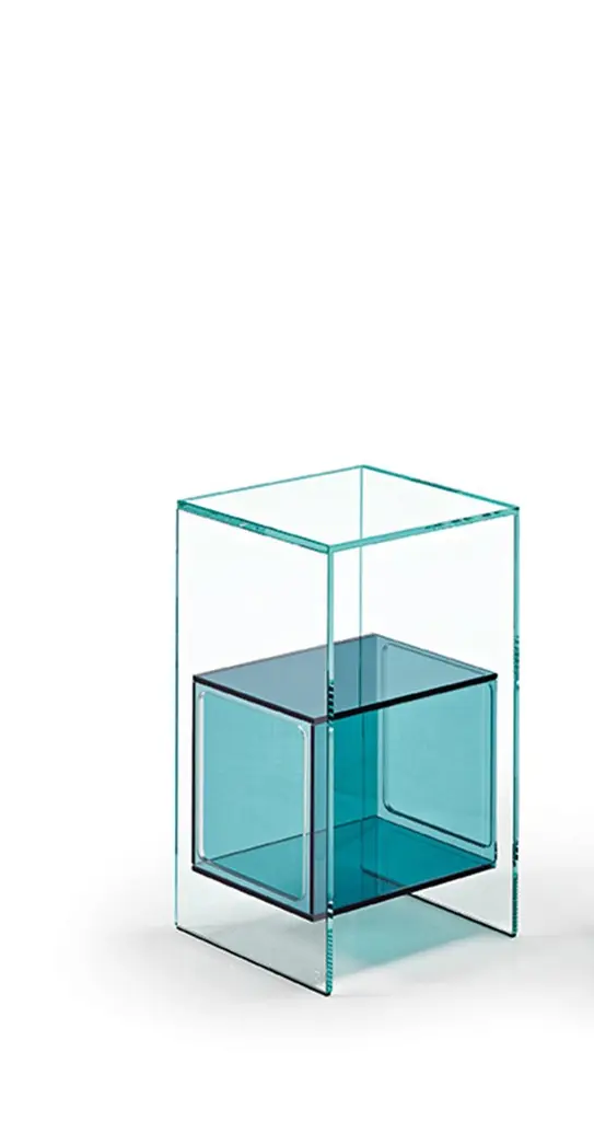 Coffee table with cubic inner compartment in 10 mm-thick glass. Available in various finishes. Extralight glass structure, blue glass inner compartment.
