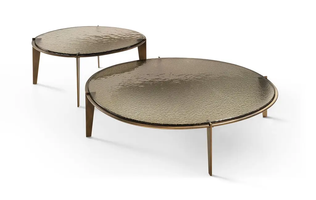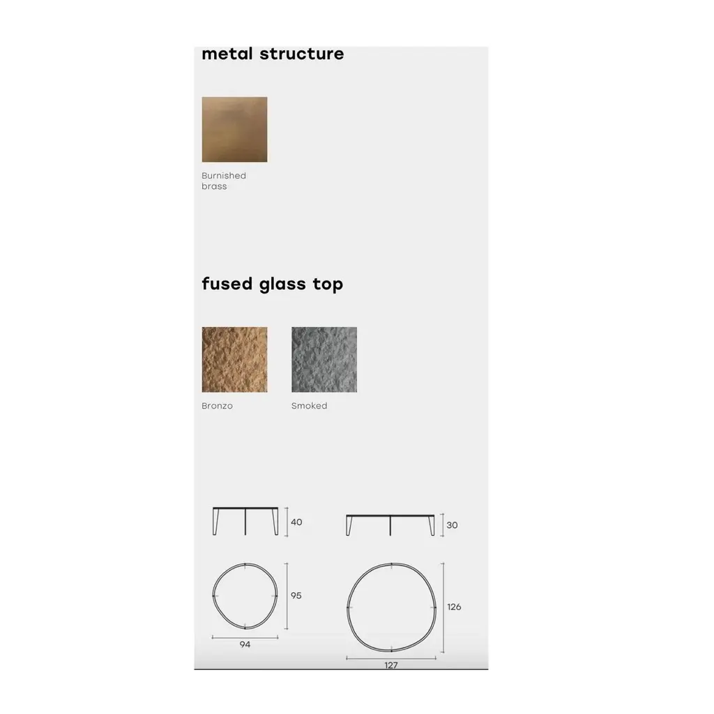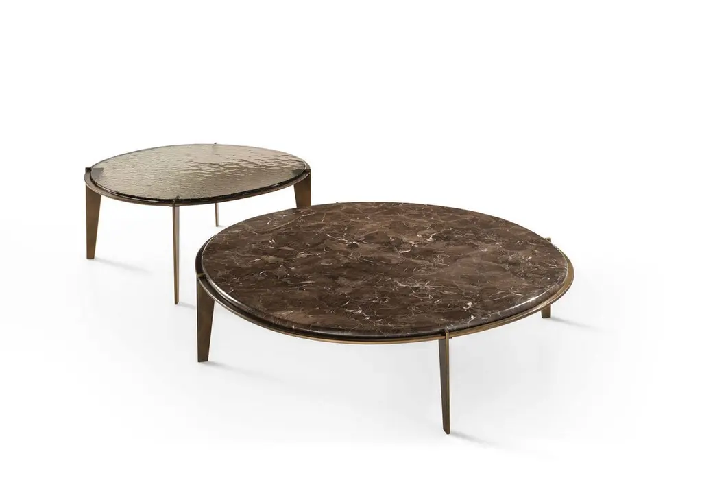 Coffee table with top in 10 mm fused and tempered glass, smoked or bronze finishes.Top available also in marble.Burnished Brass finish metal base.load capacity on top: 30 kg