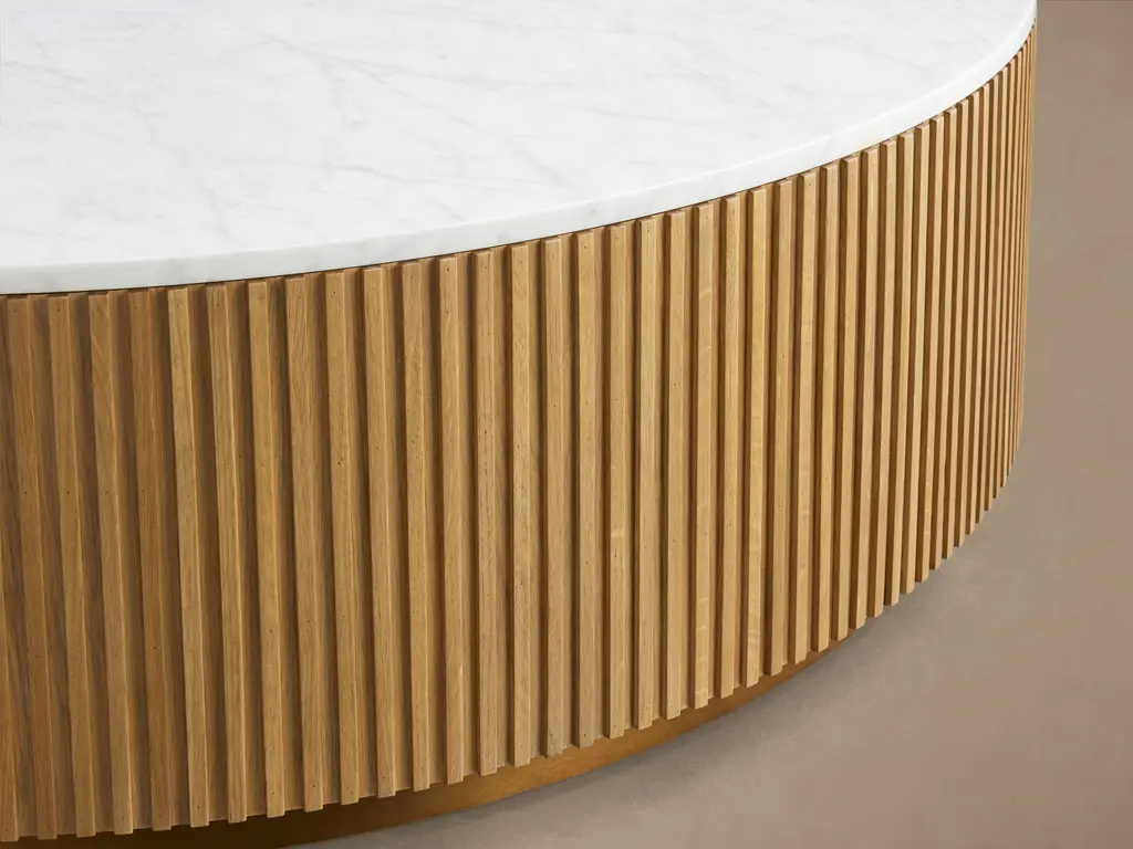 Our Finnley Collection showcases a stunning mixed-material design, inviting elevated style into any room in your home. Hand-finished pine from Finland is luxuriously complemented by stone tops, accented by light brass plinth bases and reeded oak detailing. The result is an eclectic-yet-chic collection that easily fits into any aesthetic.