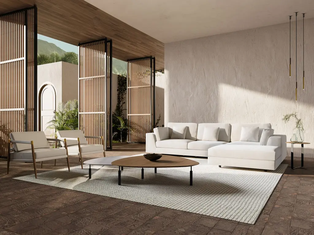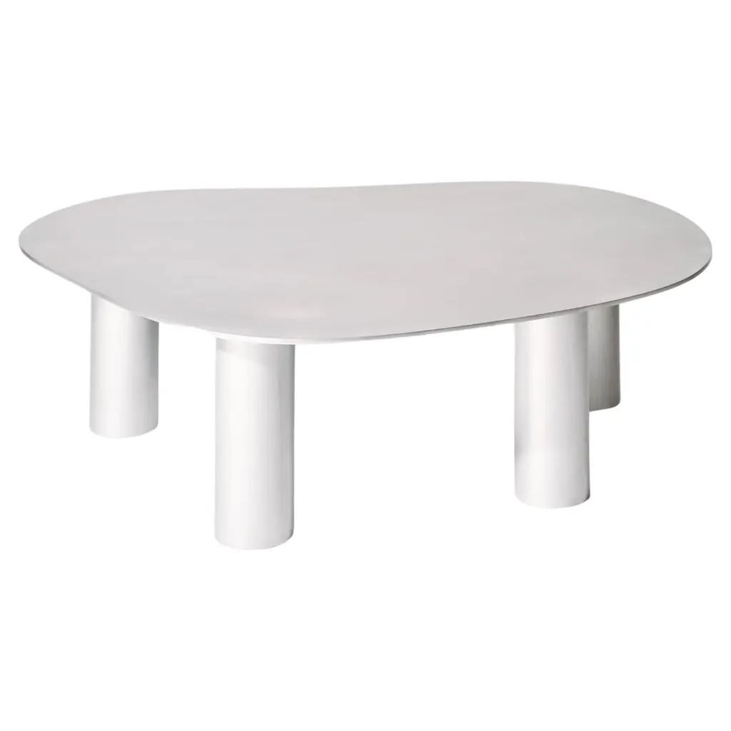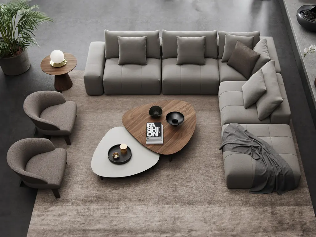 Adorned with gracefully tapered, triangular forms reminiscent of guitar picks, the Finsbury coffee tables feature exquisitely slender surfaces adorned with a warm fusion of wood and lacquer, creating an ambiance that exudes a welcoming allure.Beneath, three matte-finished aluminum legs, confer a stately and robust underpinning to the surfaces above. The harmonious interplay of metal embellishments, wooden and lacquered finishes, and architectural design imparts an elegant and refined contrast to the ensemble's collective presence.