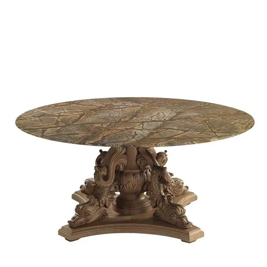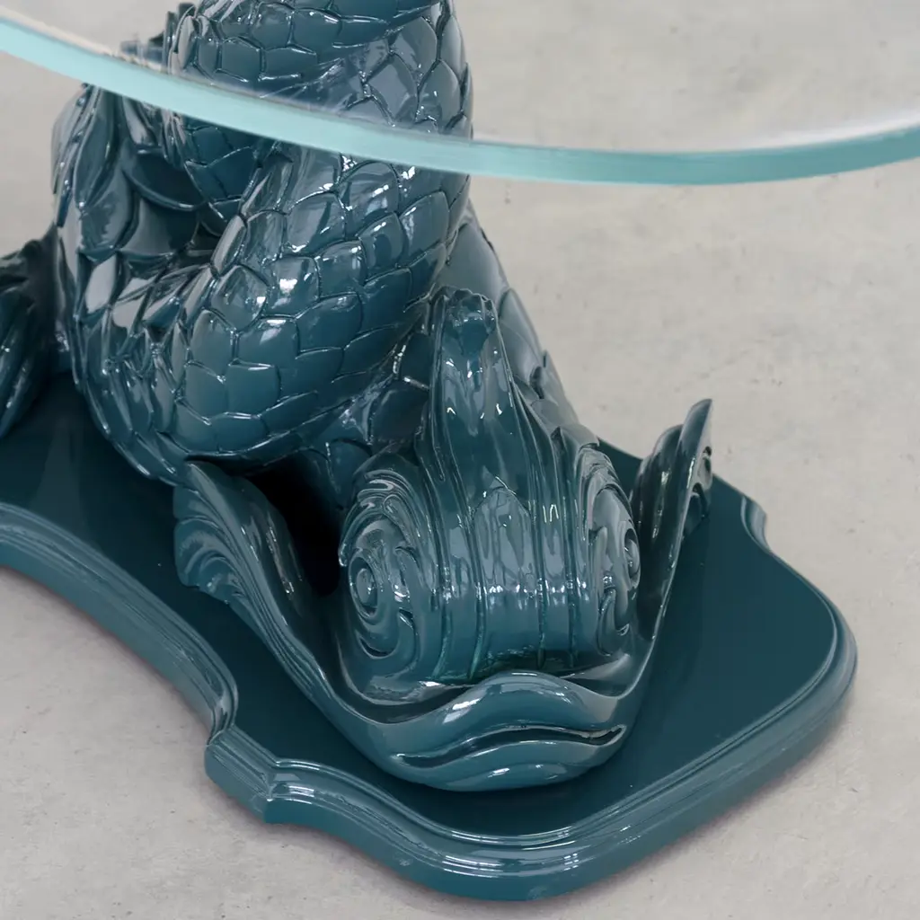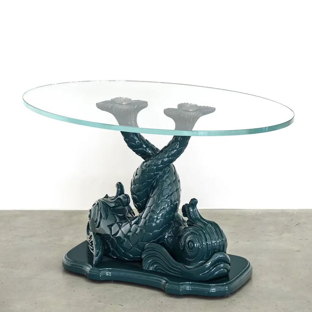 A low coffee table with an ironic interpretation of a lacquered wood base presents the figure of two fishes and is completed by a glass top. The top is fixed with two nickel-plated brass elements.