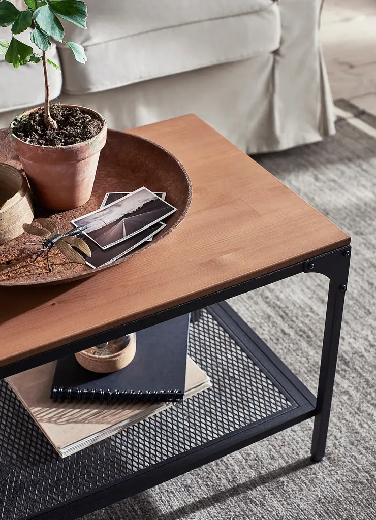 FJÄLLBO Coffee table - black 35 3/8x18 1/8 ". This rustic metal and solid wood coffee table has a shelf for magazines so you always have them close at hand. Wood is a natural living material, and variations in the grain, color and texture makes each piece of wood furniture unique. Part of a series.