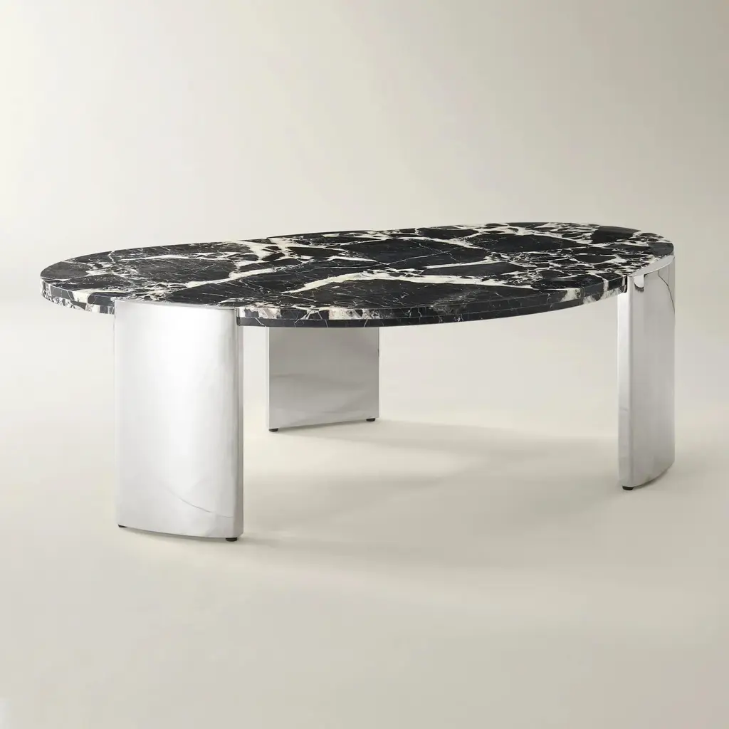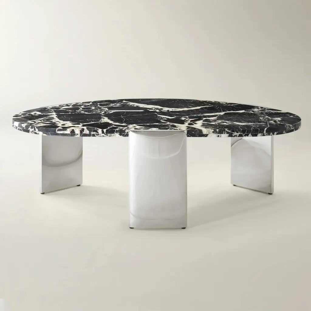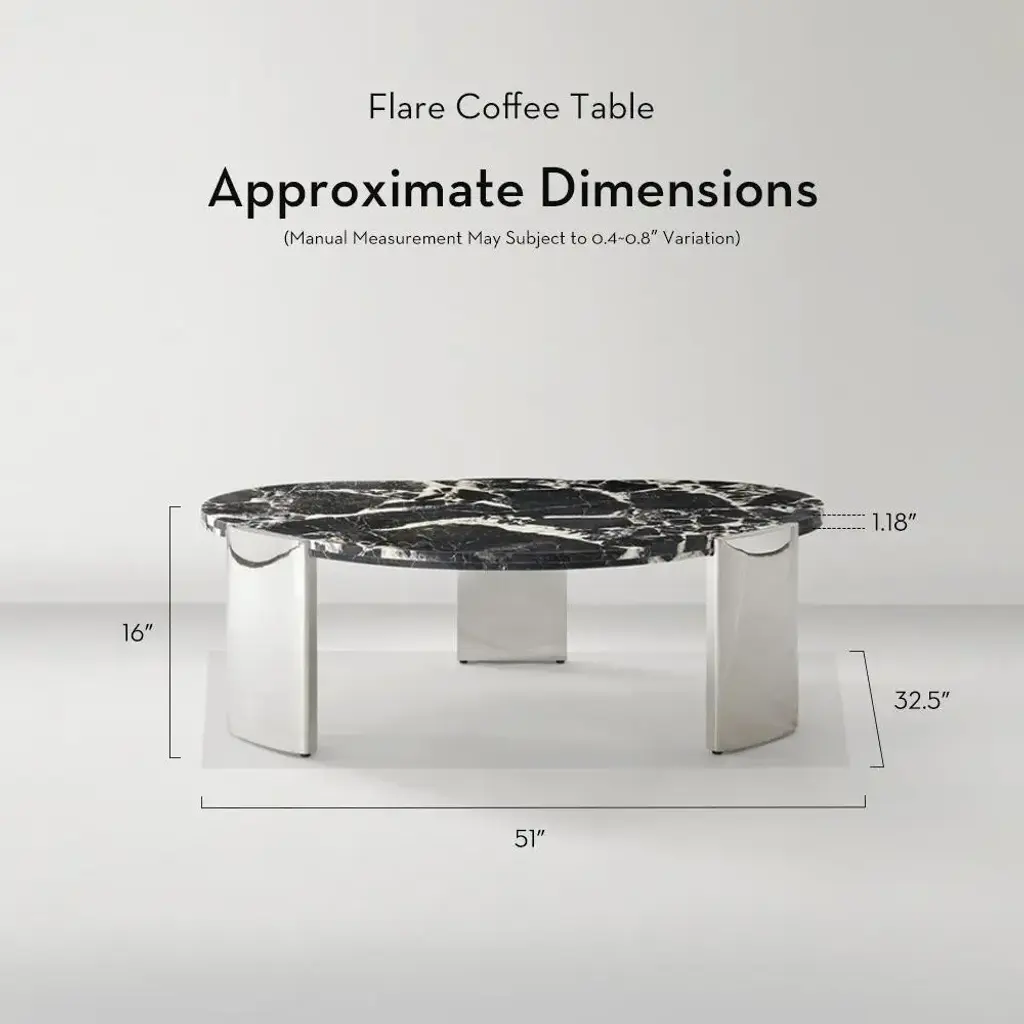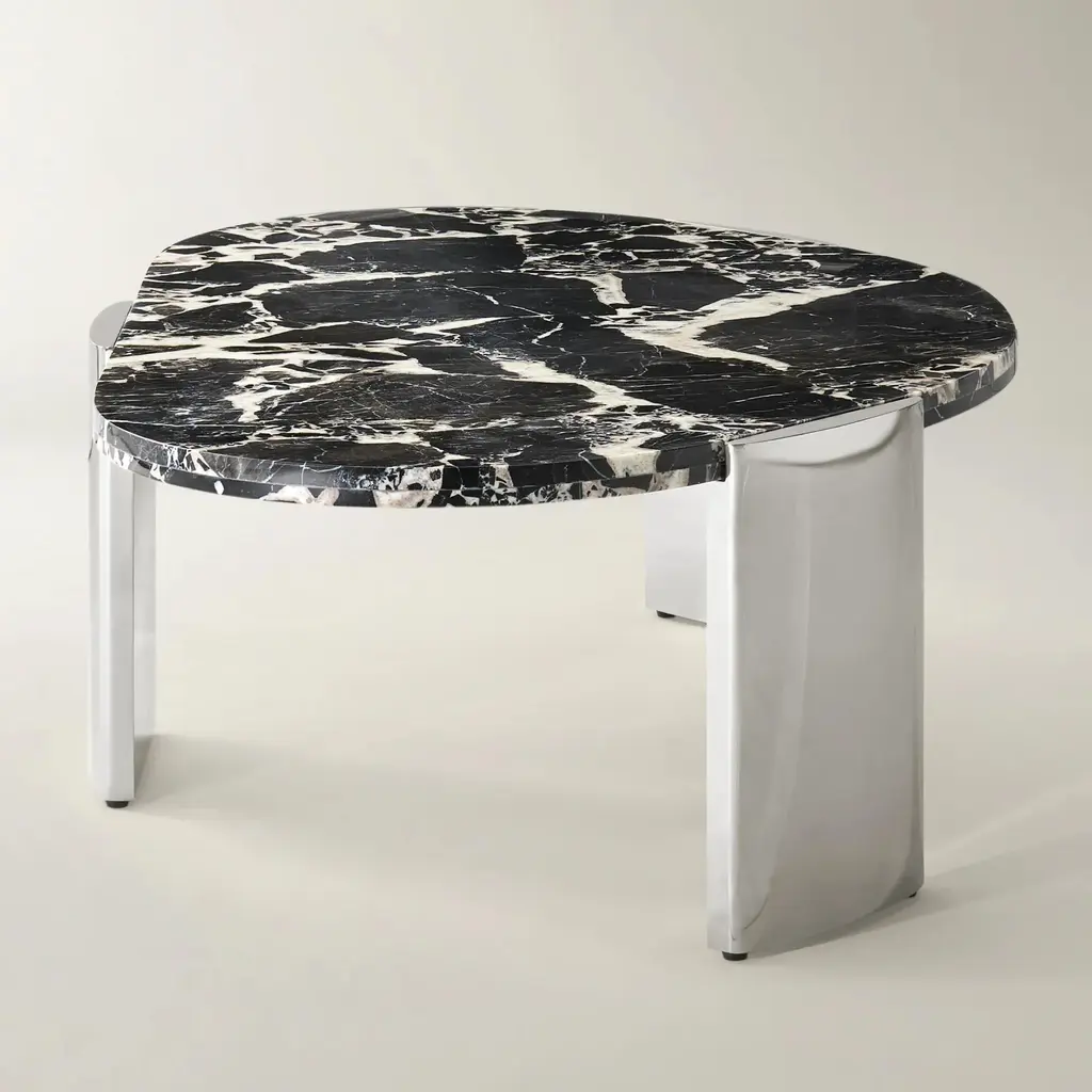 Make a bold statement with the Flare Coffee Table in Black. Its organic, crescent-shaped Bvlgari black marble top brings dramatic elegance to your space, while the polished stainless steel base offers a modern sculptural touch. Perfect for entertaining or as a focal point, this piece transforms any living room into a luxurious retreat.ZG Exclusive