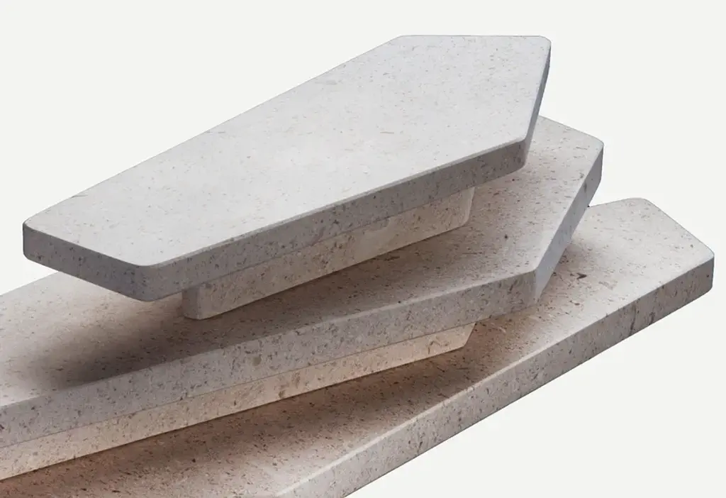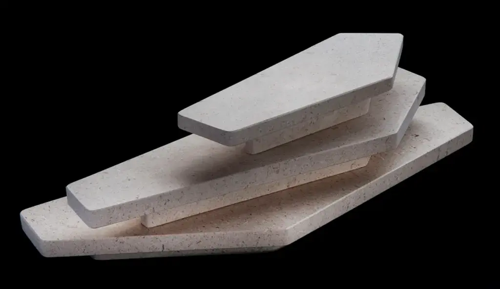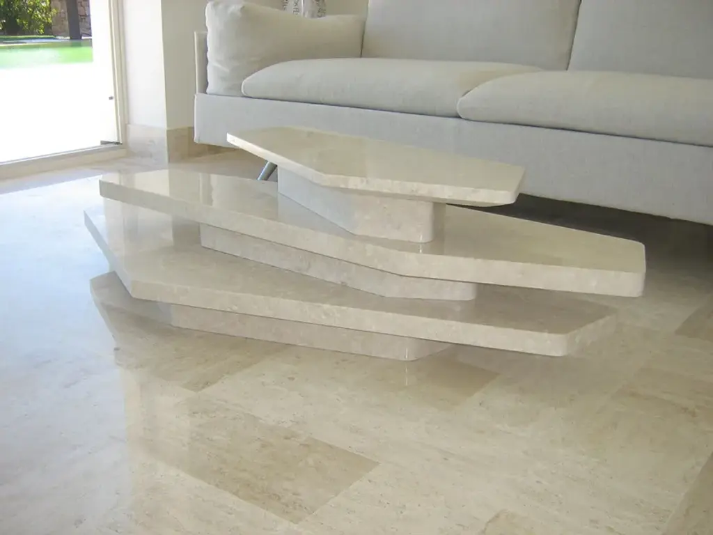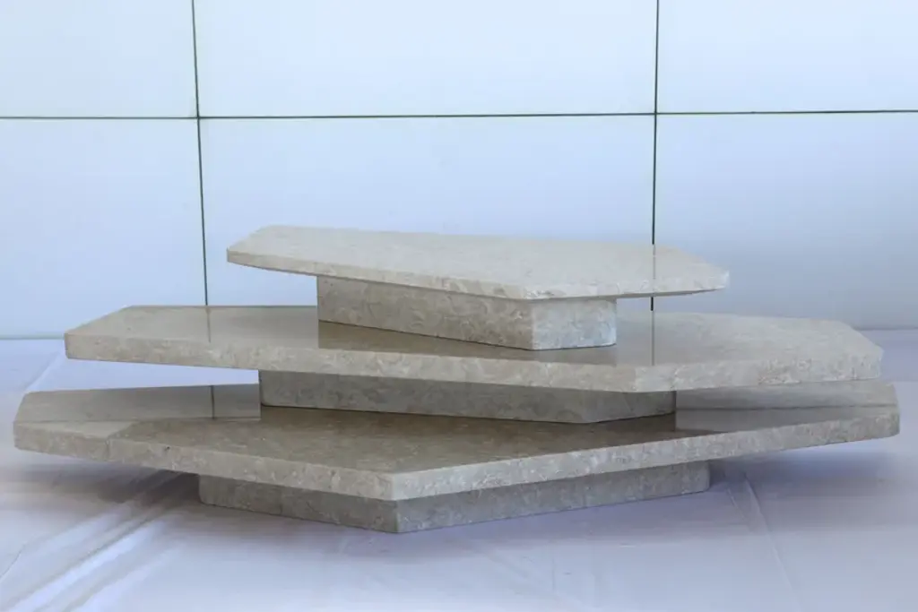 Composed of overlapping tops of different sizes that seem to float in the void, Flat Table is a designer marble coffee table that is light and airy. The floating effect of the tops is rendered by the inward beveling of the edges, which leave an outer thickness of about 1 cm. Flat Table is ideal for use as a side table to add a touch of exclusivity to the living room. Proposed using Veselye White, Flat Table can be customized according to the customer's wishes. It is possible to choose the material to make it more akin to the type of use and the environment in which it will be placed. Variations in color or slight imperfections are the result of the craftsmanship of this article and are not to be considered defects.
