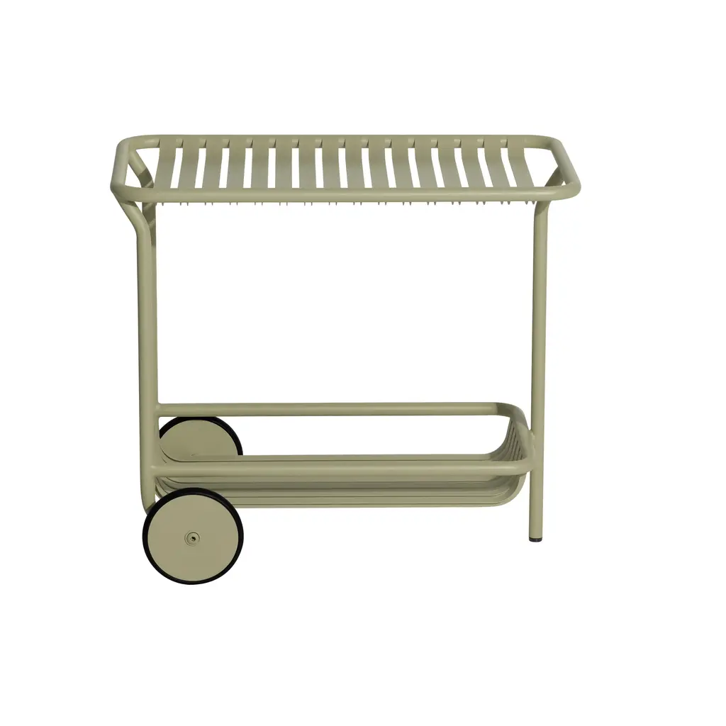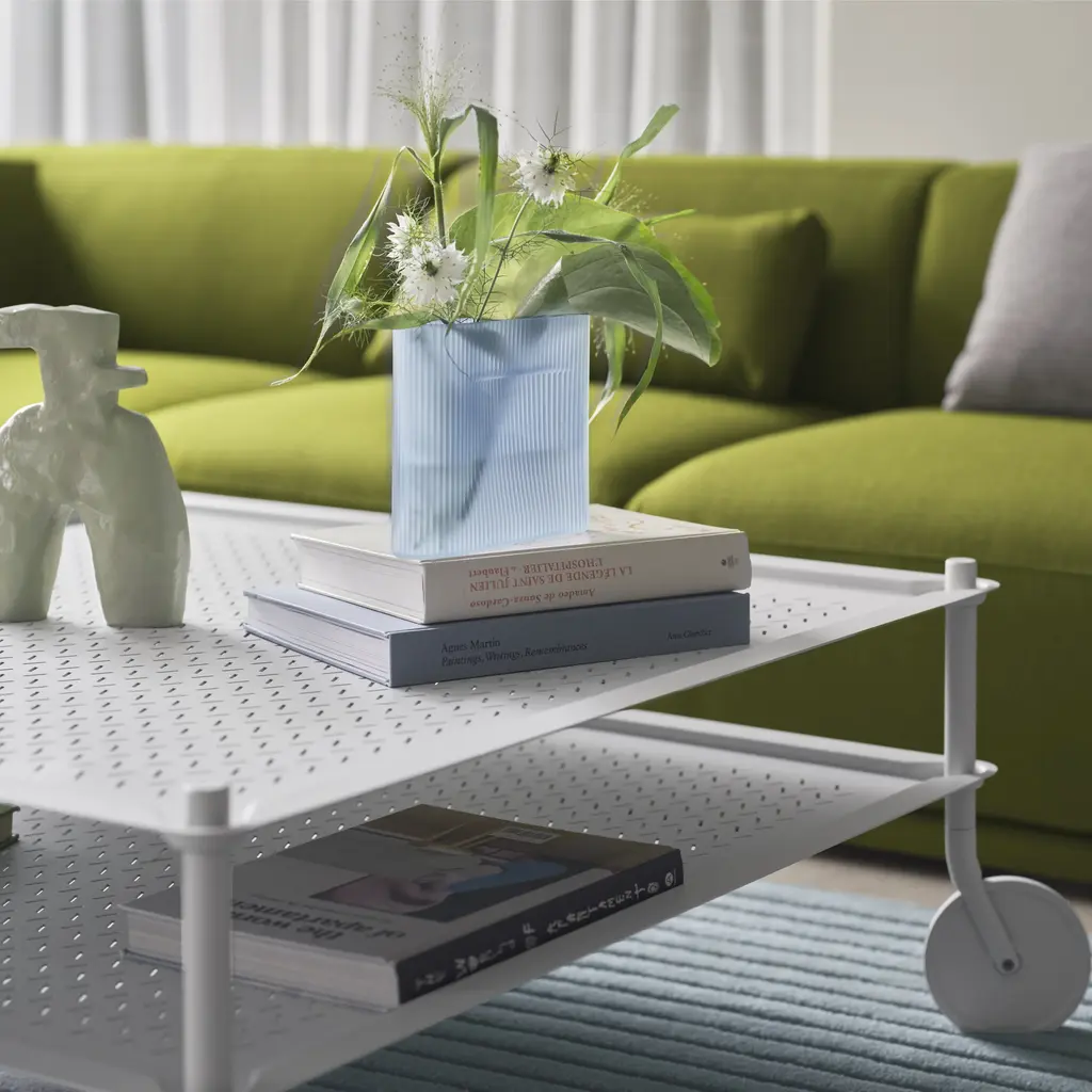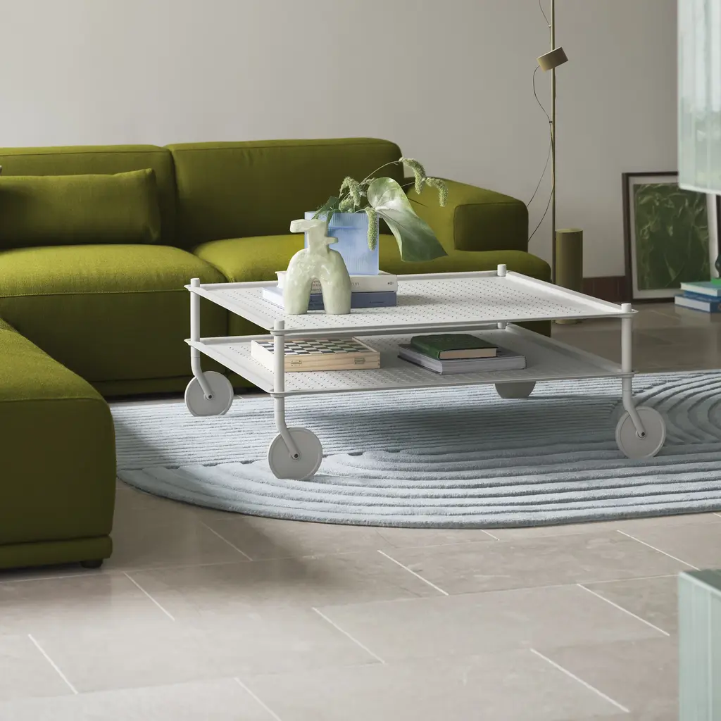 The Flow Coffee Table is crafted from molded metal sheets, featuring a distinctive two-layer structure with perforations that create a light and open look. Durable rubber and steel wheels ensure smooth and quiet movement, making it easy to use in both indoor and outdoor spaces. The table is available in grey and taupe finishes.