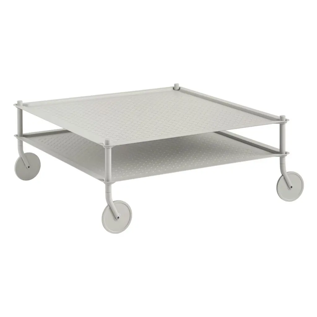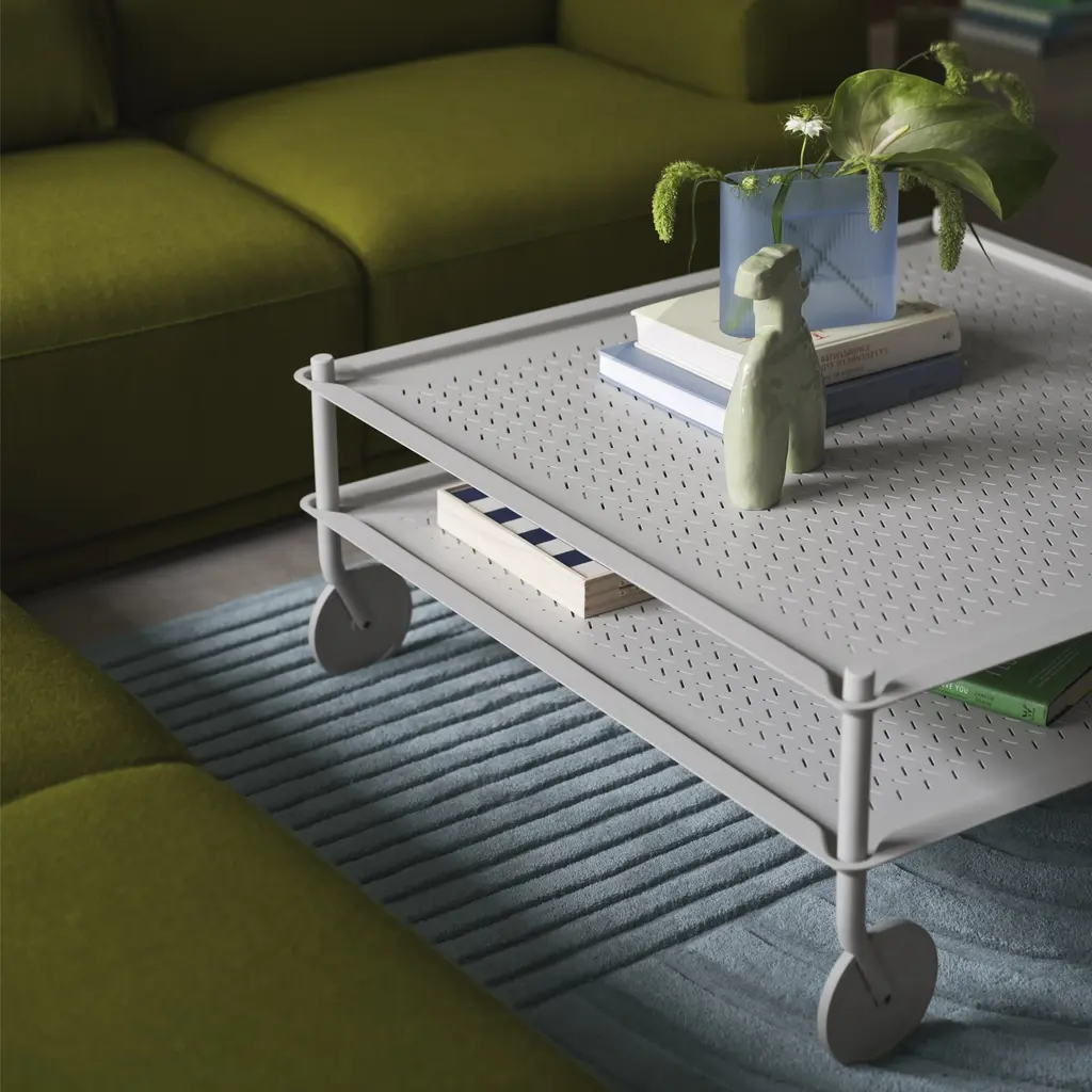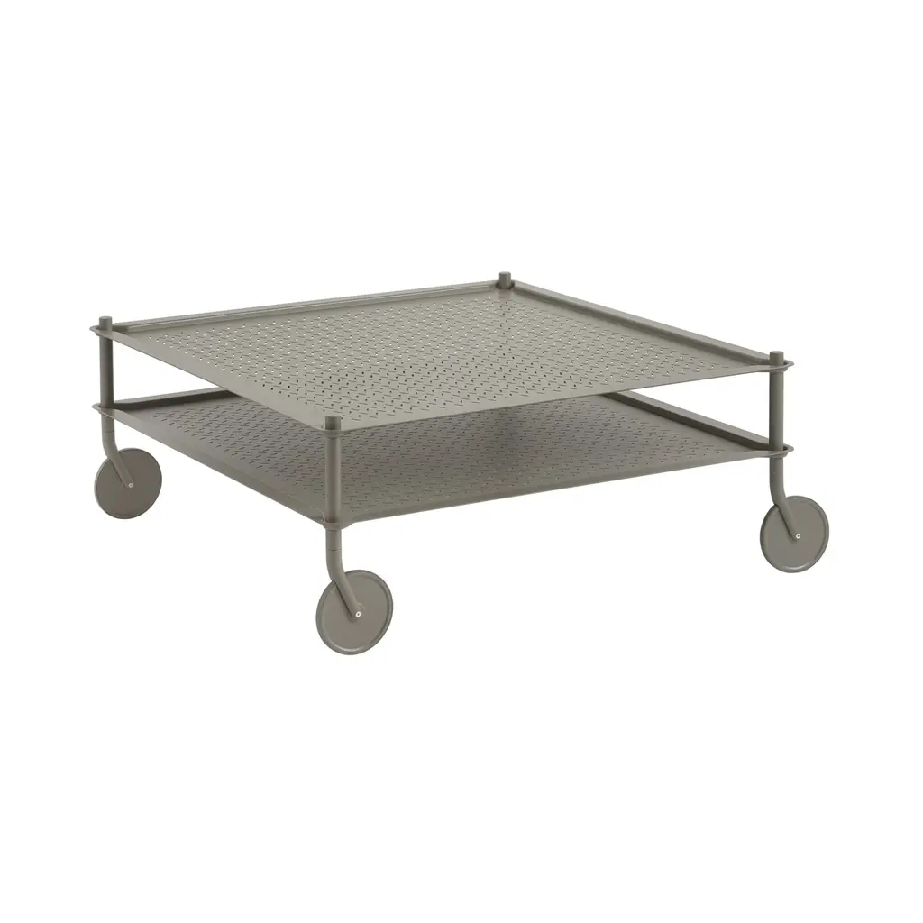 The Flow Coffee Table is crafted from molded metal sheets, featuring a distinctive two-layer structure with perforations that create a light and open look. Durable rubber and steel wheels ensure smooth and quiet movement, making it easy to use in both indoor and outdoor spaces. The table is available in grey and taupe finishes.
