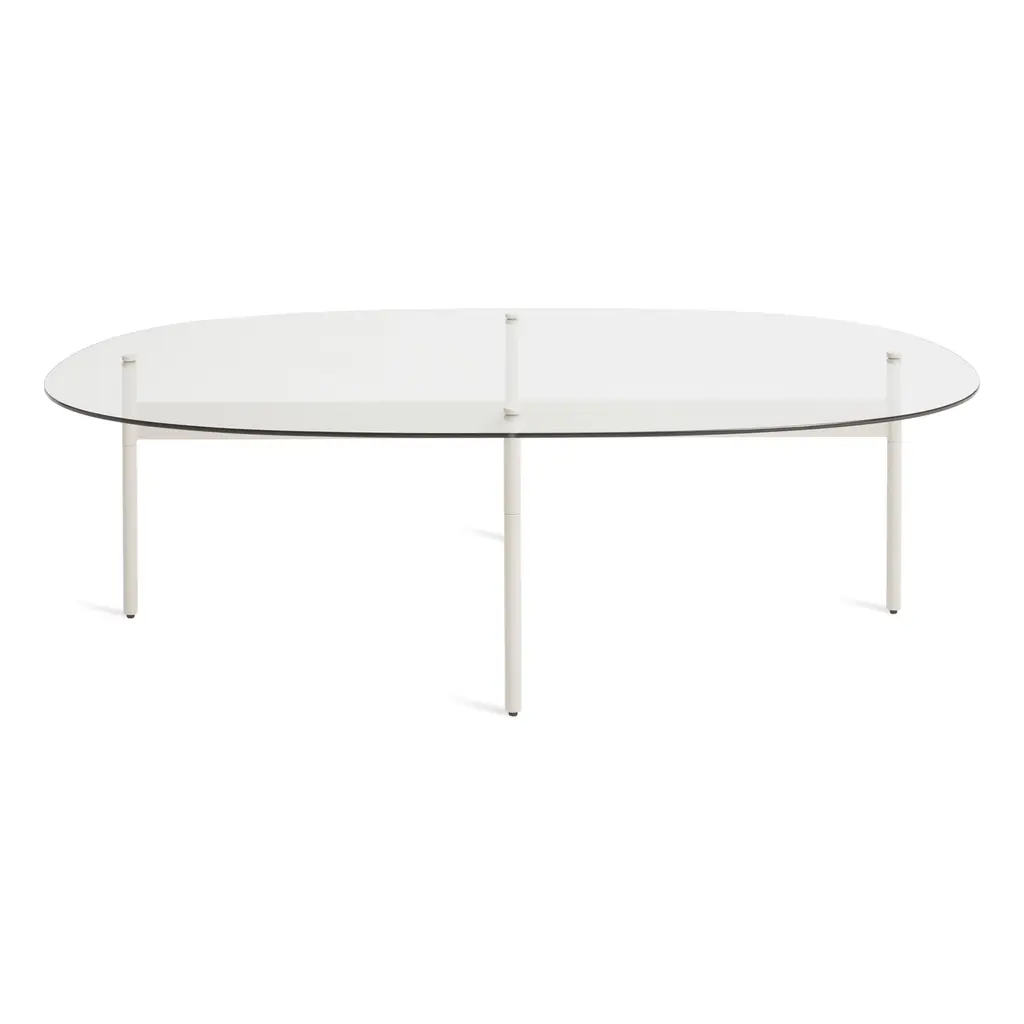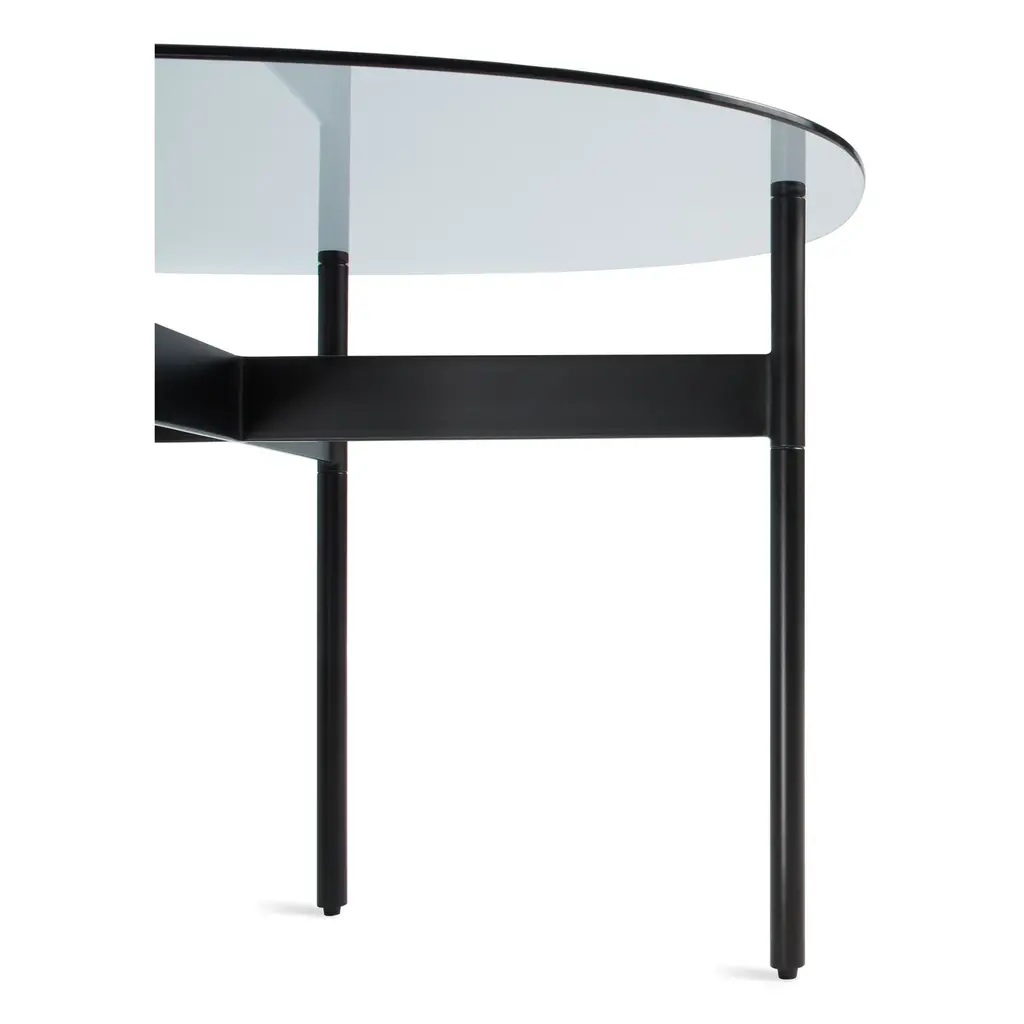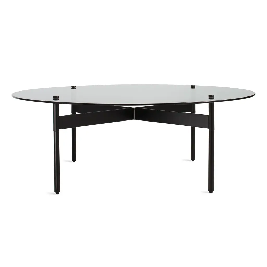 Oval and round glass tops get eye-catching support from a crisp architectural powder-coated steel base. The Flume table legs cleverly and unobtrusively attach through the tempered glass top to create an understated yet winsome detail. Side table and swoval coffee table also available.