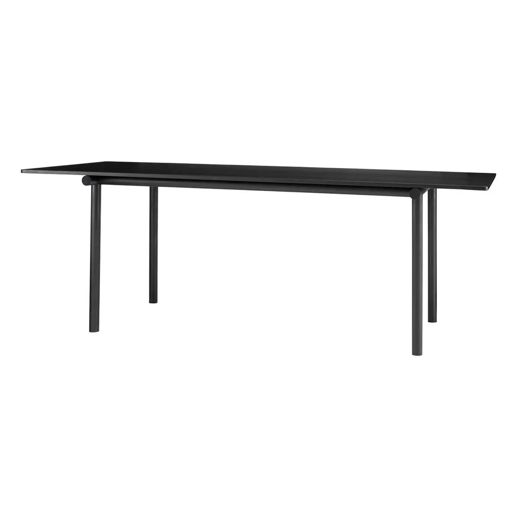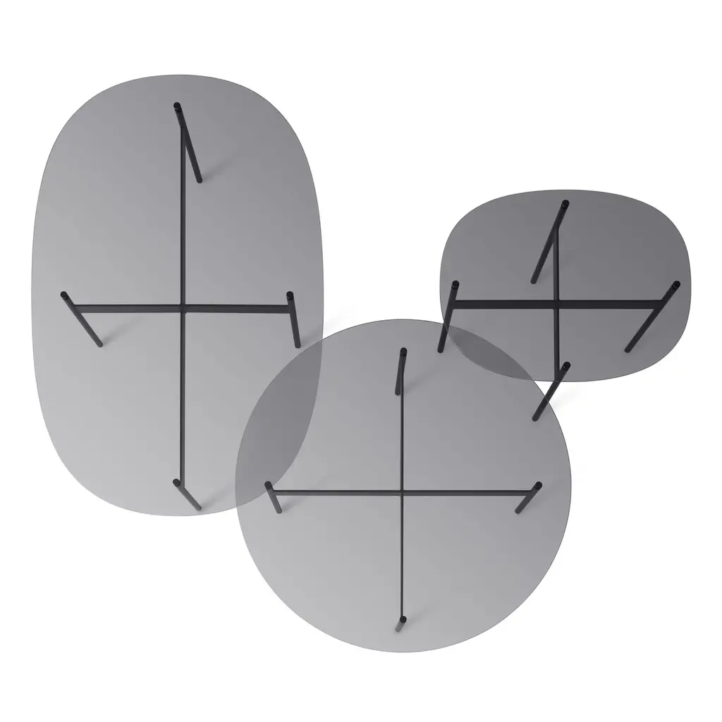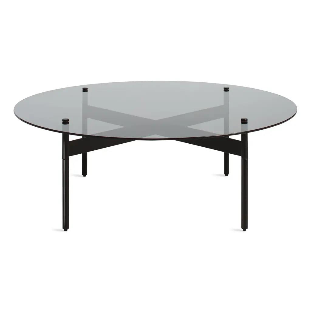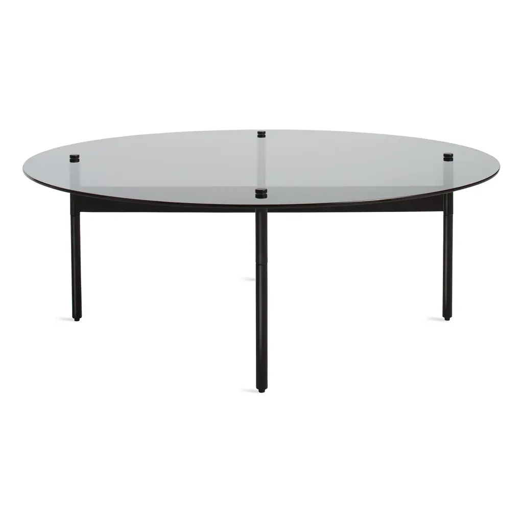 Oval and round glass tops get eye-catching support from a crisp architectural powder-coated steel base. The Flume table legs cleverly and unobtrusively attach through the tempered glass top to create an understated yet winsome detail. Side table and swoval coffee table also available.