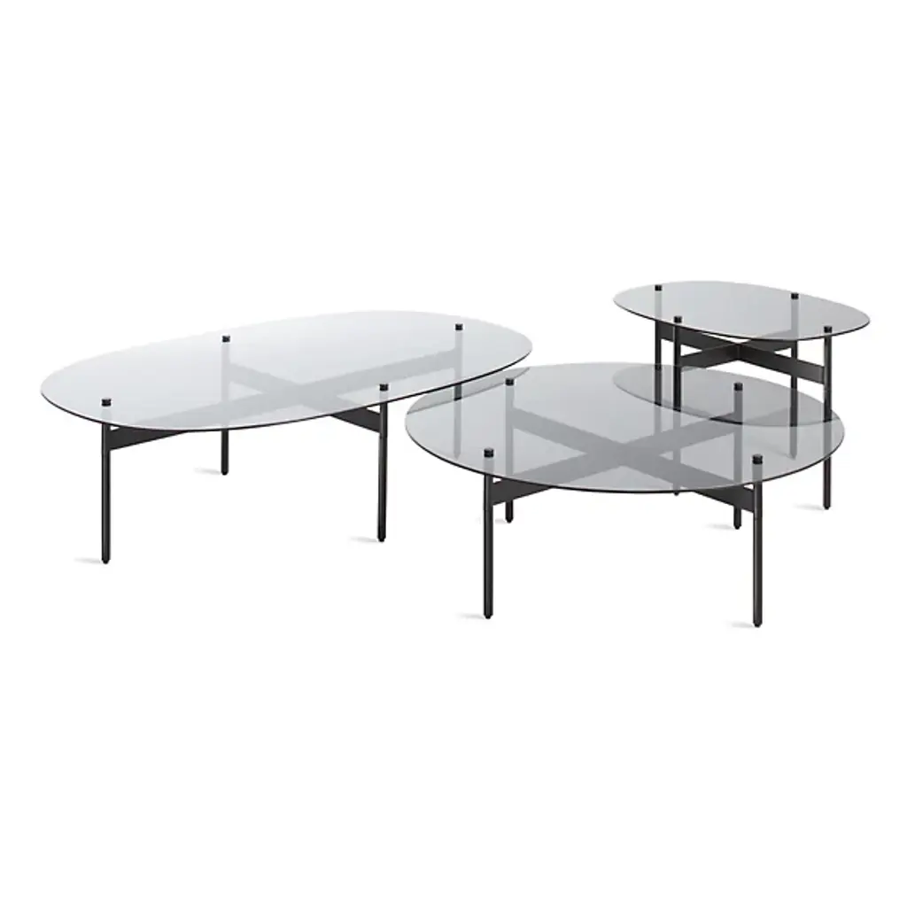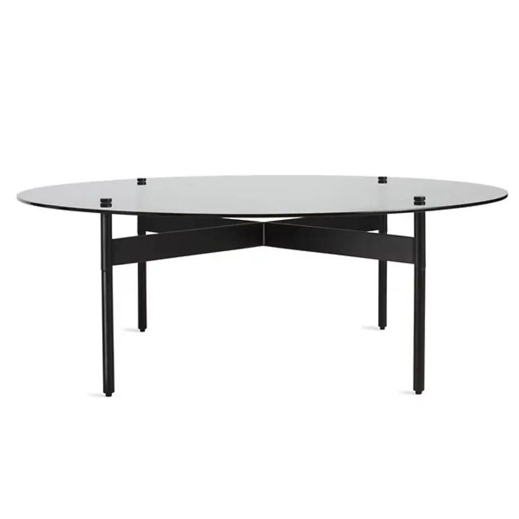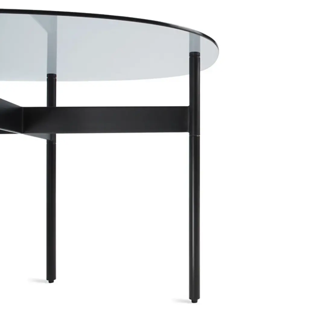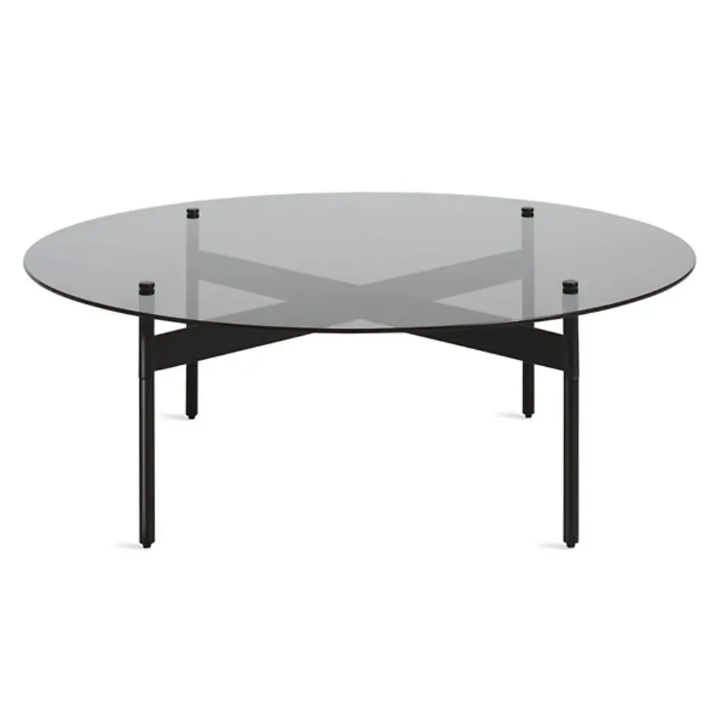 The Flume Round Coffee Table from Blu Dot connects its tempered glass top directly to the steel base through an innovative mounting system that eliminates traditional brackets. Its legs extend from a central stretcher to create a stable platform that feels architecturally precise rather than decorative. The glass surface allows light to pass through while maintaining enough opacity to soften reflections and reduce glare. Leveling feet ensure the table sits evenly on various floor surfaces, preventing wobbling that can occur with fixed legs.