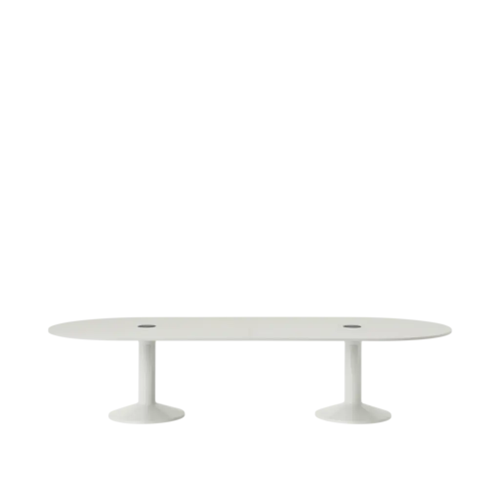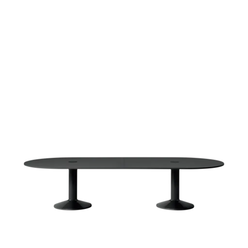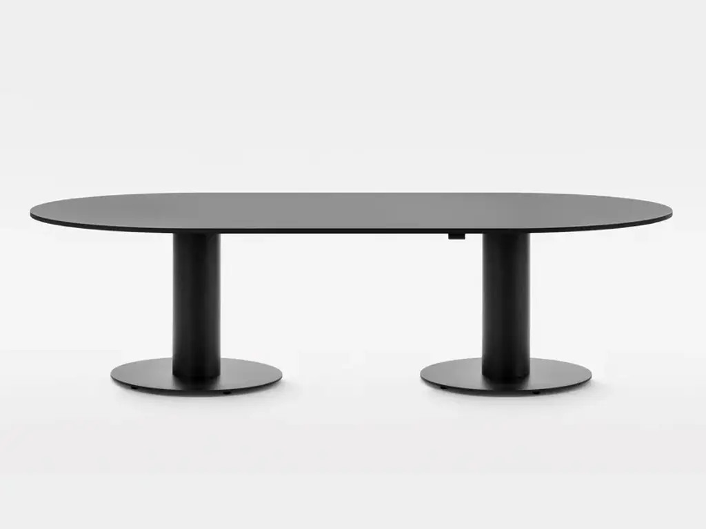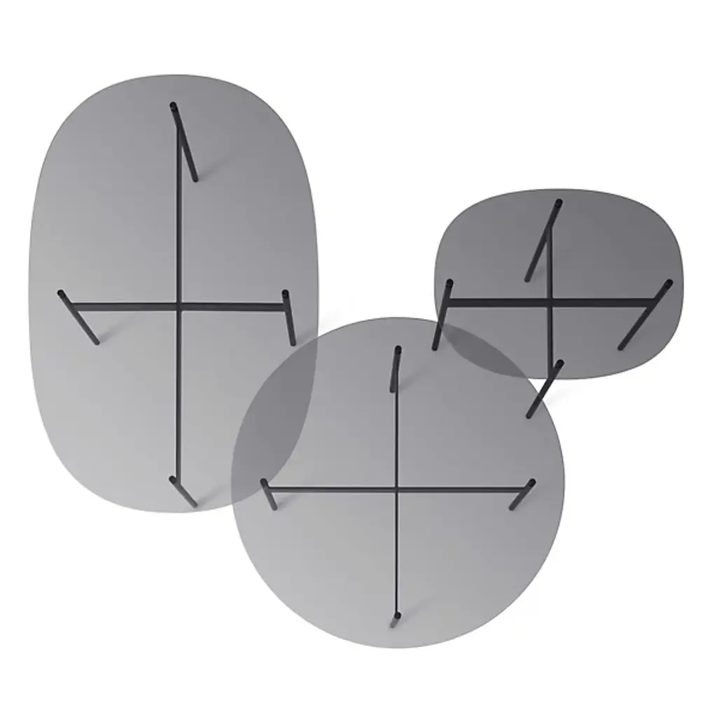 The Flume Round Coffee Table from Blu Dot connects its tempered glass top directly to the steel base through an innovative mounting system that eliminates traditional brackets. Its legs extend from a central stretcher to create a stable platform that feels architecturally precise rather than decorative. The glass surface allows light to pass through while maintaining enough opacity to soften reflections and reduce glare. Leveling feet ensure the table sits evenly on various floor surfaces, preventing wobbling that can occur with fixed legs.