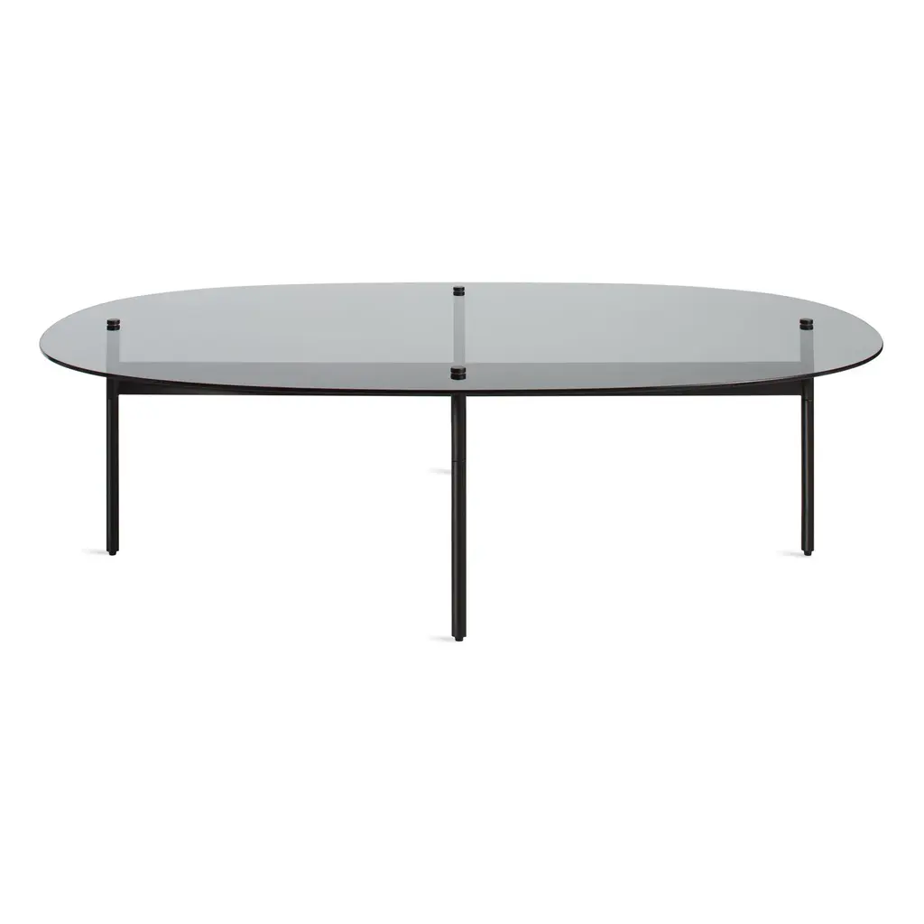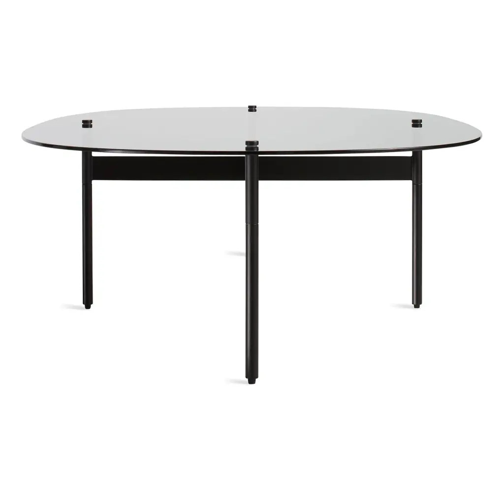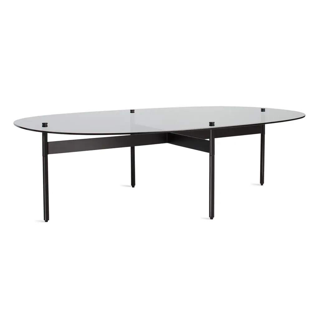 Oval and round glass tops get eye-catching support from a crisp architectural powder-coated steel base. The Flume table legs cleverly and unobtrusively attach through the tempered glass top to create an understated yet winsome detail. Side table also available.
