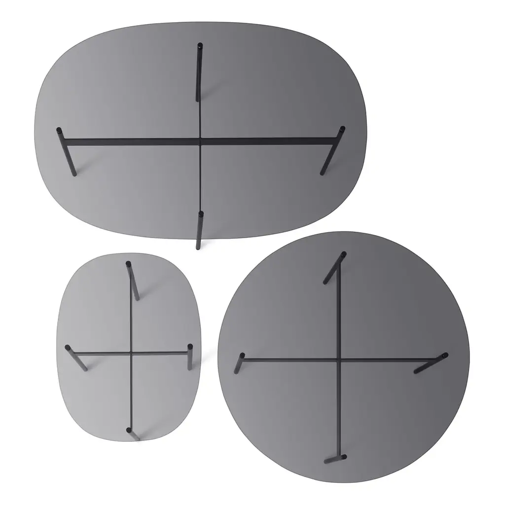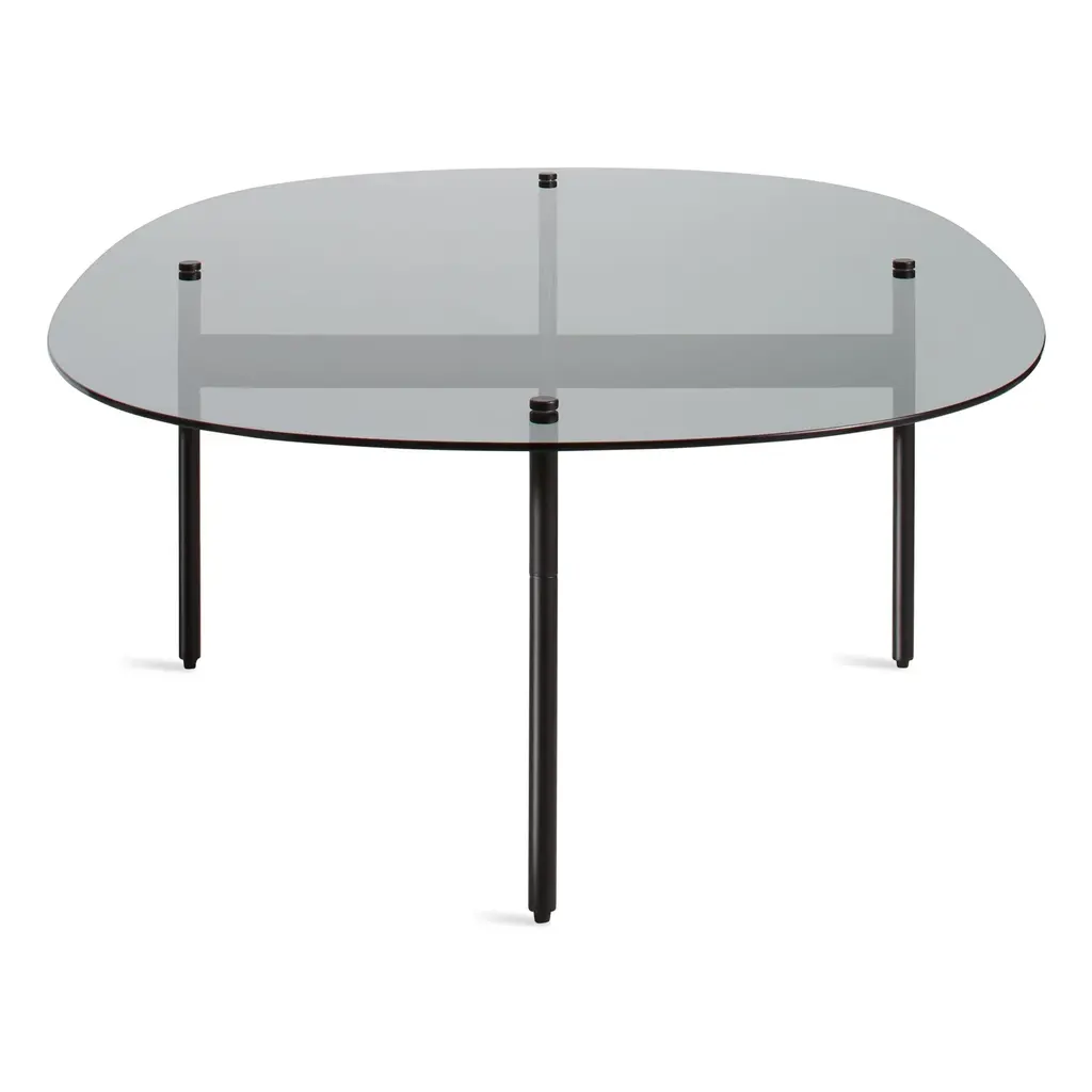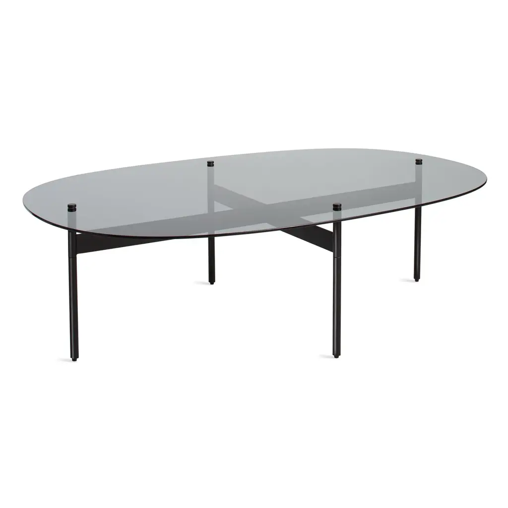 Oval and round glass tops get eye-catching support from a crisp architectural powder-coated steel base. The Flume table legs cleverly and unobtrusively attach through the tempered glass top to create an understated yet winsome detail. Side table also available.