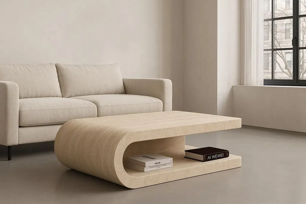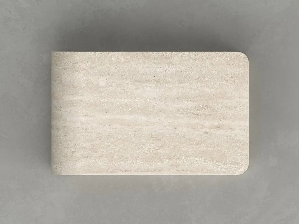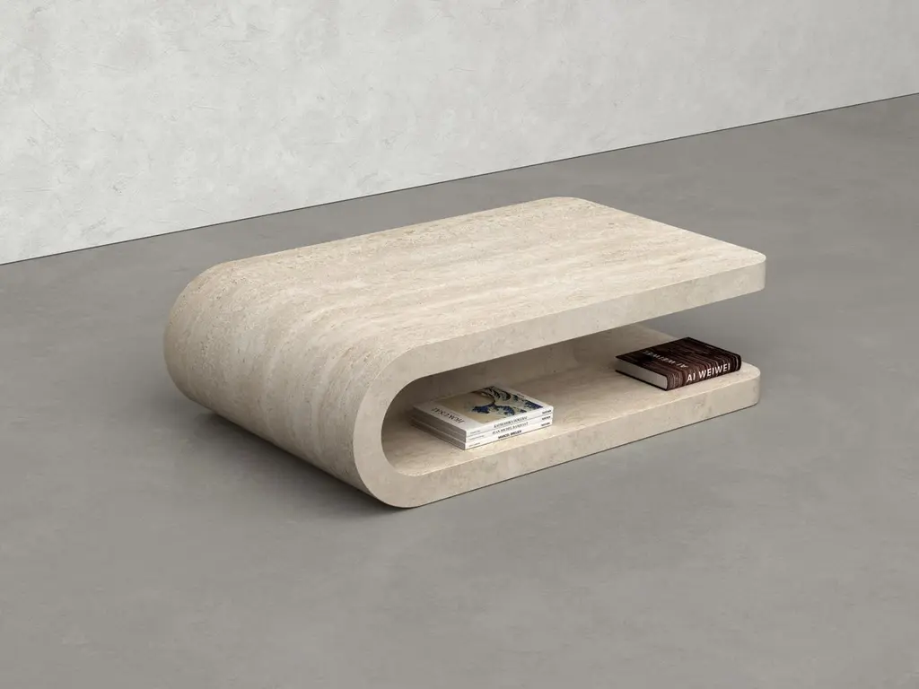 Carved from a single block of Classic Roman Travertine, Fold embodies the seamless unity of material and form.Its geometry challenges perception, making the rigid stone appear as if it were gently folded. This illusion of softness contrasts beautifully with the inherent weight and strength of travertine and its creation is made possible through advanced CNC machining, achieving precise curves and smooth transitions.The finishing is meticulously executed by hand, enhancing the stone’s natural texture and warm tones. Its generous lower shelf, integrated into the design, offers a practical space for books or objects. The continuous, fluid lines create a sculptural presence in any interior setting.Both a functional piece and a work of art, it reflects mastery in contemporary stone craftsmanship. A timeless design where innovation and tradition meet in perfect balance.Fold is 100% crafted in Italy