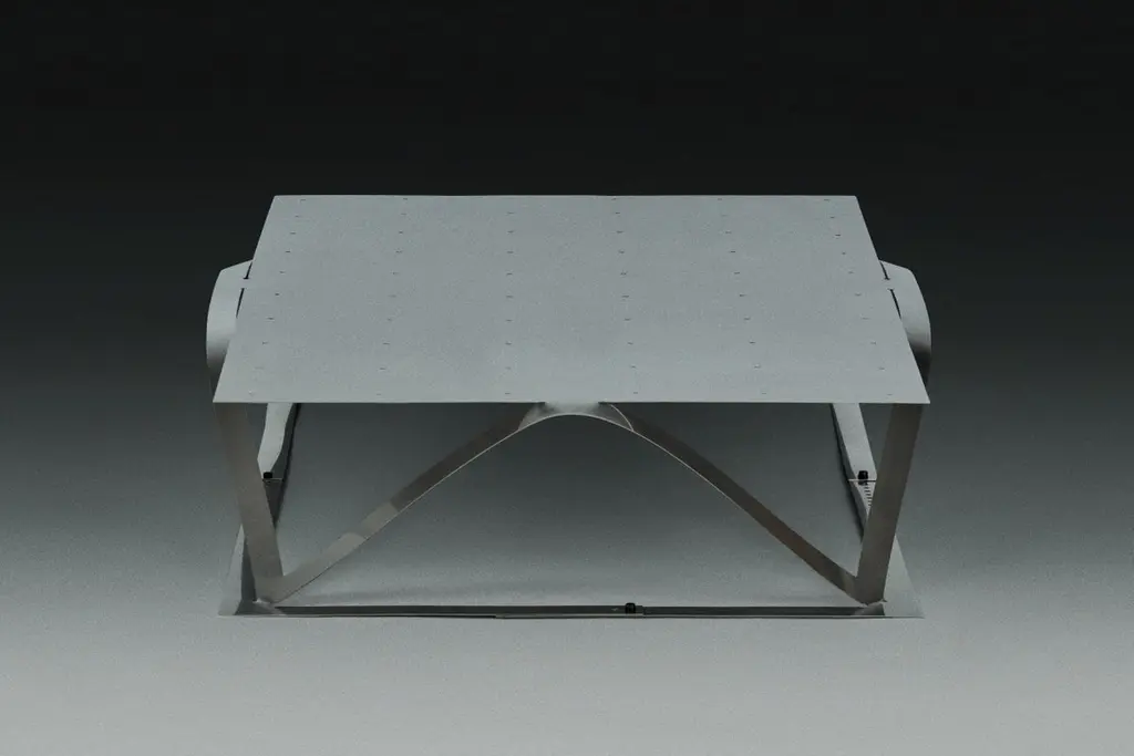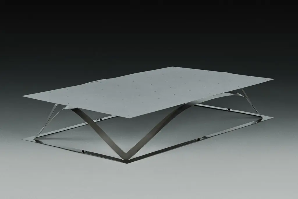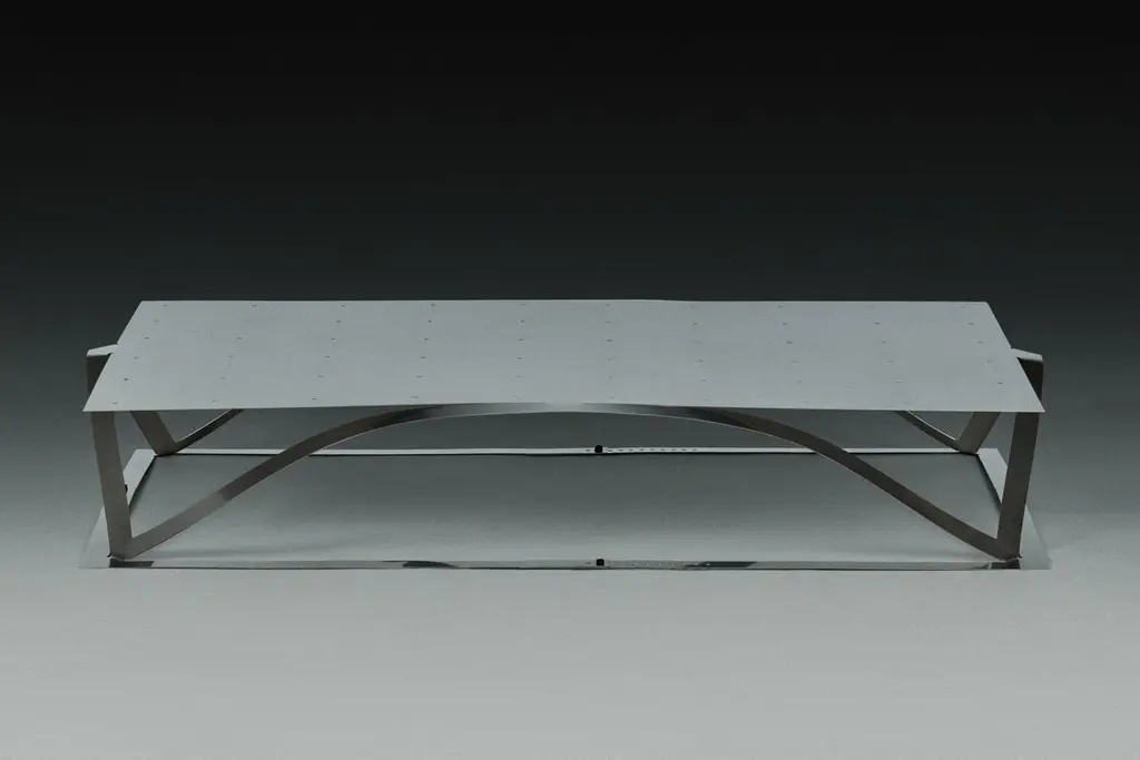 Folio Coffee Table by Kutarq StudioMaterials: Stainless steel.Dimensions: D 99 x W 22 x H 23 cmThe FOLIO coffee table explores the physical properties of steel, taking on the visual appearance of bent paper.Planar laser-cuts render a 2D sheet of metal into 3D tensioned and transformed functional furnishing elements.The sculptural design is adaptable, owing entirely to the innate material properties it harness and accentuates. Depending on the position of the screws, the height of the tabletop can be adjusted. When the piece is not assembled, it's totally flat, and material waste is reduced to the minimum during the production.Leading KUTARQ studio, architect and designer Jordi López Aguiló designs lighting, objects and furniture with a unique and pragmatic perspective. Each project involves a methodical process that emphasizes both material and research. With the constant challenge of revealing the "soul" behind his objects, he offers their users not just an aesthetic piece but rather a design with personality and a life of its own. After spending time abroad collaborating with prestigious architecture firms in Paris and Copenhagen, he settled down in his home town Valencia where he's been leading his own studio since 2012. His work has been exhibited internationally, including at Milan Design Week, Frankfurt Light & Building, Neocon Chicago, Tokyo Design Week, Stockholm Furniture Fair, Paris Maison & Objet and Seoul Living Design Fair.