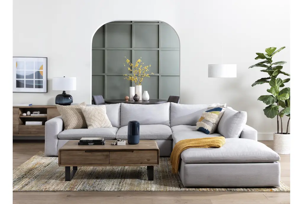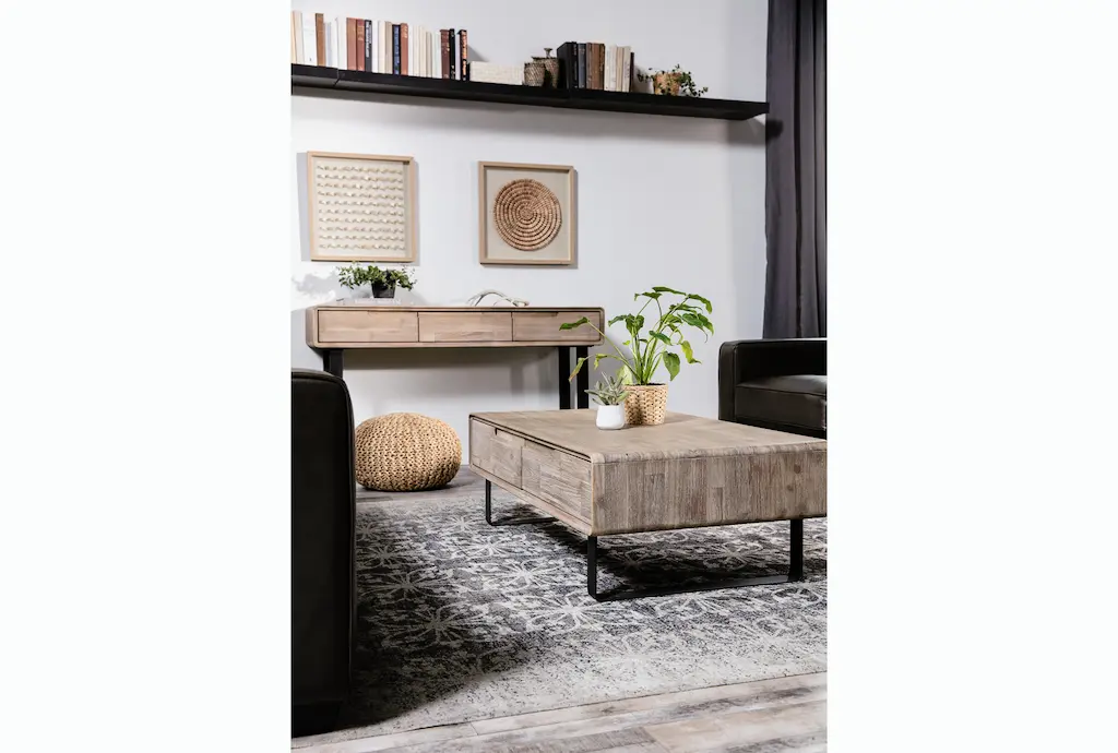 Give your living room a fresh, edgy vibe with our ultra-sleek Forma cocktail table. A master of minimalism, it makes clean lines look cooler than ever. Airy metal legs provide a striking, sturdy foundation for solid acacia, which is decked in an on-trend grey finish. The design also features four drawers - two on each side - for seamless storage. Shop coffee tables like this one and find the perfect design for your space.