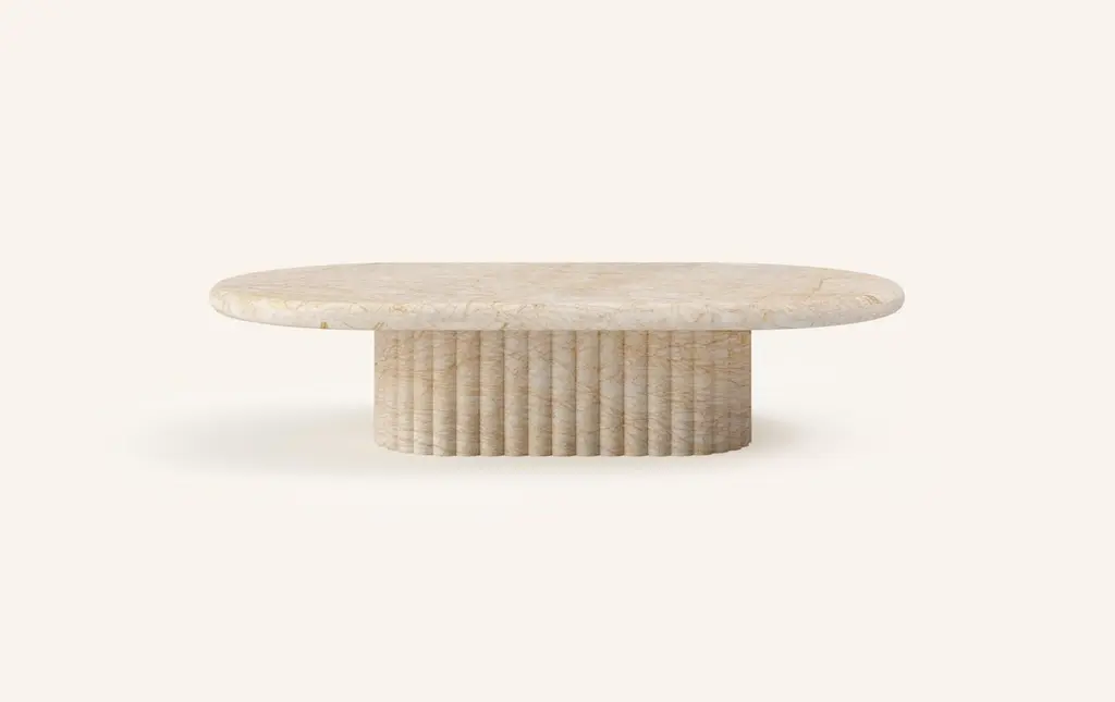 OUR MOST COVETED COLLECTION AND MODERN TWIST ON AN ANCIENT ROMAN CLASSIC. RECENTLY REFRESHED WITH A MORE PLAYFUL AND ROBUST PROFILE.60”L x 36”W x 14”H: - 2.25" THICK TABLE TOP- 33”L x 15”W FLUTED BASE WITH 2" FLUTES- 24.5”L x 6.25”W CUTOUT IN TABLE TOP WITH 24.25”L x 6”W INTERLOCK ON BASE CONSTRUCTION:TABLE TOP: - 3/4”x 3 SLABS WITH FULL BULLNOSE- HOLE IN TABLE TOP INTERLOCKS WITH BASE OF TABLEBASE:- HOLLOW CONSTRUCTION USING 3/4” STONE SLAB- FELT LINING TO BOTTOM OF BASE FOR FLOOR PROTECTION- STONE FINISH TO TOP OF BASEWEIGHT:60”L x 36”W x 14”H:- GROSS WEIGHT INCLUDING WOOD CRATE 685LBS