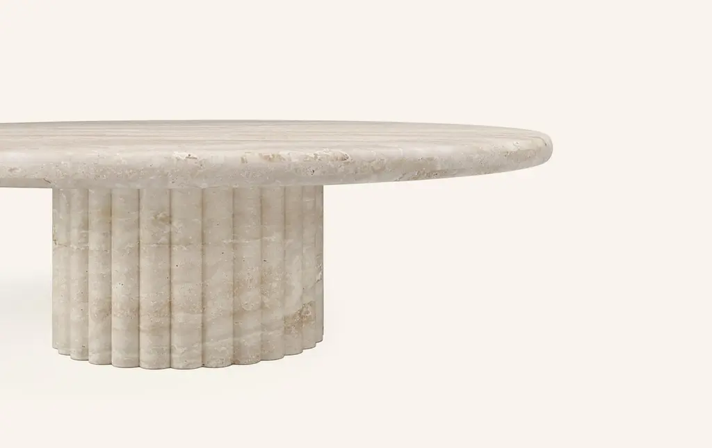OUR MOST COVETED COLLECTION AND MODERN TWIST ON AN ANCIENT ROMAN CLASSIC. RECENTLY REFRESHED WITH A MORE PLAYFUL AND ROBUST PROFILE.DIMENSIONS:48”L x 48”W x 14”H: - 2.25" THICK TABLE TOP- 18"Ø FLUTED BASE WITH 2" FLUTES- 6.25"Ø CUTOUT IN TABLE TOP WITH CONSTRUCTION:TABLE TOP: - 3/4”x 3 SLABS WITH FULL BULLNOSE- HOLE IN TABLE TOP INTERLOCKS WITH BASE OF TABLEBASE:- HOLLOW CONSTRUCTION USING 3/4” STONE SLAB- FELT LINING TO BOTTOM OF BASE FOR FLOOR PROTECTION- STONE FINISH TO TOP OF BASEWEIGHT:48”L x 48”W x 14”H: - GROSS WEIGHT INCLUDING WOOD CRATE 650LBS