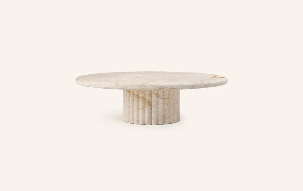 OUR MOST COVETED COLLECTION AND MODERN TWIST ON AN ANCIENT ROMAN CLASSIC. RECENTLY REFRESHED WITH A MORE PLAYFUL AND ROBUST PROFILE.DIMENSIONS:54”L x 54”W x 14”H: - 2.25" THICK TABLE TOP- 20"Ø FLUTED BASE WITH 2" FLUTES- 6.25"Ø CUTOUT IN TABLE TOP WITH CONSTRUCTION:TABLE TOP: - 3/4”x 3 SLABS WITH FULL BULLNOSE- HOLE IN TABLE TOP INTERLOCKS WITH BASE OF TABLEBASE:- HOLLOW CONSTRUCTION USING 3/4” STONE SLAB- FELT LINING TO BOTTOM OF BASE FOR FLOOR PROTECTION- STONE FINISH TO TOP OF BASEWEIGHT:54”L x 54”W x 14”H: - GROSS WEIGHT INCLUDING WOOD CRATE 827LBS