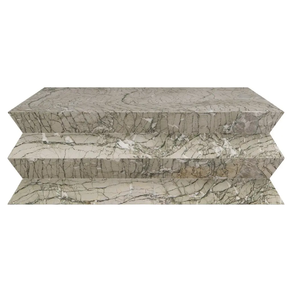 A BOLD AND EXPRESSIVE FORM WHERE GEOMETRY AND HARMONY COLLIDE. ITALIAN FOR WRINKLE, 'GRINZA'S ZIG-ZAG STRUCTURE' IS BOTH TIMELESS AND ELEGANT. DIMENSIONS:42”L x 42”W x 16”H: - WRINKLED BASE WITH 4" FOLDSCONSTRUCTION:- 3/4" THICK TOP & BASE- HOLLOW CONSTRUCTION USING 3/4” STONE SLAB- FELT LINING TO BOTTOM OF BASE FOR FLOOR PROTECTIONWEIGHT:42”L x 42”W x 16”H: - GROSS WEIGHT INCLUDING WOOD CRATE 533LBS