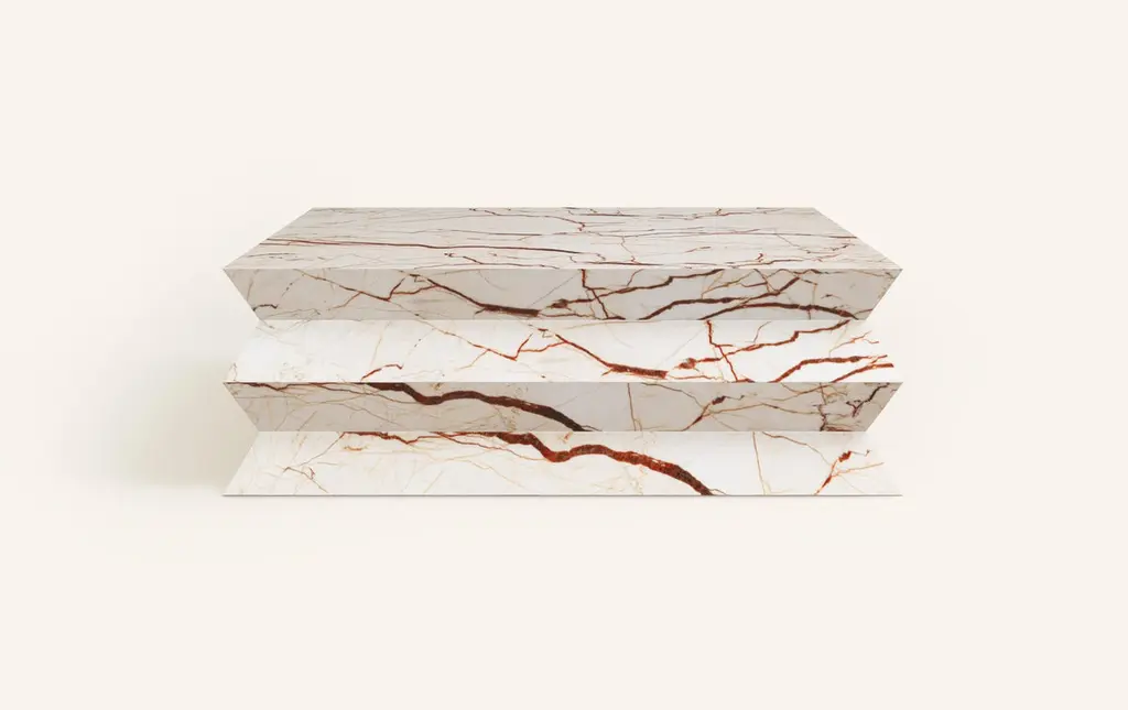 A BOLD AND EXPRESSIVE FORM WHERE GEOMETRY AND HARMONY COLLIDE. ITALIAN FOR WRINKLE, 'GRINZA'S ZIG-ZAG STRUCTURE' IS BOTH TIMELESS AND ELEGANT. DIMENSIONS:48”L x 48”W x 16”H: - WRINKLED BASE WITH 4" FOLDSCONSTRUCTION:- 3/4" THICK TOP & BASE- HOLLOW CONSTRUCTION USING 3/4” STONE SLAB- FELT LINING TO BOTTOM OF BASE FOR FLOOR PROTECTIONWEIGHT:48”L x 48”W x 16”H: - GROSS WEIGHT INCLUDING WOOD CRATE 642LBS