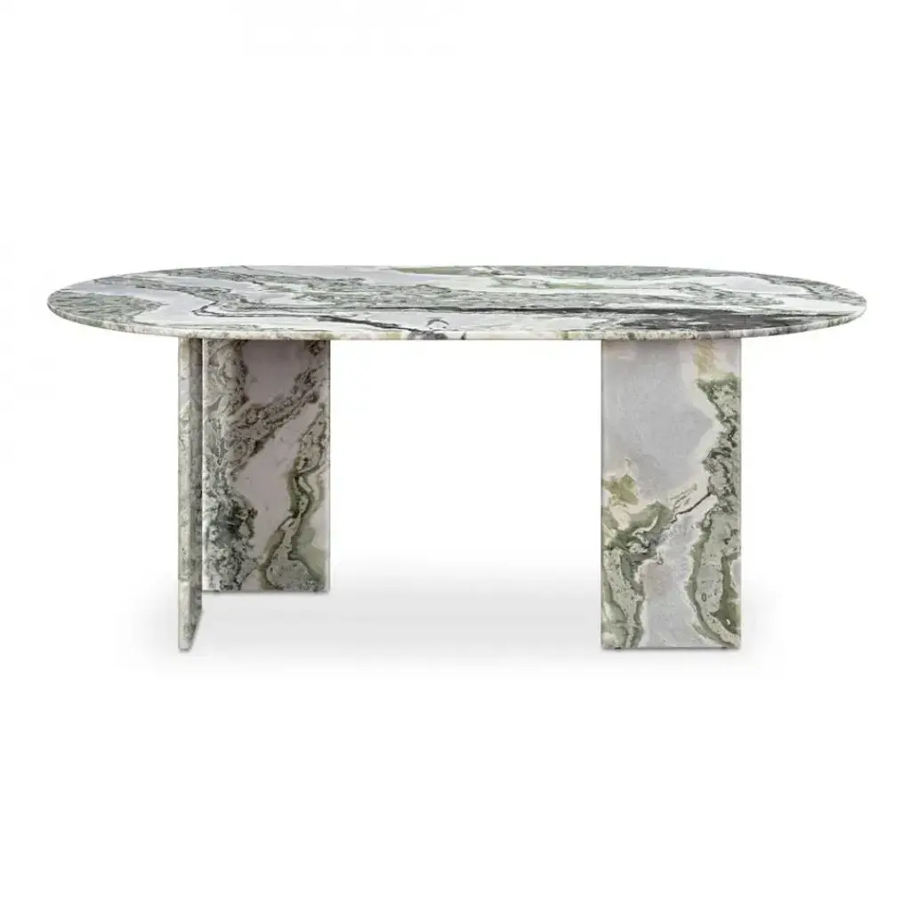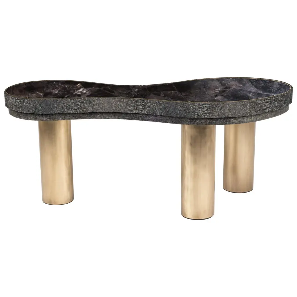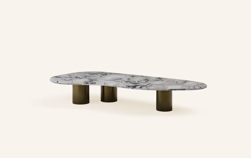 ‘LAGO’, ITALIAN FOR ‘LAKE’, HAS INSPIRED A FORM DERIVED FROM NATURE, TEXTURED WITH LUXURIOUS STONES AND METALS. THE COLLECTION ENCOURAGES NESTING AND LAYERING IN ITS AVAILABLE FORMS.DIMENSIONS: 60”L x 30”W x 12”H: - 3 x 6"Ø ROUND BASE- 3 x 7”Ø CUTOUT ON UNDERSIDE OF TABLE TOPCONSTRUCTION:TABLE TOP: - 3/4”x 2 SLABS WITH FULL BULLNOSE EDGE- HOLE(S) IN TABLE TOP INTERLOCKS WITH BASE OF TABLEBASE:- SOLID STONE CONSTRUCTION OR 304 STAINLESS STEEL WITH ANTIQUE BRONZE FINISH- FELT LINING TO BOTTOM OF BASE FOR FLOOR PROTECTIONWEIGHT:60”L x 30”W x 12”H WITH ANTIQUE BRONZE LEGS: - GROSS WEIGHT INCLUDING WOOD CRATE 428LBS