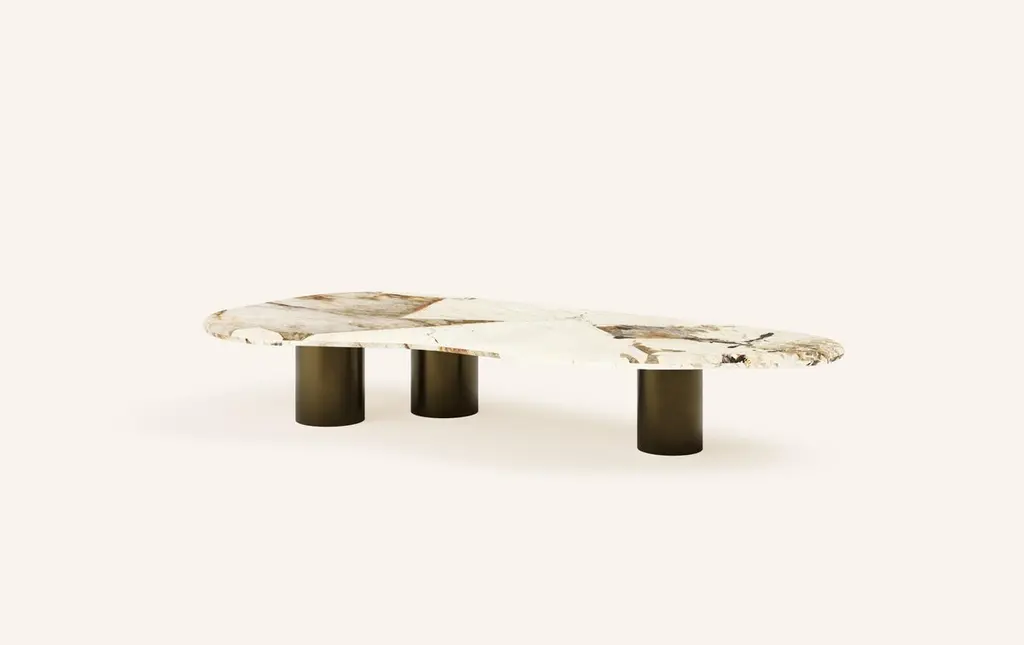 ‘LAGO’, ITALIAN FOR ‘LAKE’, HAS INSPIRED A FORM DERIVED FROM NATURE, TEXTURED WITH LUXURIOUS STONES AND METALS. THE COLLECTION ENCOURAGES NESTING AND LAYERING IN ITS AVAILABLE FORMS.DIMENSIONS: 60”L x 30”W x 12”H: - 3 x 6"Ø ROUND BASE- 3 x 7”Ø CUTOUT ON UNDERSIDE OF TABLE TOPCONSTRUCTION:TABLE TOP: - 3/4”x 2 SLABS WITH FULL BULLNOSE EDGE- HOLE(S) IN TABLE TOP INTERLOCKS WITH BASE OF TABLEBASE:- SOLID STONE CONSTRUCTION OR 304 STAINLESS STEEL WITH ANTIQUE BRONZE FINISH- FELT LINING TO BOTTOM OF BASE FOR FLOOR PROTECTIONWEIGHT:60”L x 30”W x 12”H WITH ANTIQUE BRONZE LEGS: - GROSS WEIGHT INCLUDING WOOD CRATE 428LBS