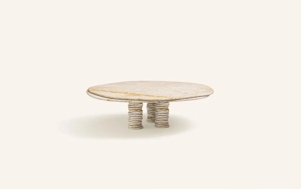 'ONDA', ITALIAN FOR 'WAVE', HAS INSPIRED A FREEFORM ORGANIC BODY, HEROING A COMPLEX AND TEXTURED COLLECTION. COMPRISING SIDE TABLES FOR LAYERING, COFFEE TABLES AND DINING TABLES.DIMENSIONS:54”L x 54”W x 14”H: - 1.5" THICK TABLE TOP- 4 x 6"Ø 3/4" FREEFORM ROUND STAGGERED STACKEDSLAB LEGS- 1.5”Ø CUTOUT IN TABLE TOP WITH 1.25”Ø INTERLOCK ON BASECONSTRUCTION:TABLE TOP: - 3/4”x 2 LAMINATED SLABS WITH FULL BULLNOSE- HOLE IN TABLE TOP INTERLOCKS WITH BASE OF TABLEBASE:- SOLID CONSTRUCTION USING 3/4” STONE SLAB(S) STACKED- FELT LINING TO BOTTOM OF BASE FOR FLOOR PROTECTION- STONE FINISH TO TOP OF BASEWEIGHT:54”L x 54”W x 14”H: - GROSS WEIGHT INCLUDING WOOD CRATE 664LBS